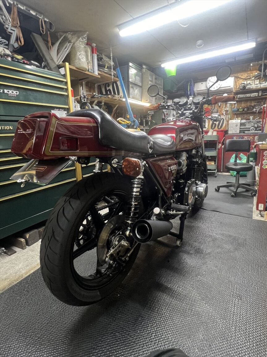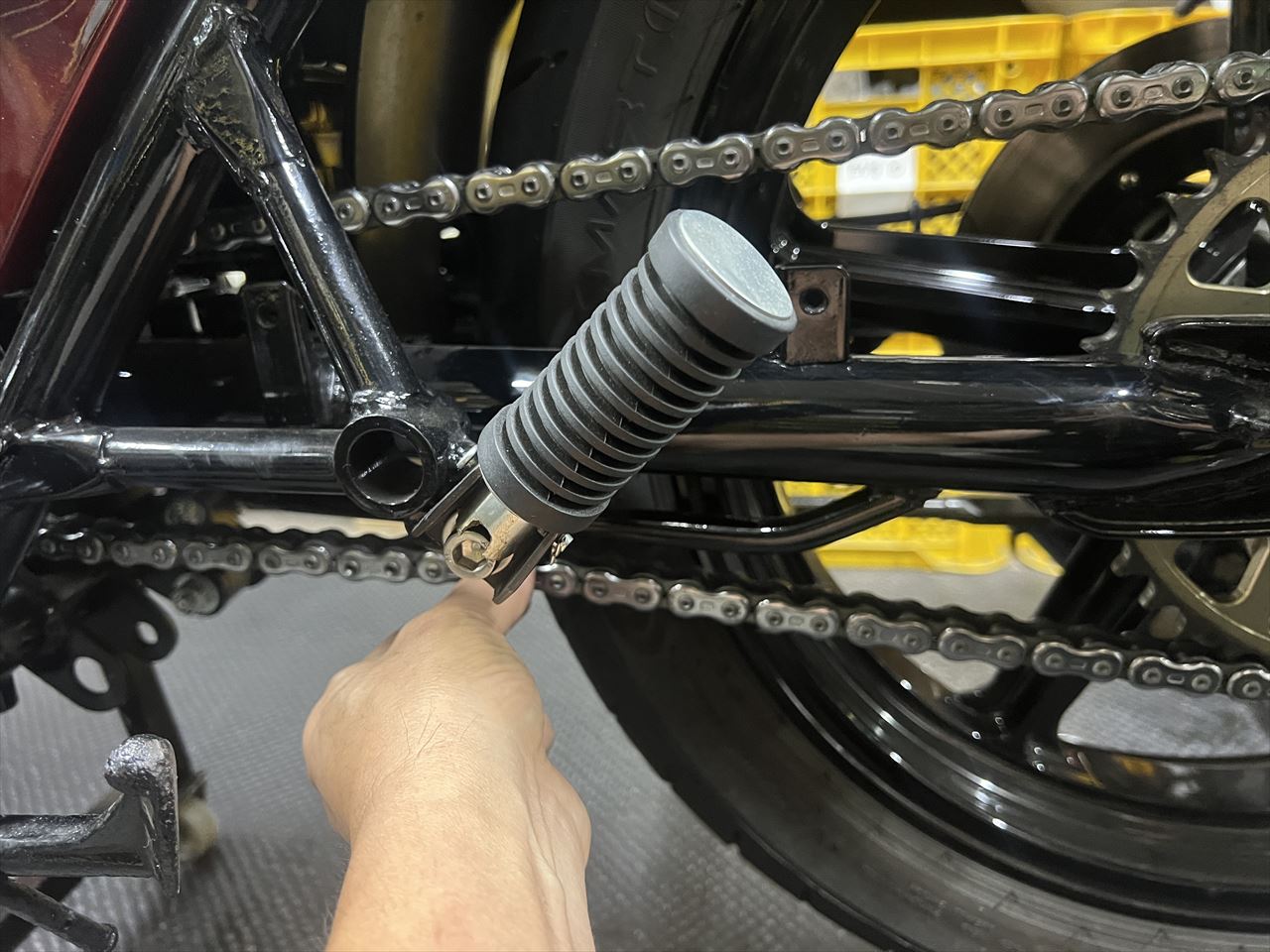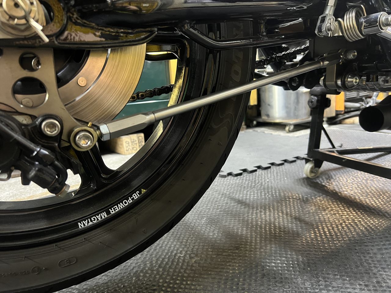 いよいよ大詰めです。ここでチェーンの張りをチェックします。この車両の場合、スイングアーム下側に補強バーがあるので、チェーンがバタつくと干渉し易いと思いますが、チェーンを張り過ぎるのはベアリング破損などの重大なトラブルに繋がるので注意しなければいけません。