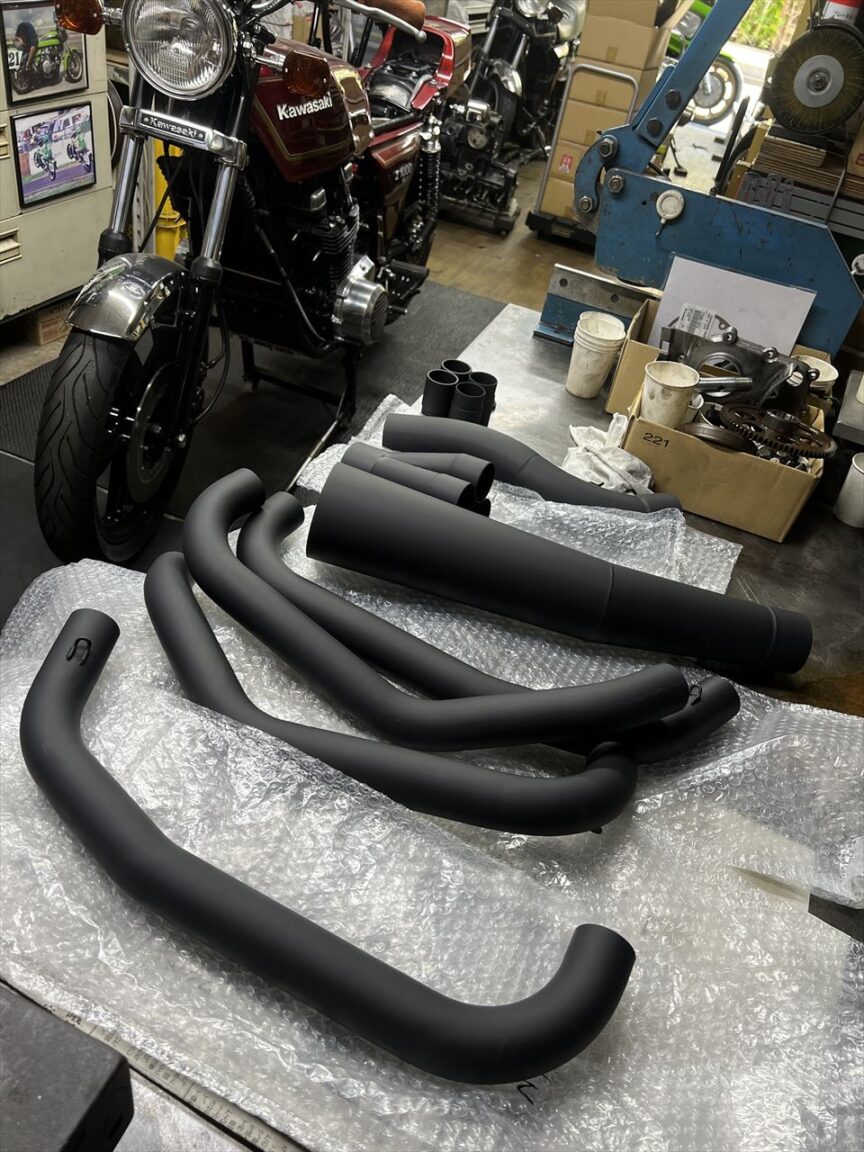 続いてマフラーです。BLファクトリー製カワサキワークスタイプ アップ ロング 仕様の新品に耐熱セラコートしたものが塗装屋さんから戻ってきました。