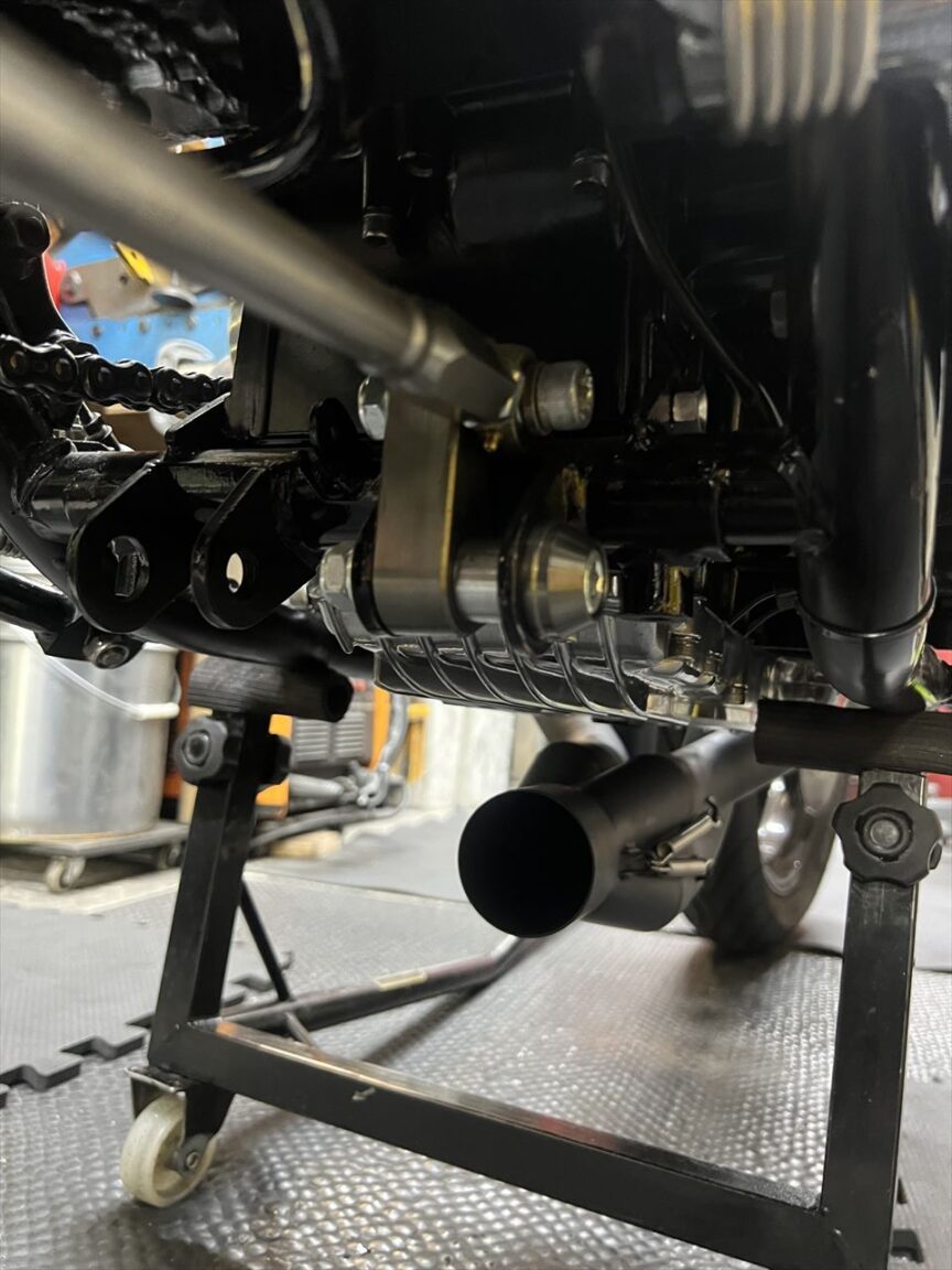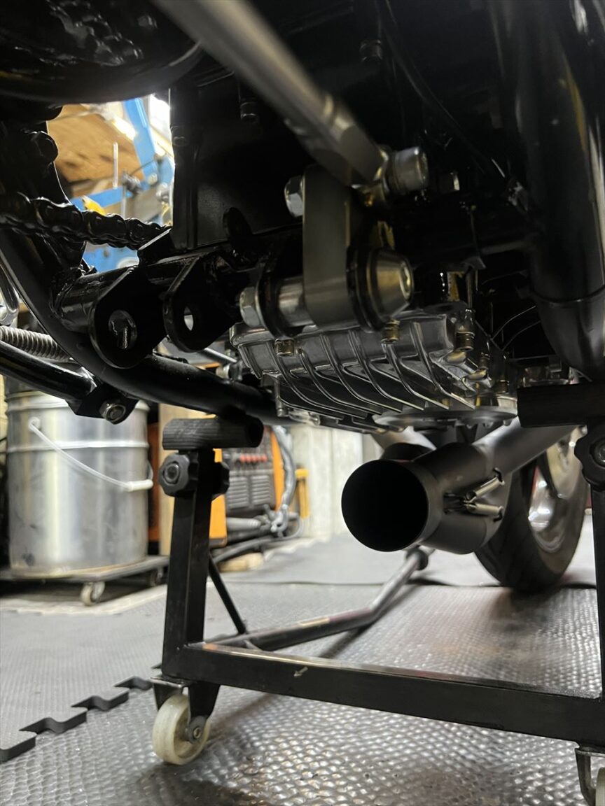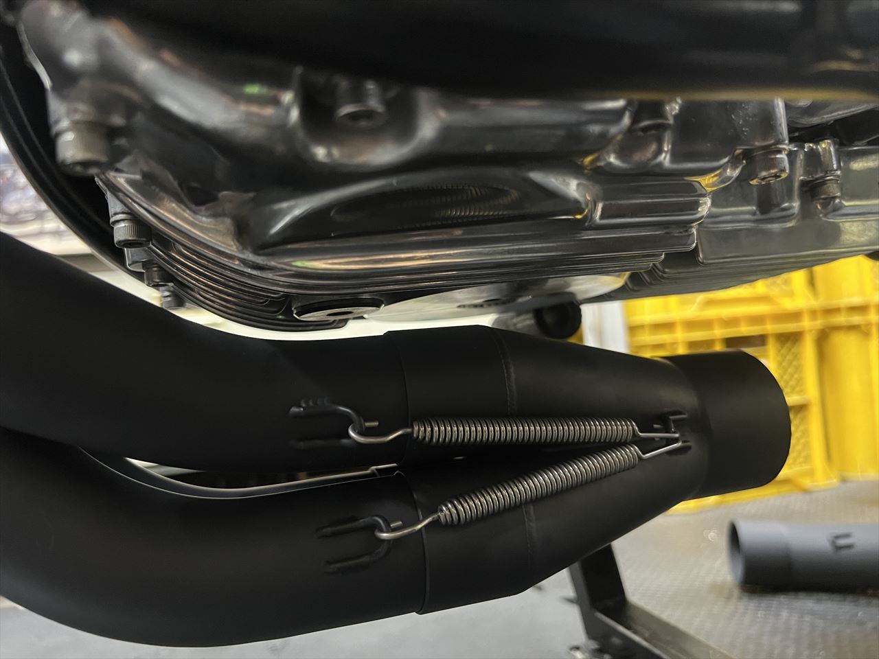マフラーパイプはオイルフィルターカバーと干渉するので、フラットタイプに変更します。