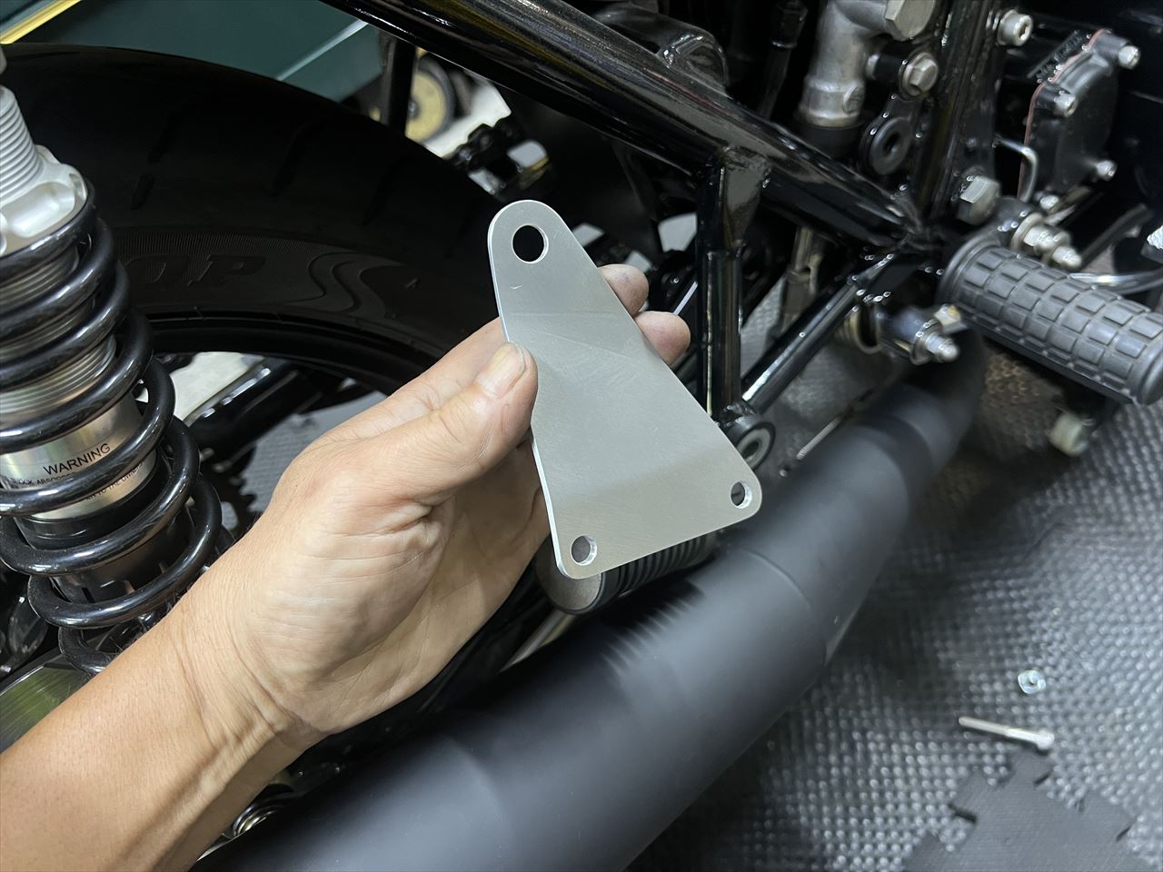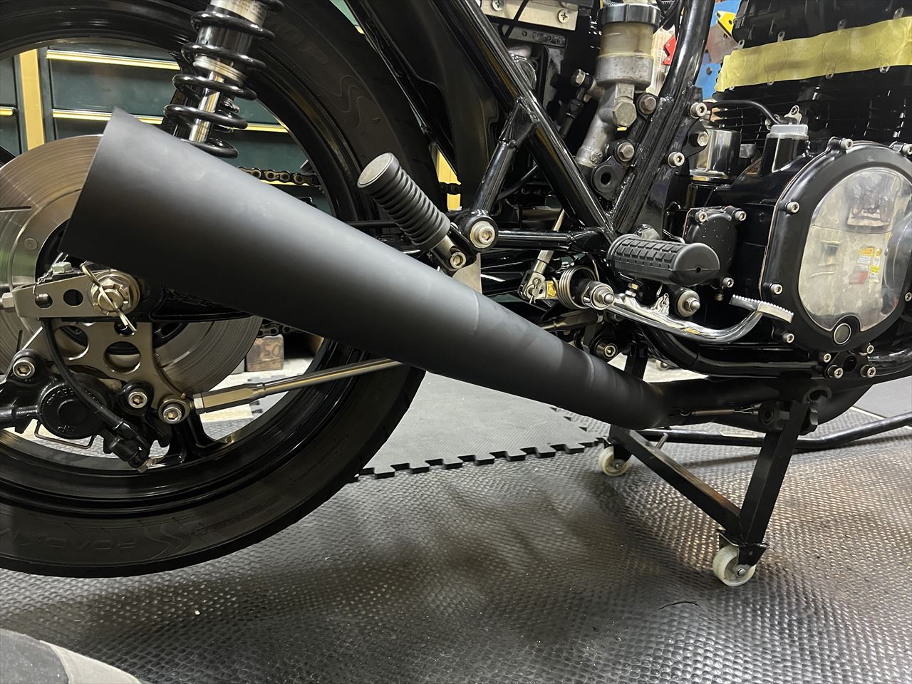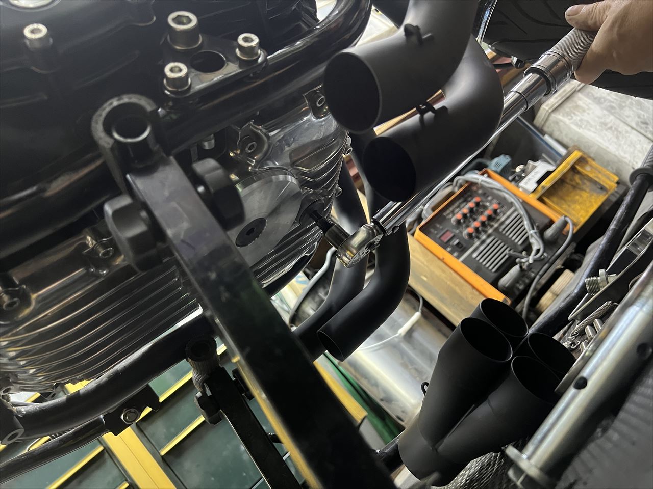 マフラーパイプはオイルフィルターカバーと干渉するので、フラットタイプに変更します。