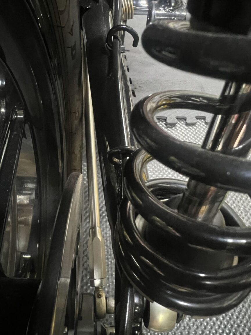 チェーンを適正な張りにしてからリヤショックを復元すると、スイングアームの垂れ量に応じてチェーンは弛みますが、この車両の場合は絶対にこれ以上張ってはいけません。