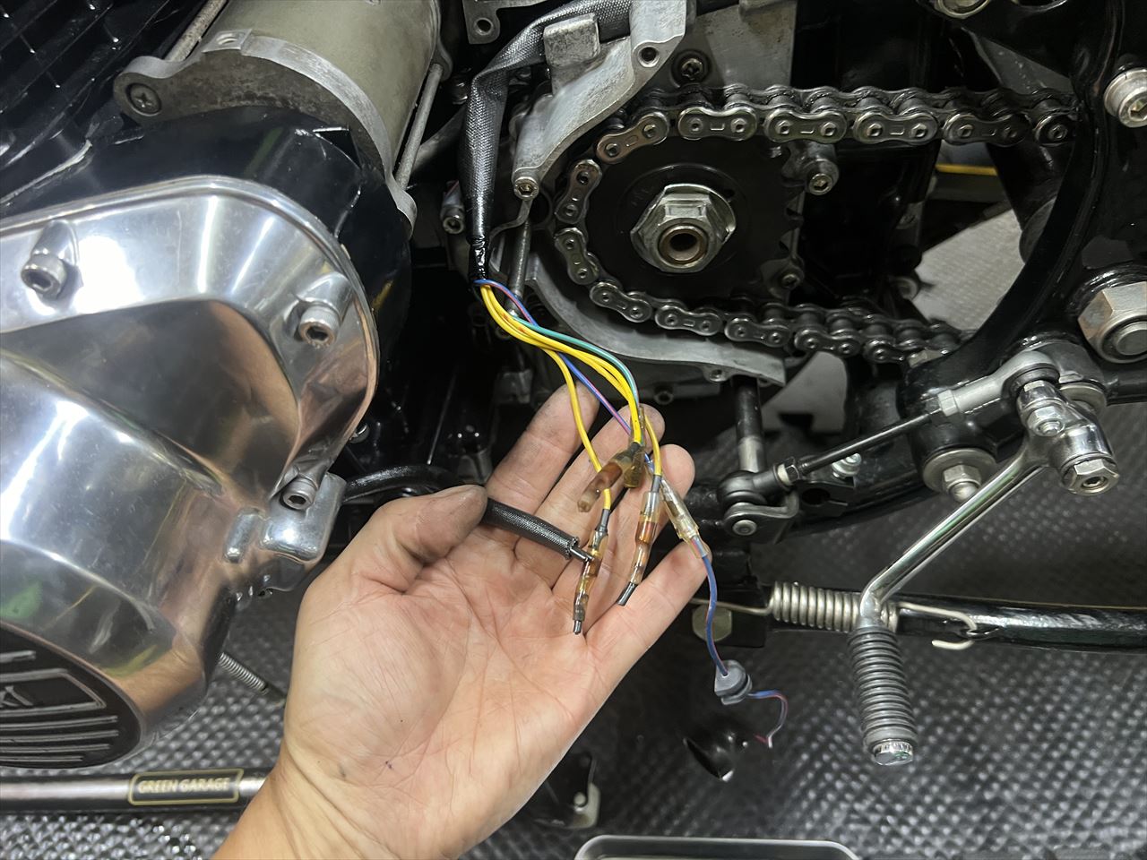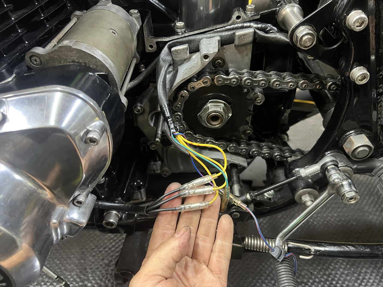 配線をまとめます。スプロケカバーに挟み込まないよう、スターターケーブルとジェネレーターハーネスは、このように固縛しておくといいでしょう。
