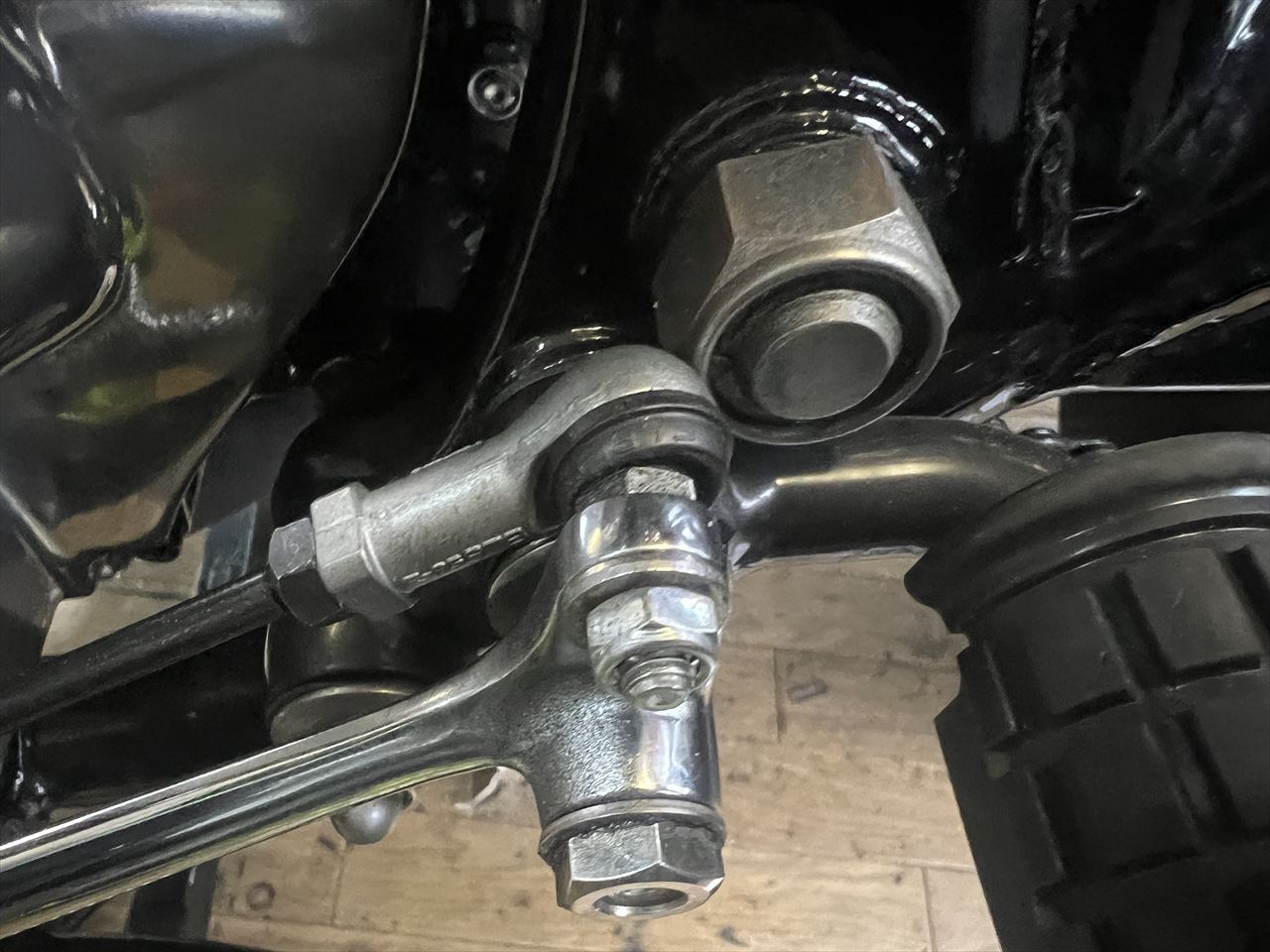 走りだして直ぐにトラブル発生。2速にシフトアップできません。ガレージに戻って点検すると、ロッドエンドがピボットシャフトのナットと干渉するようです。