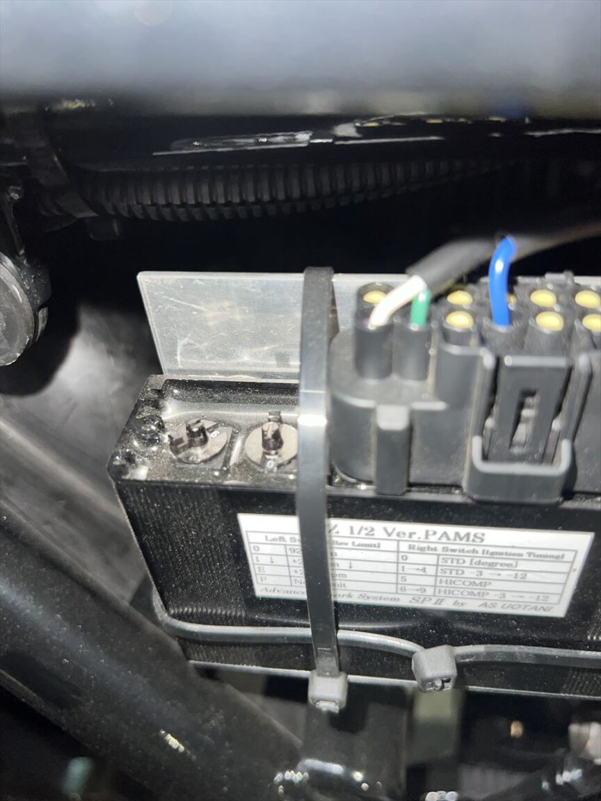 スロットル開度を大きくするとノッキングが発生します。点火系はPAMSのウオタニSP2が付いているので、点火時期調整ダイヤルを変更します。元はゼロでいたが、ハイコンプ仕様の5番にします。