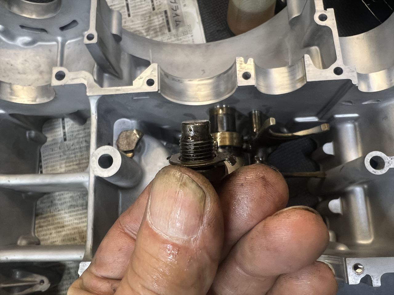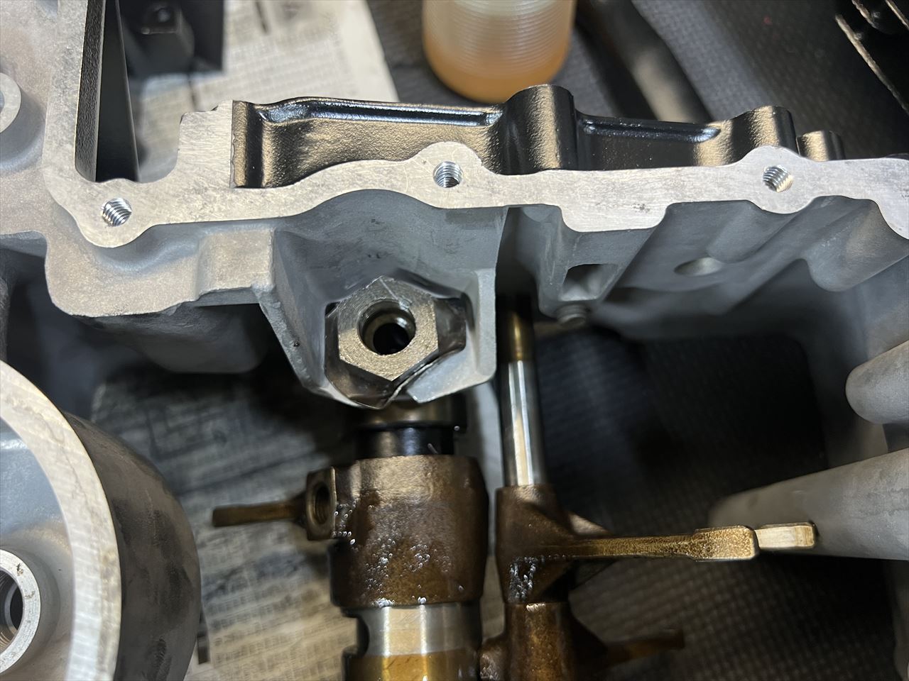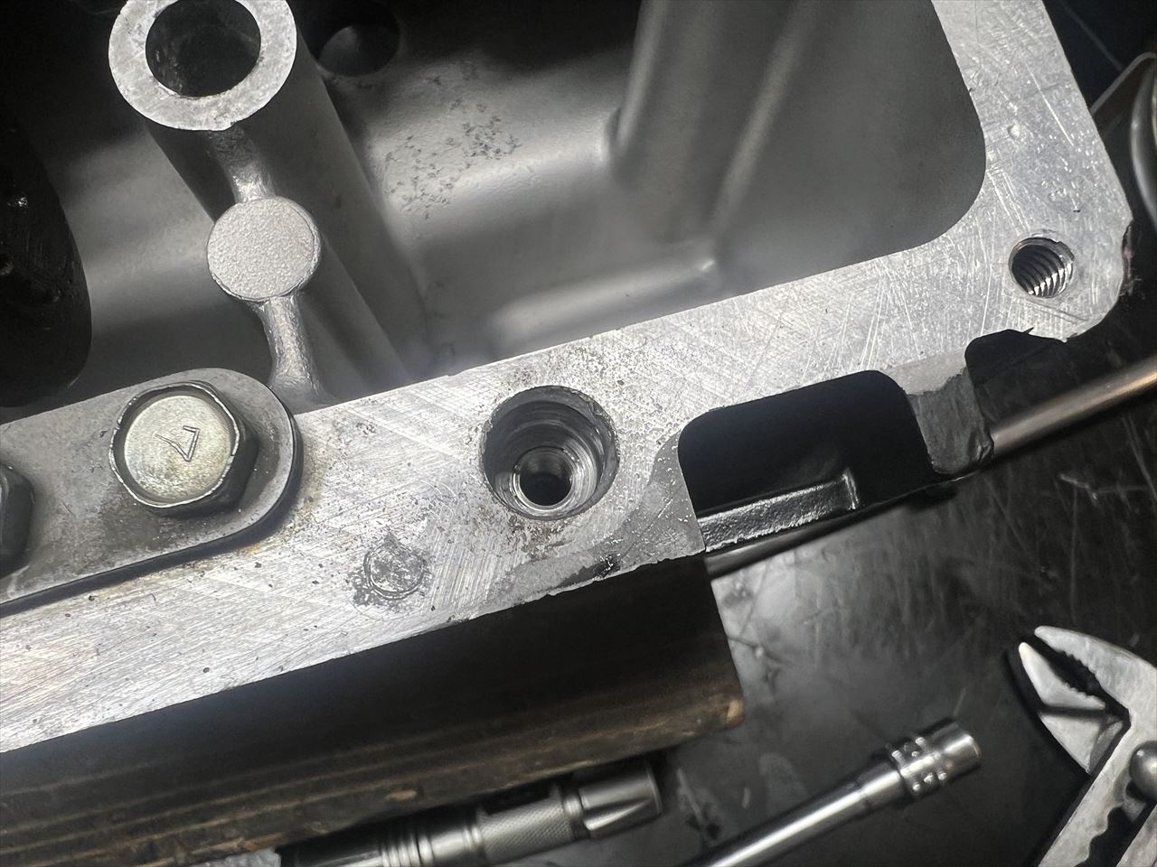 一旦はロアーケースを取り付けたのですが、ここのボルトに違和感があったので再度分解。チェックするとネジ穴口元のネジが数段舐めてなくなっていました。ノックピンの奥だったので見落としていました。ヘリサートタップを立て、ヘリサートで修復します。