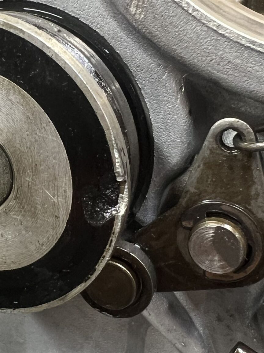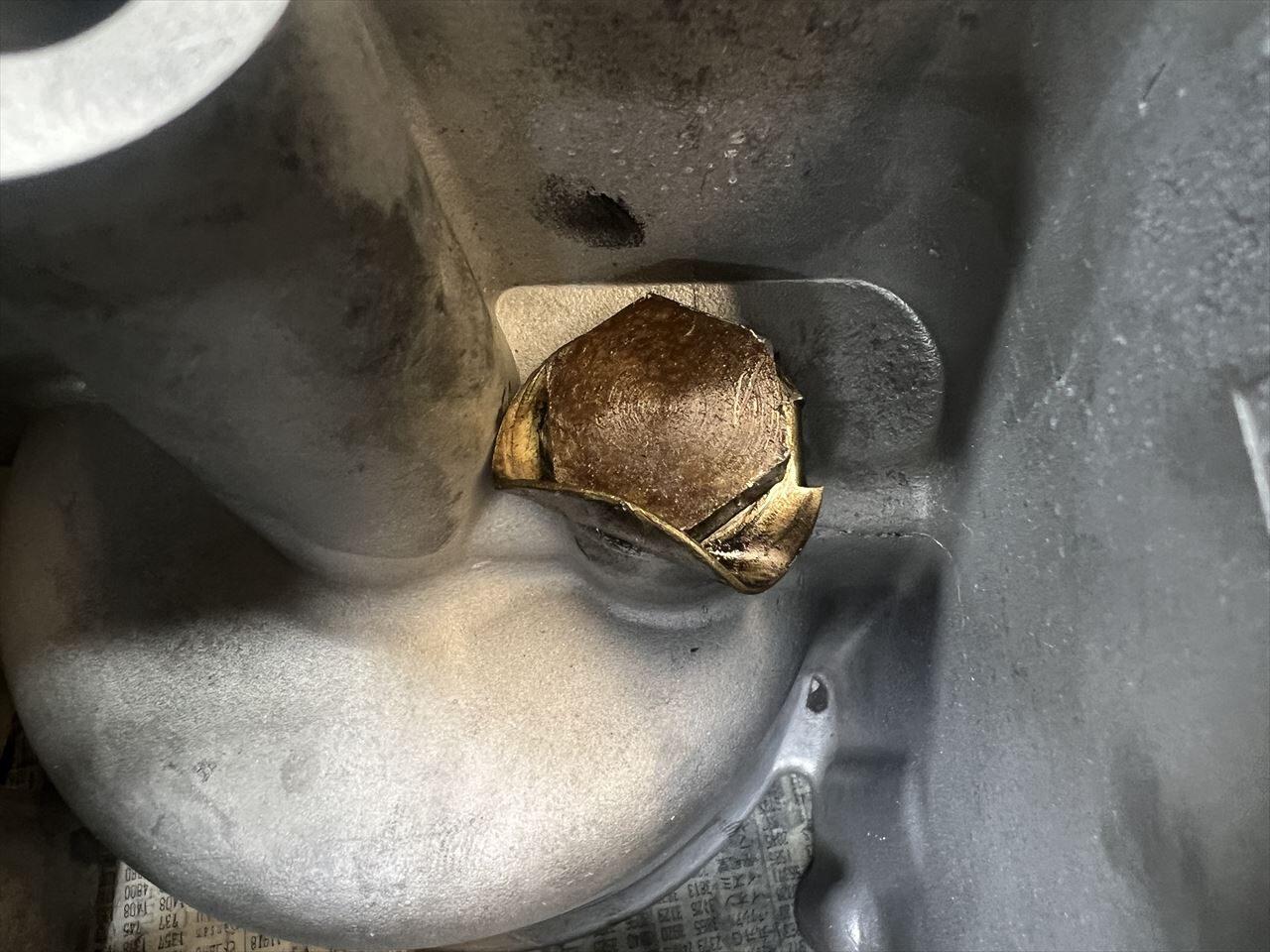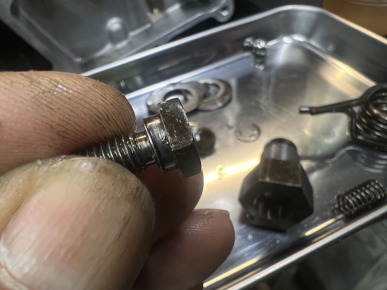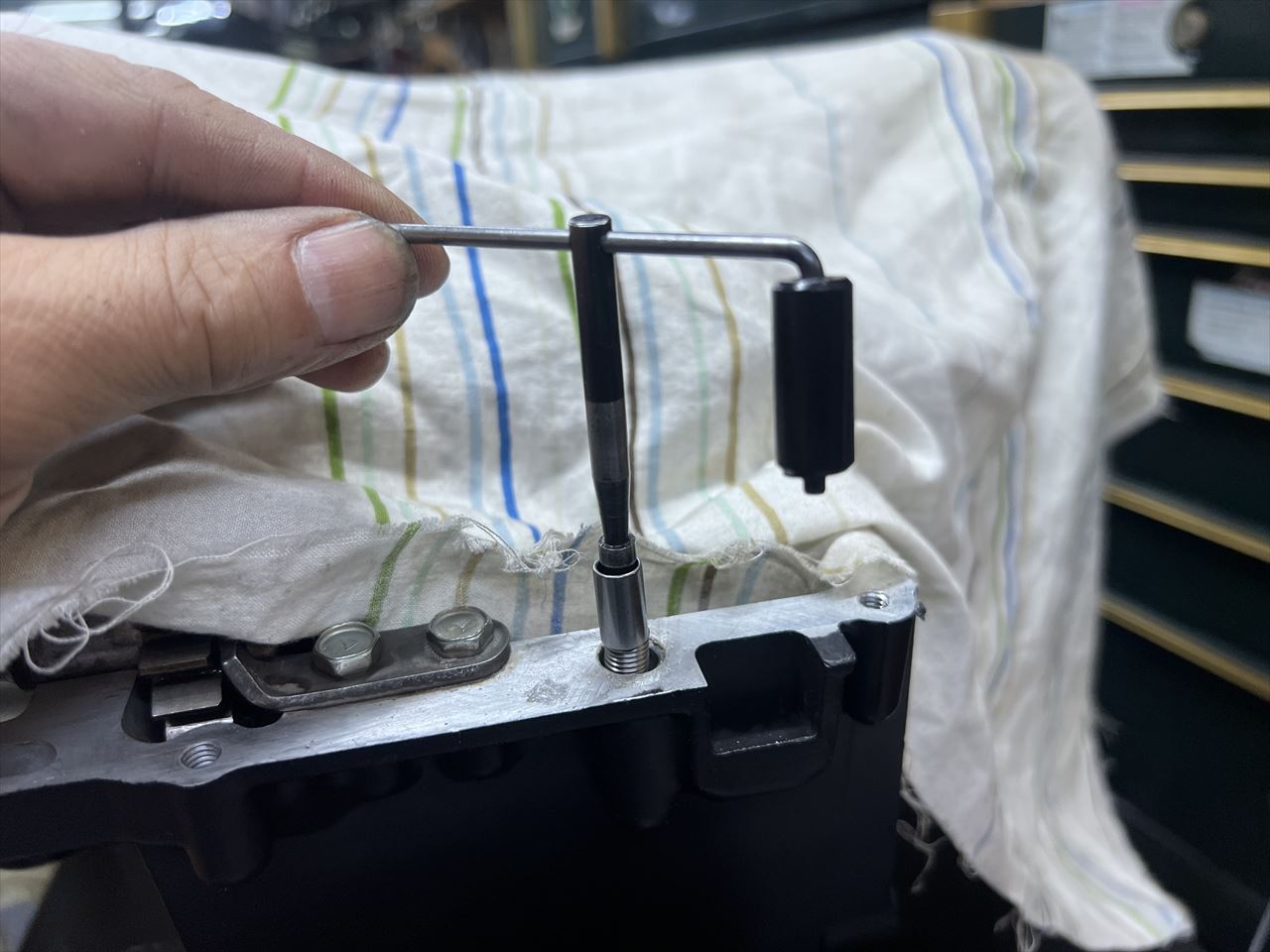 一旦はロアーケースを取り付けたのですが、ここのボルトに違和感があったので再度分解。チェックするとネジ穴口元のネジが数段舐めてなくなっていました。ノックピンの奥だったので見落としていました。ヘリサートタップを立て、ヘリサートで修復します。