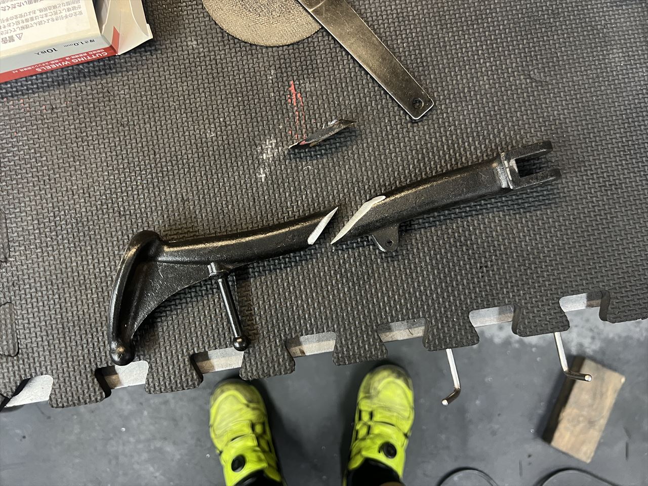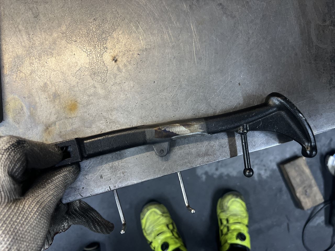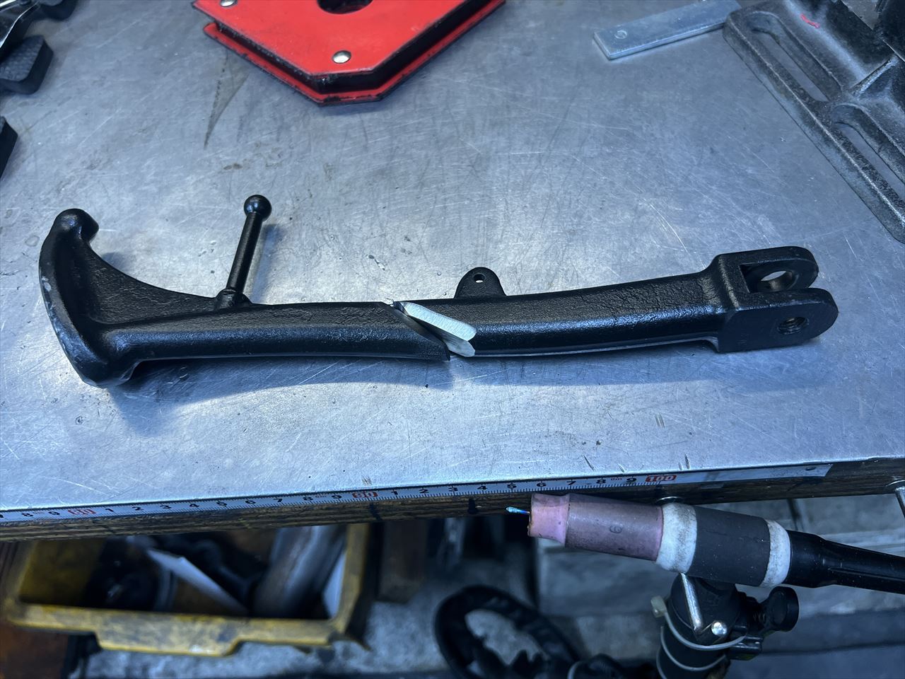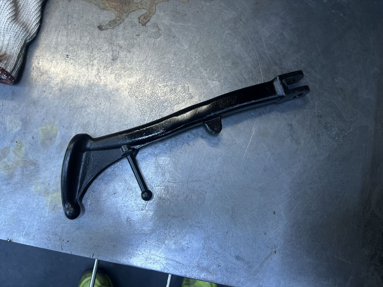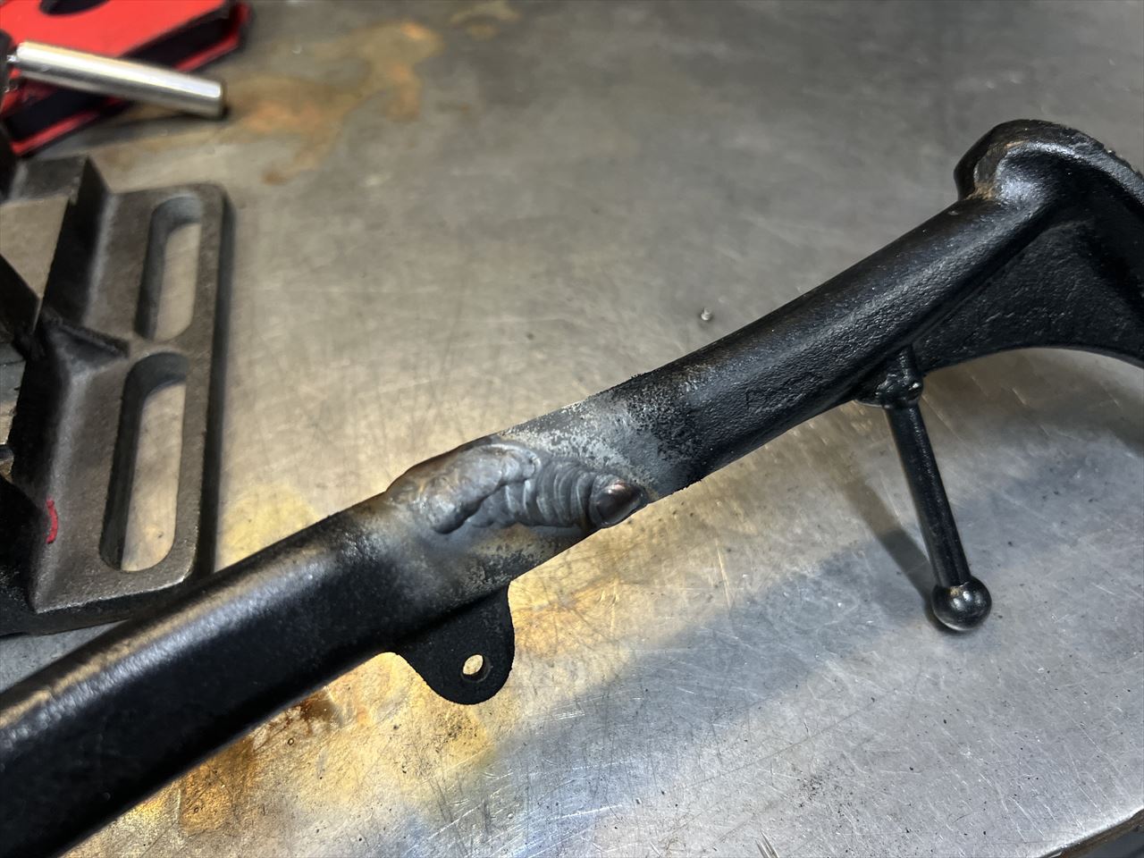 サイドスタンドでの角度が浅く、かなり立ち気味で右側に転倒し易い状態とのことなので修正します。