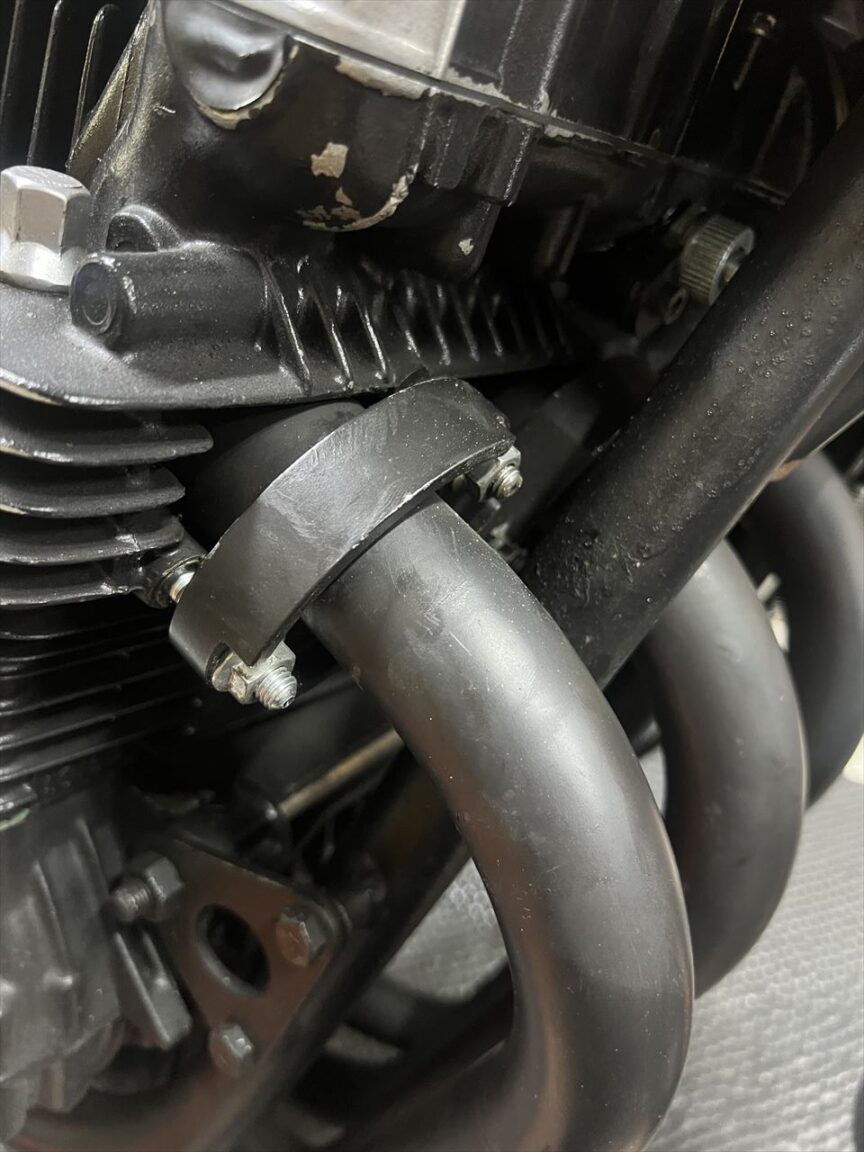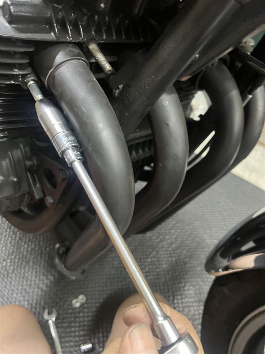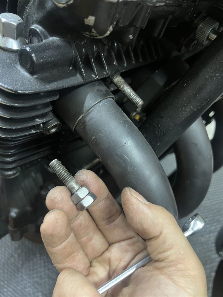 合わせてマフラーのスタッドボルトも修正します。一番右側の一本が短いようです。ナットのかかりが浅いですね。