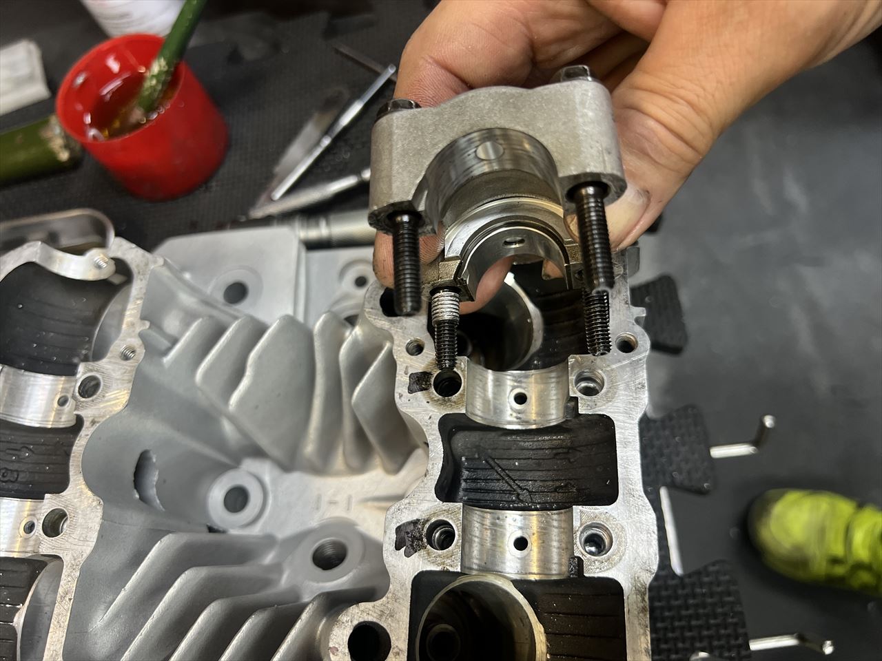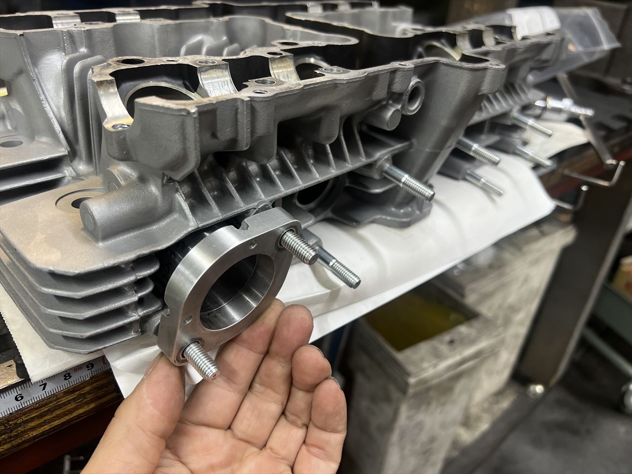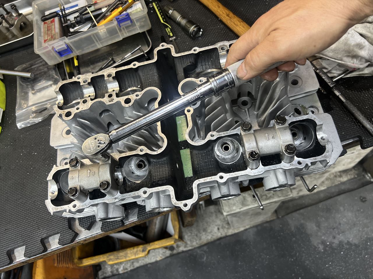 ヘッドの準備をします。カムホルダーネジのトルクがかからないところが数か所あるので、16ヶ所全てをヘリサート加工します。