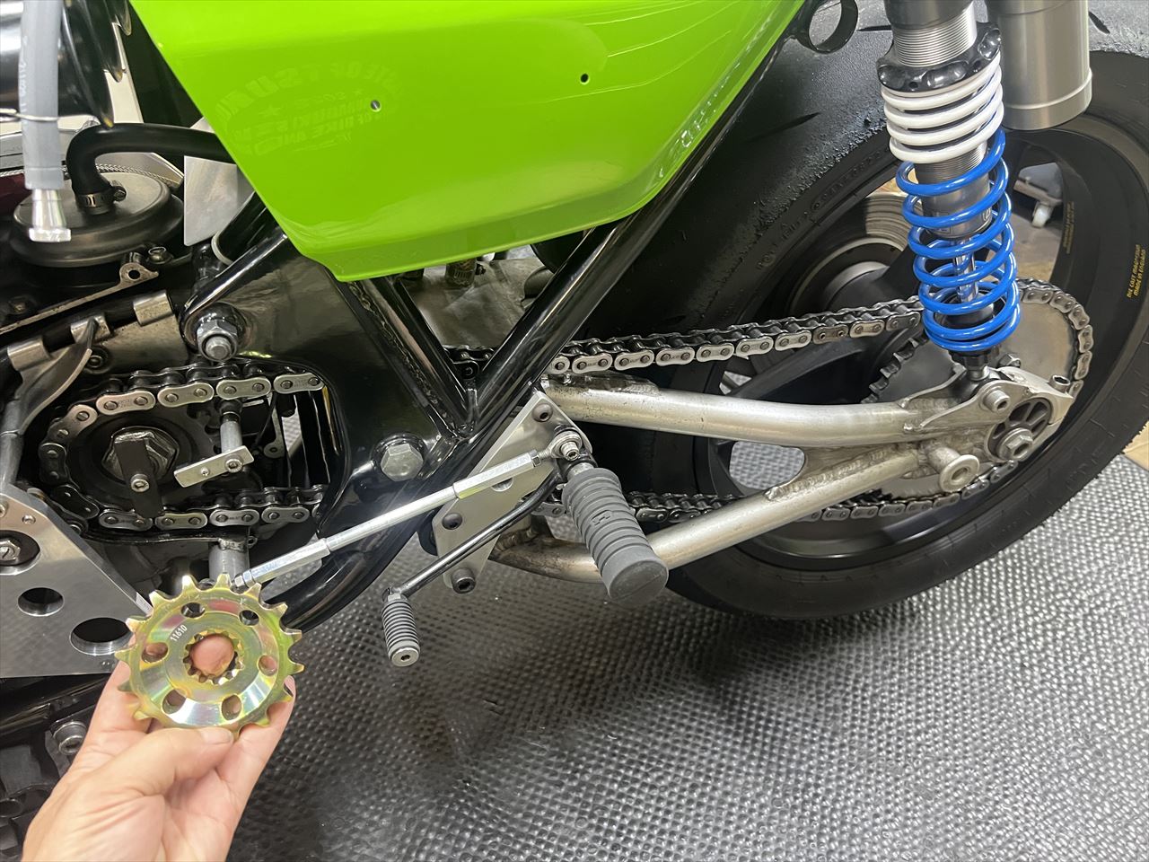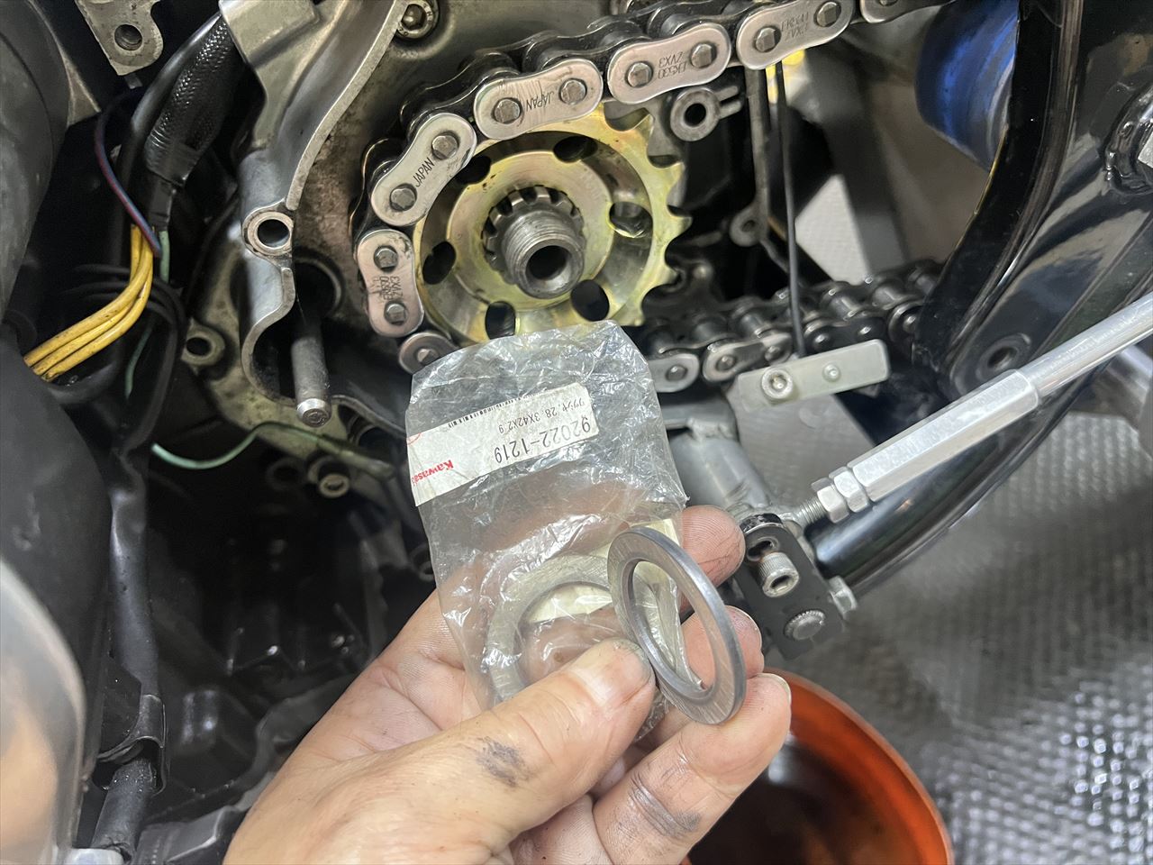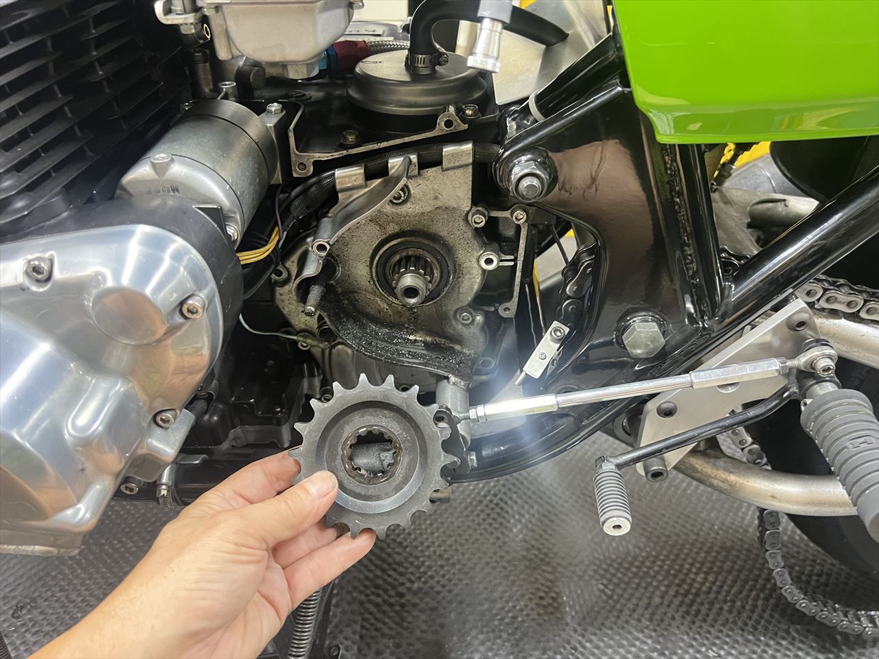 フロントスプロケを外します。現状はサンスター製のJ系用でラインナップは18Tのみ。スプライン部分の厚みが純正同等に厚く、スプラインへの攻撃性が低いのでよく使っている物です。