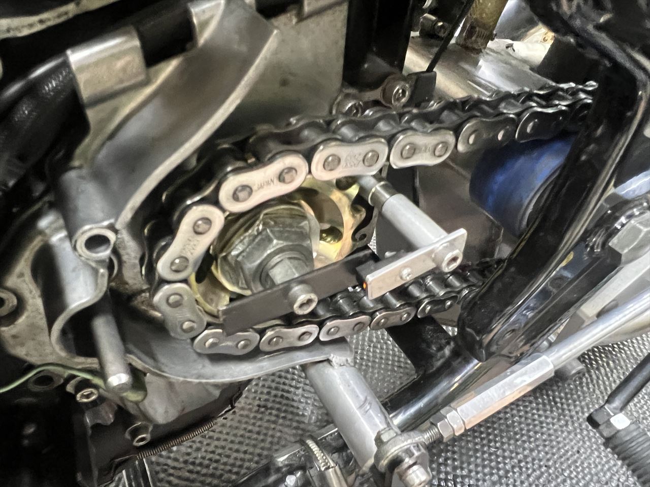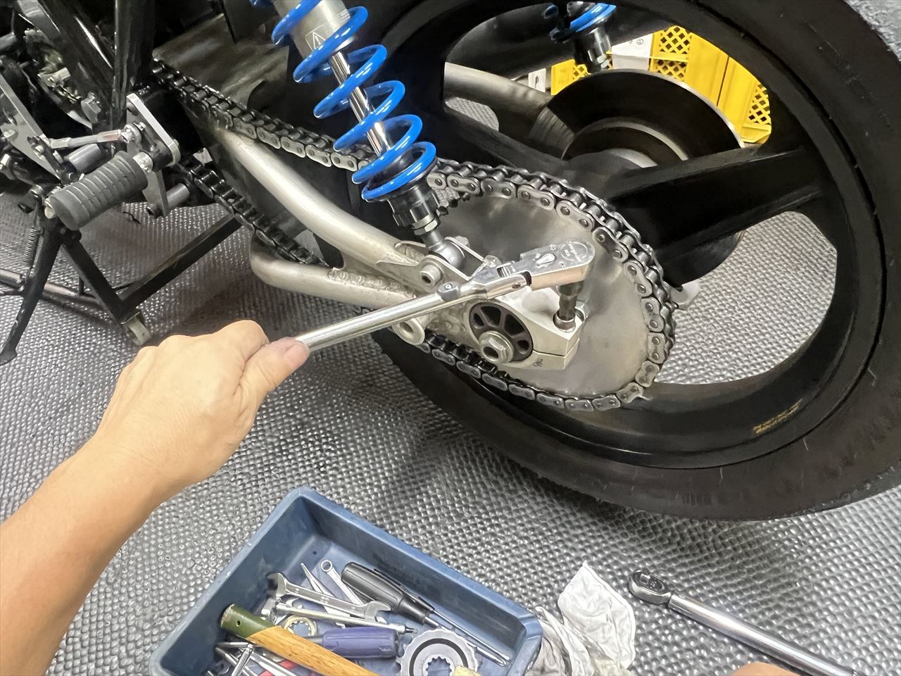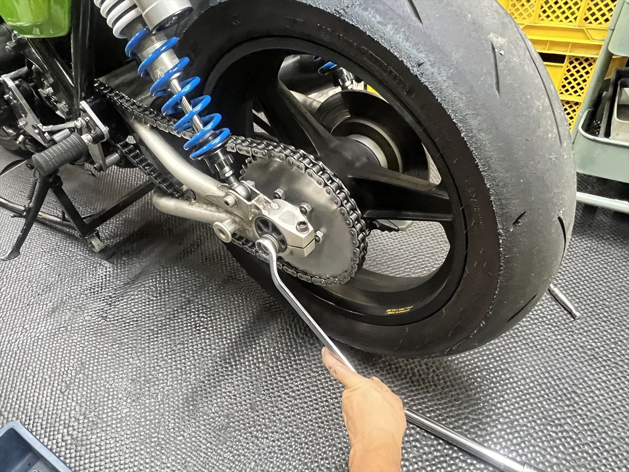 チェーンの張り調整後はこちら。リヤアクスルの位置は後ろ過ぎないのでチェーンの長さはこのままで大丈夫ですね。
