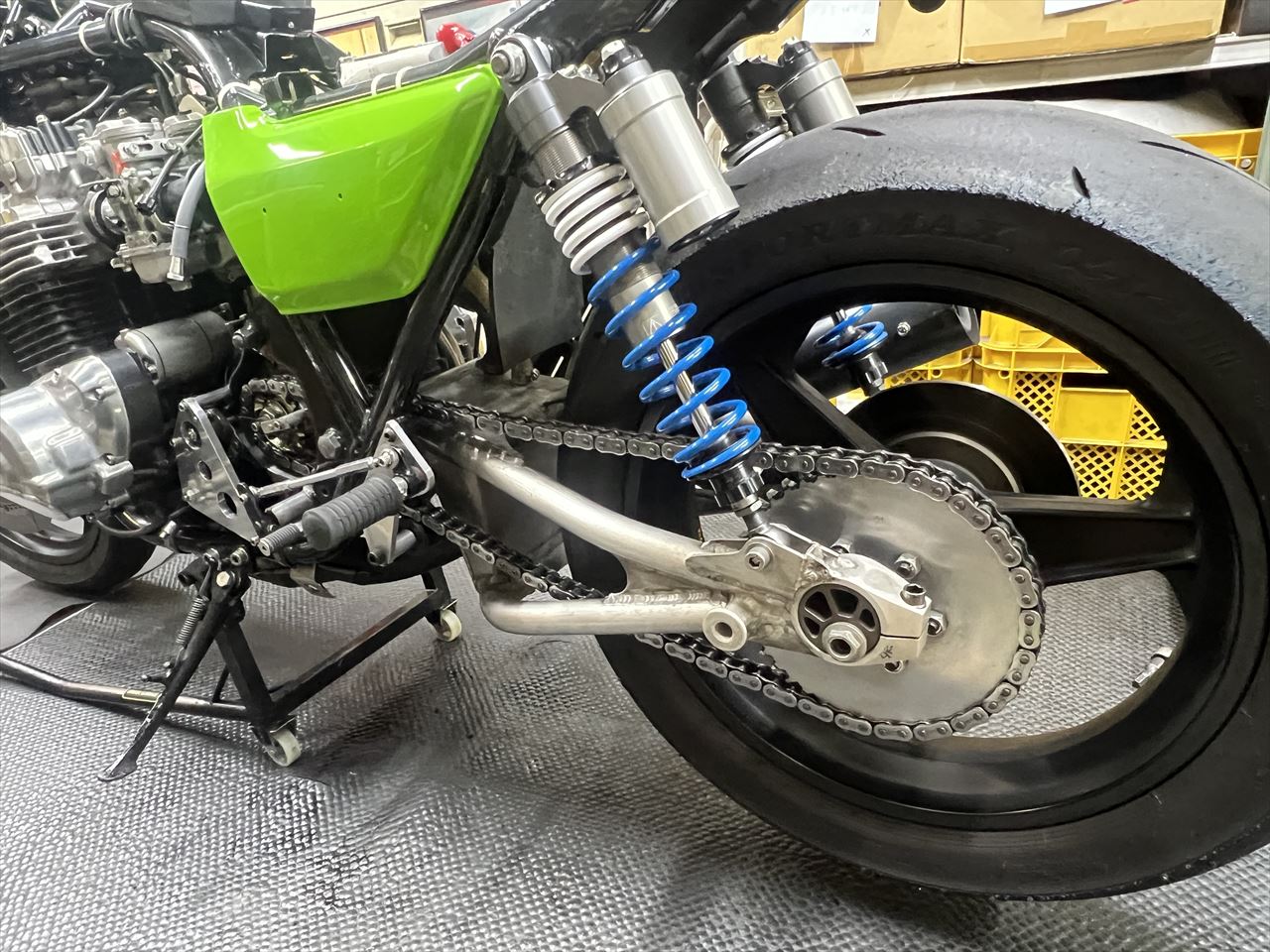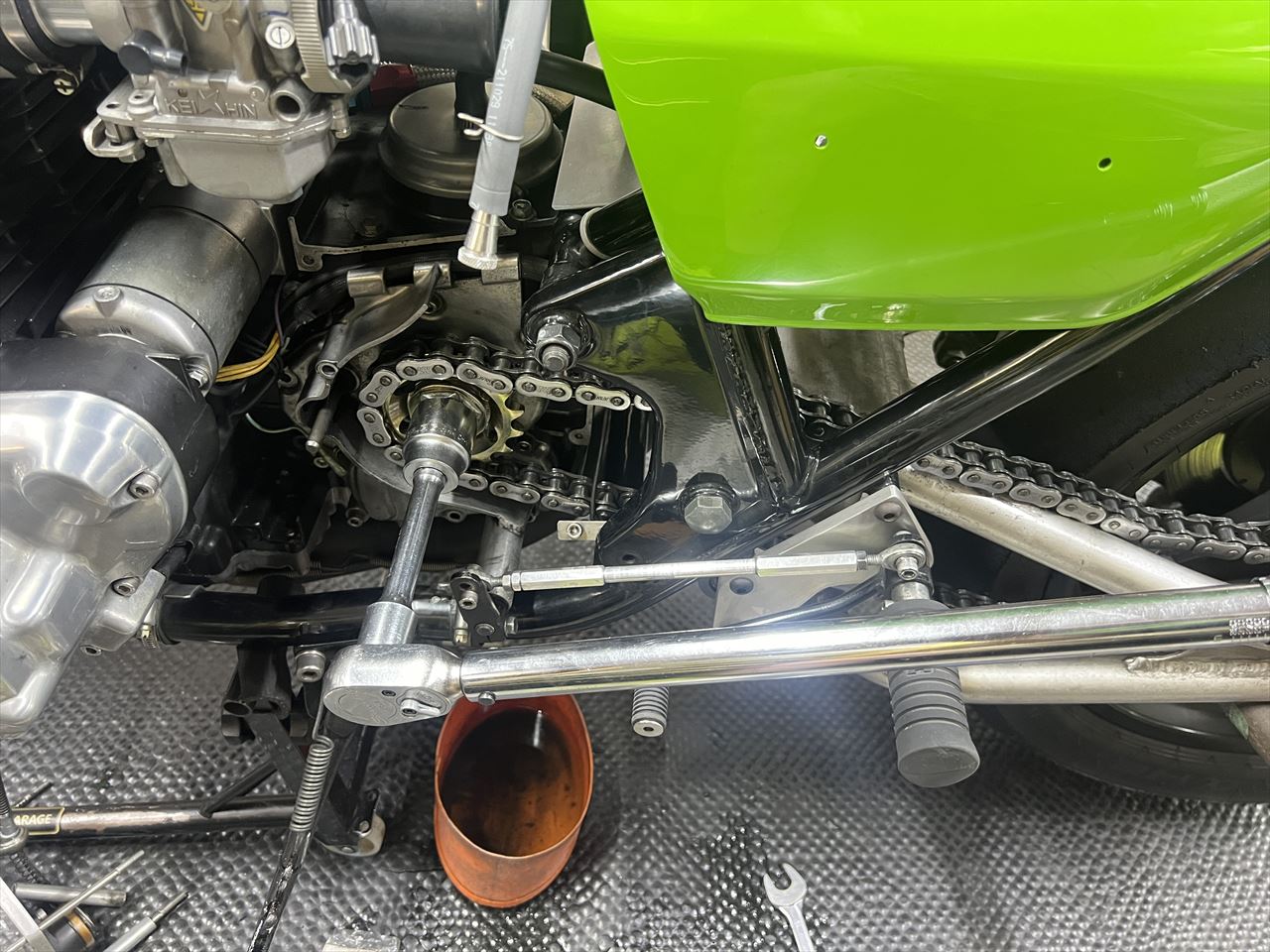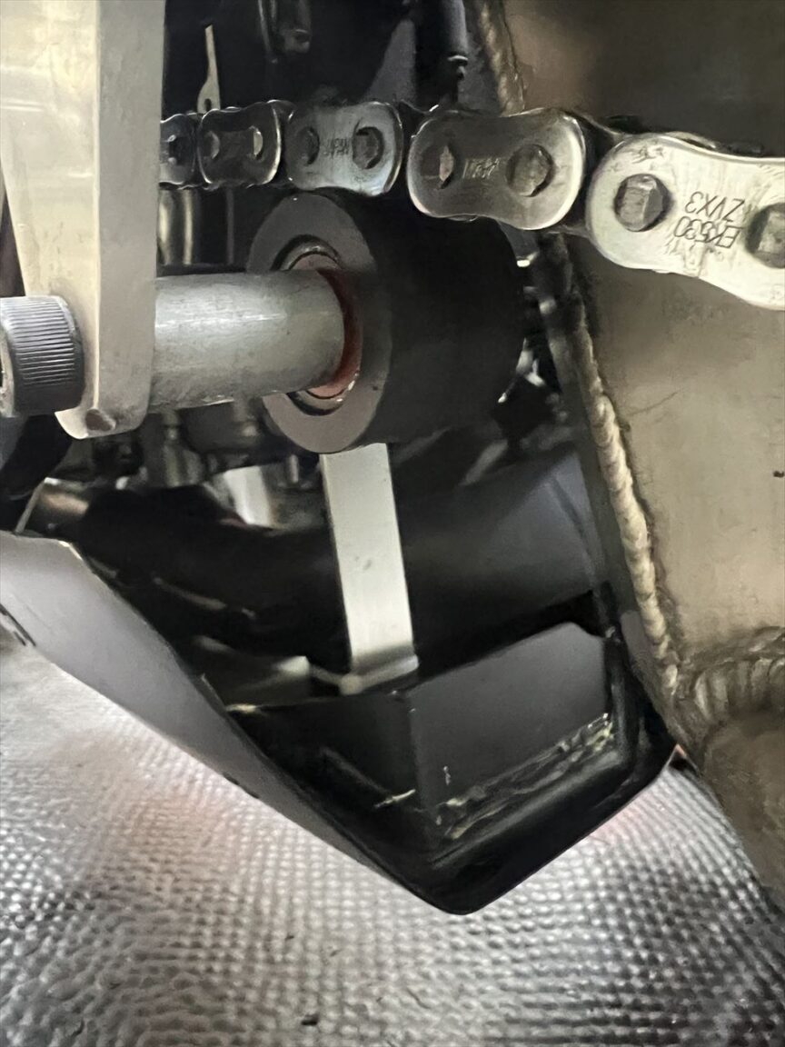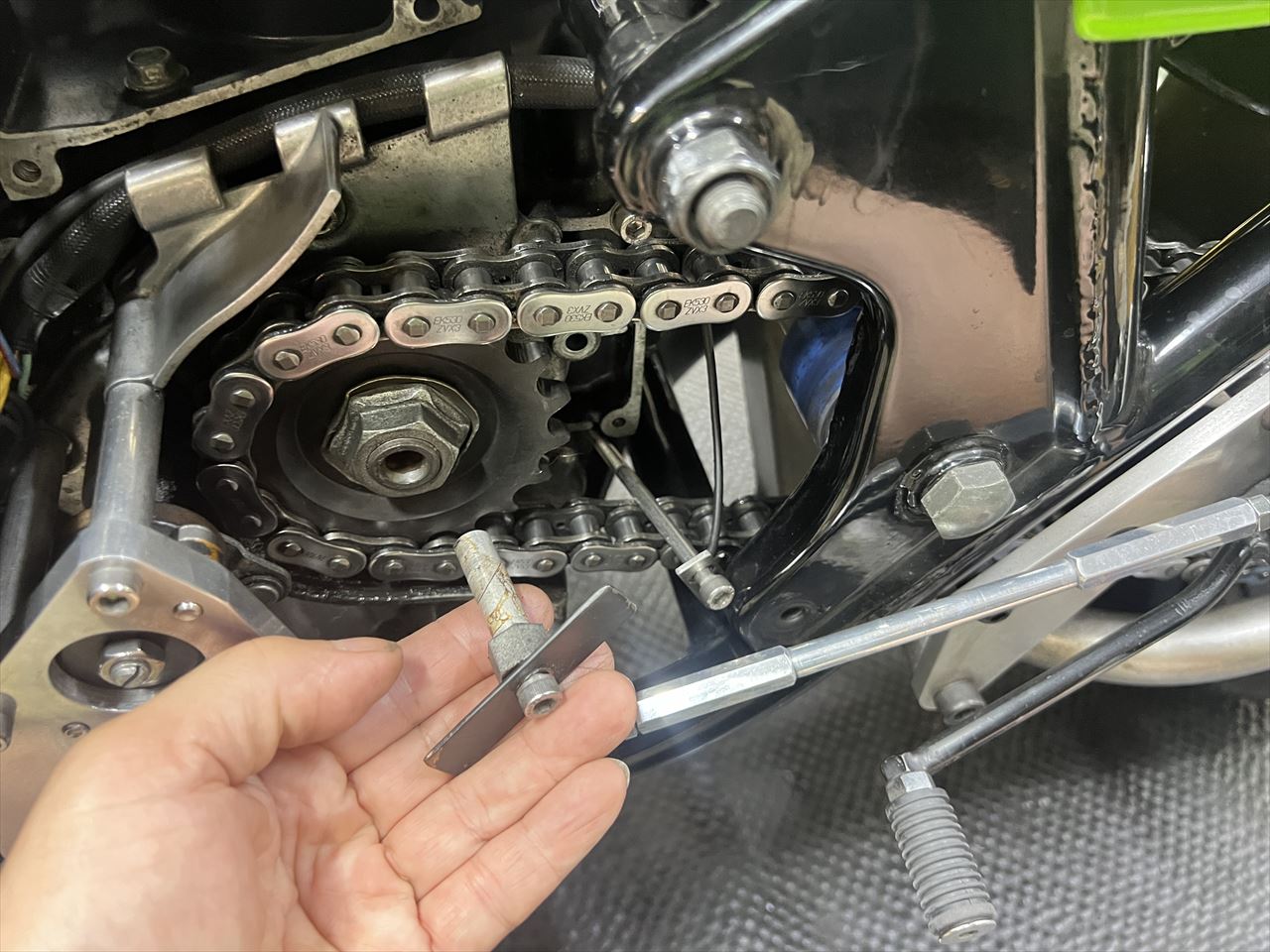 チェーンの張り調整後はこちら。リヤアクスルの位置は後ろ過ぎないのでチェーンの長さはこのままで大丈夫ですね。