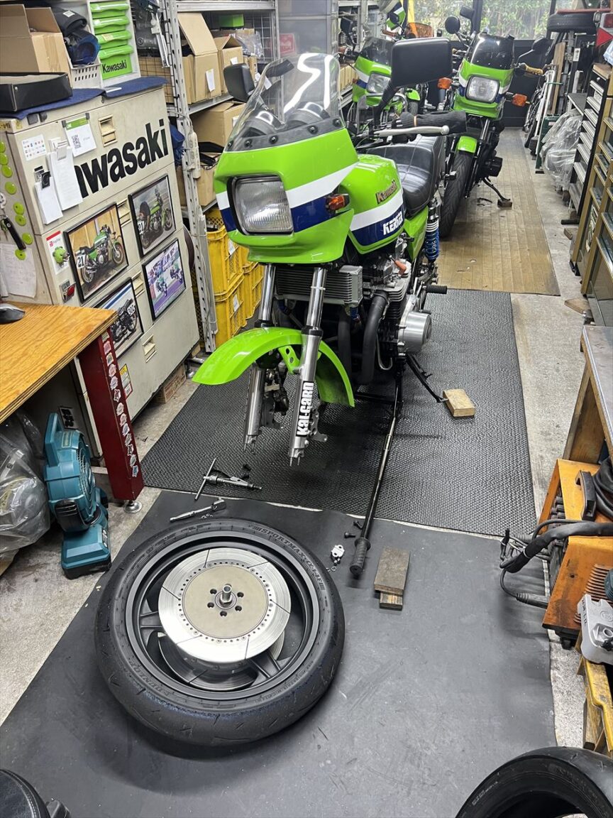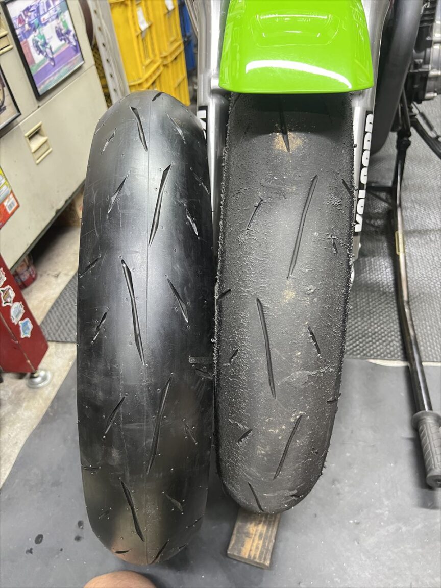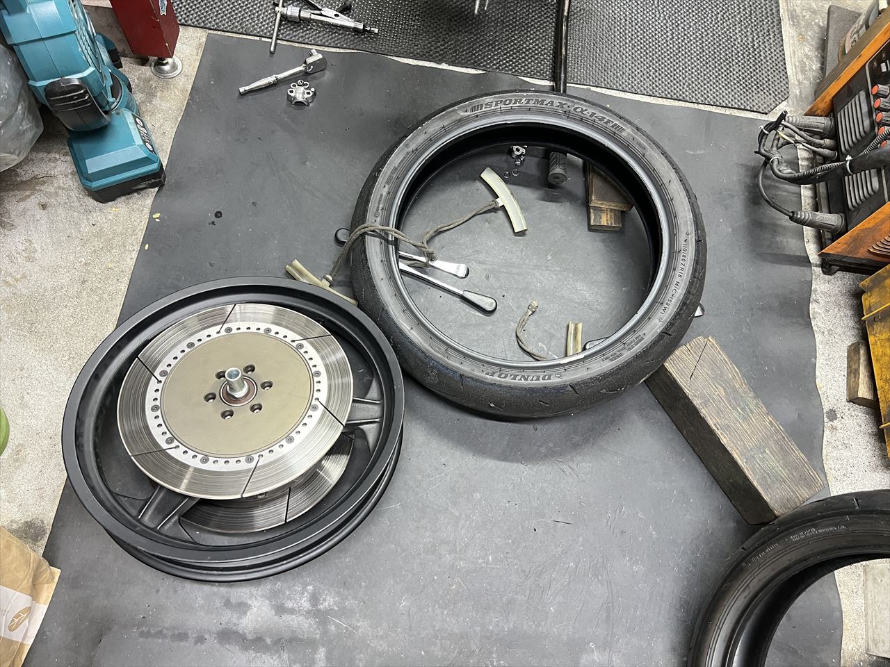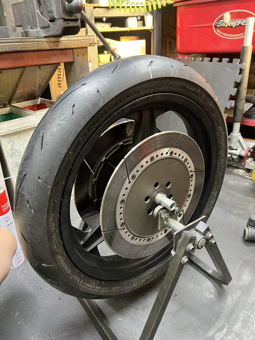新しいタイヤを組み、バランス取りします。ちなみにα14は廃盤になったようですね。こちらのタイヤはデッドストック品を探されたそうです。
