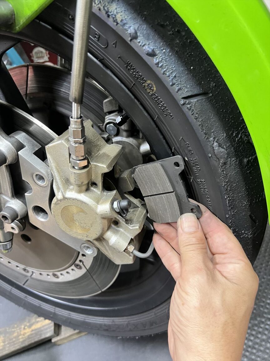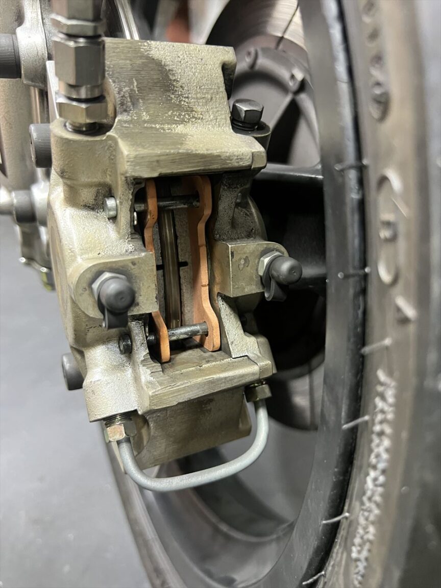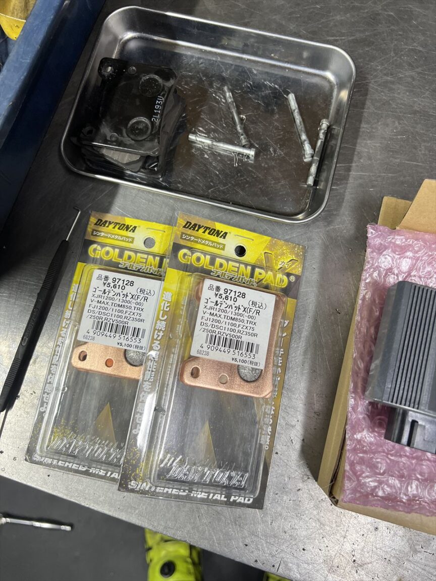 今までのパッドは新品ローターの慣らし用に摩材が柔らかいタイプを使用していましたが、今回から効きのいいメタルのゴールデンパッドに変更します。