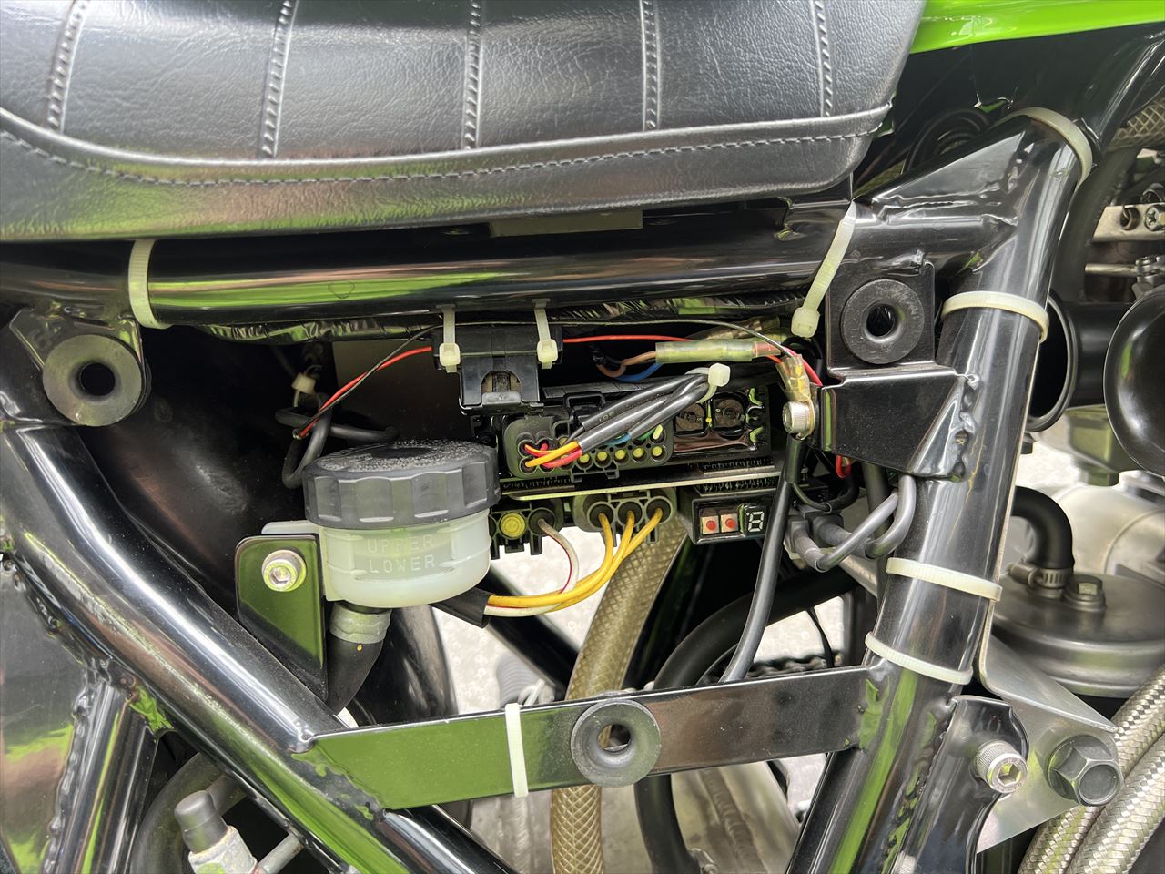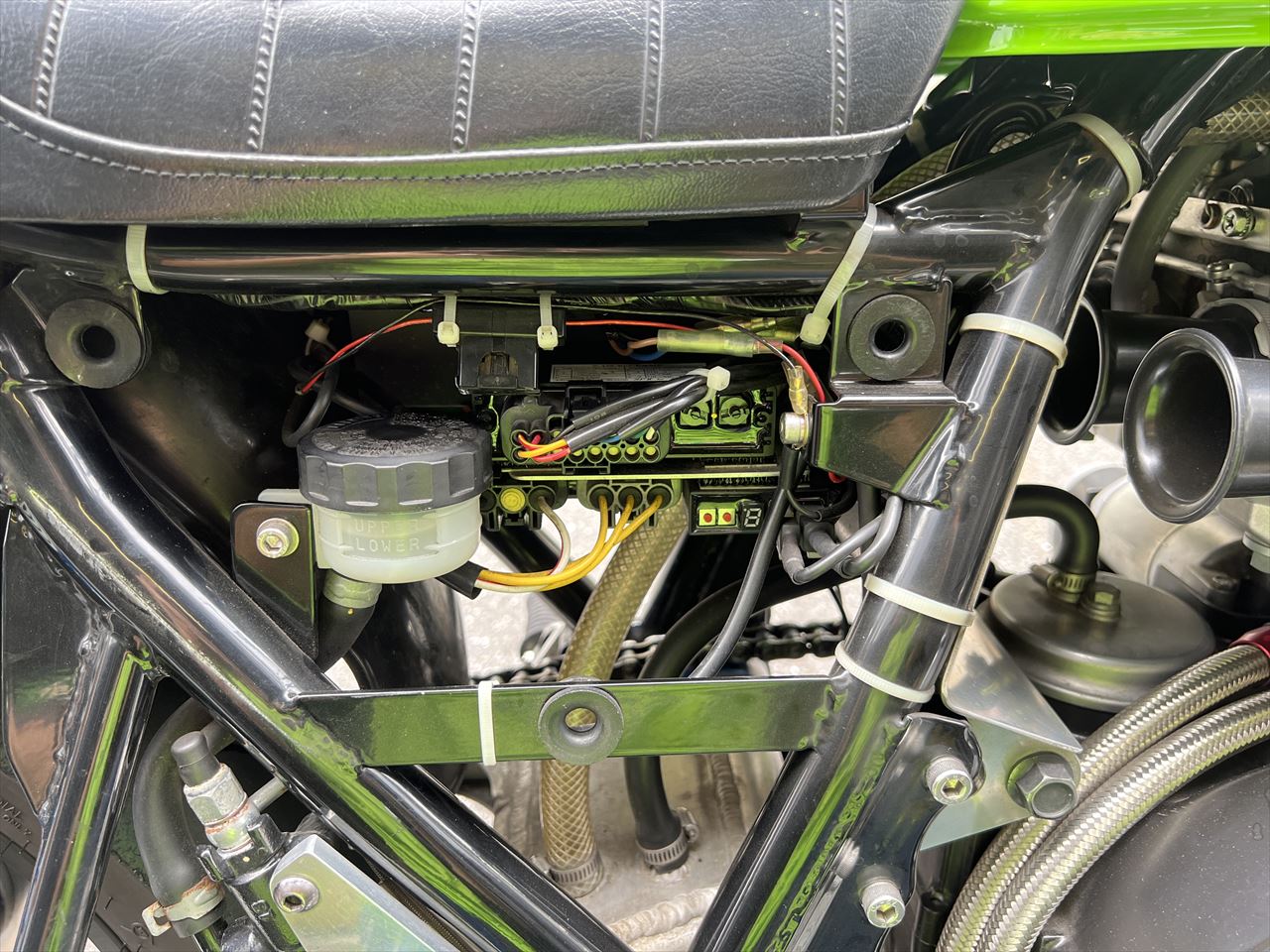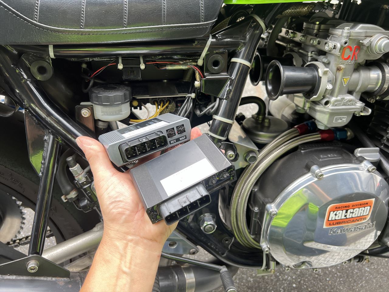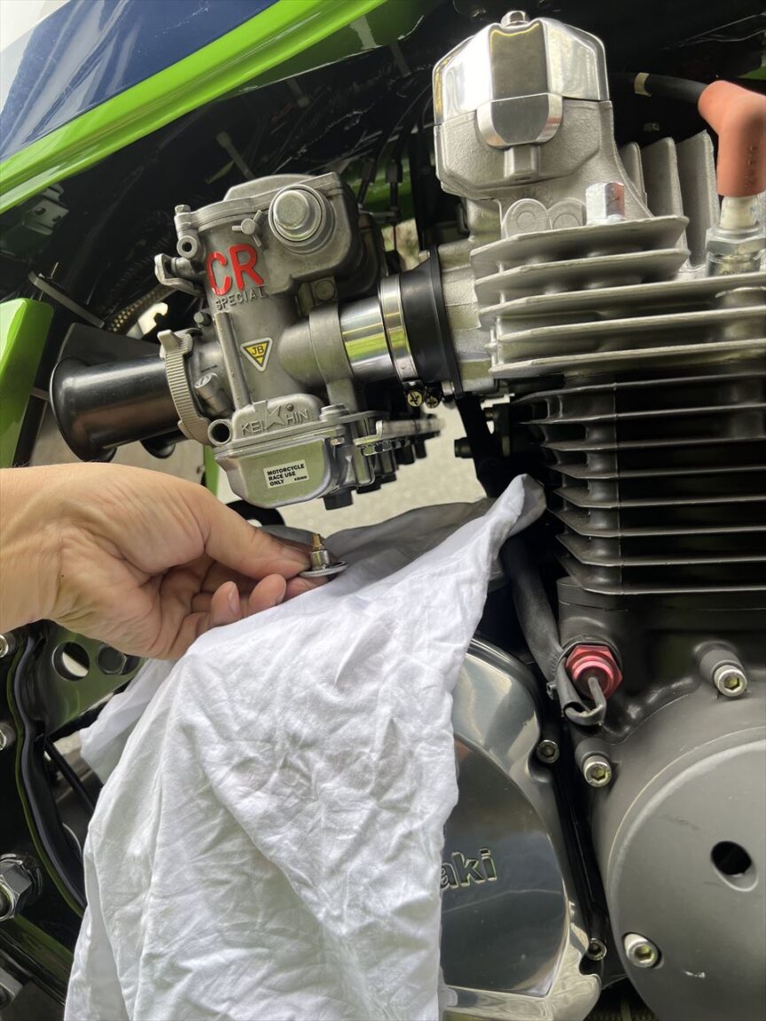 帰り道、「6500rpmからの散発的なエンジン失火」を確認するため高速道を経由して戻ります。結果はスロットル全開だと必ず6000rpmくらいからバラつく症状が発生していました。これは単純にメインジェットが合わなくなっている症状なので、ガレージに戻りジェットを交換します。車両製作時にセッティングしてあるので、今回は真夏ということもあり燃調はリッチになっているもよう。ジェットは128番から125番へ一段落としてみます。