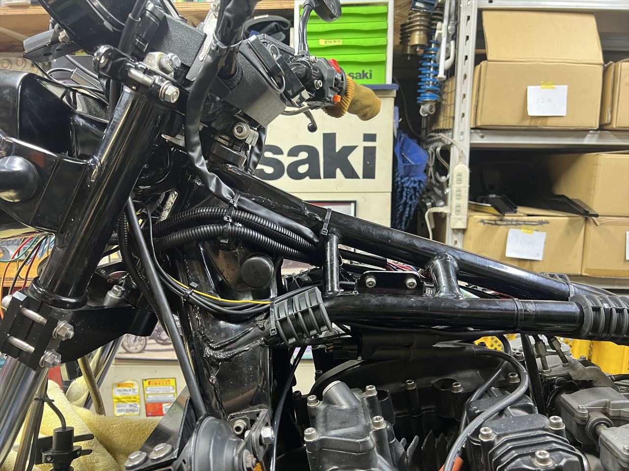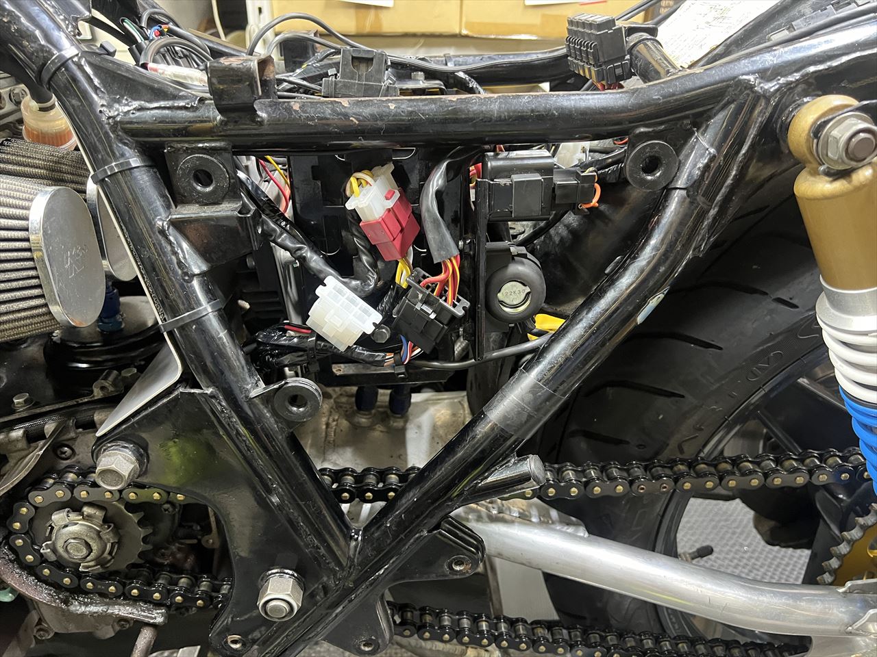 タンクを載せるとこんな感じ。メインハーネスはタンクとフレームの間を通ります。