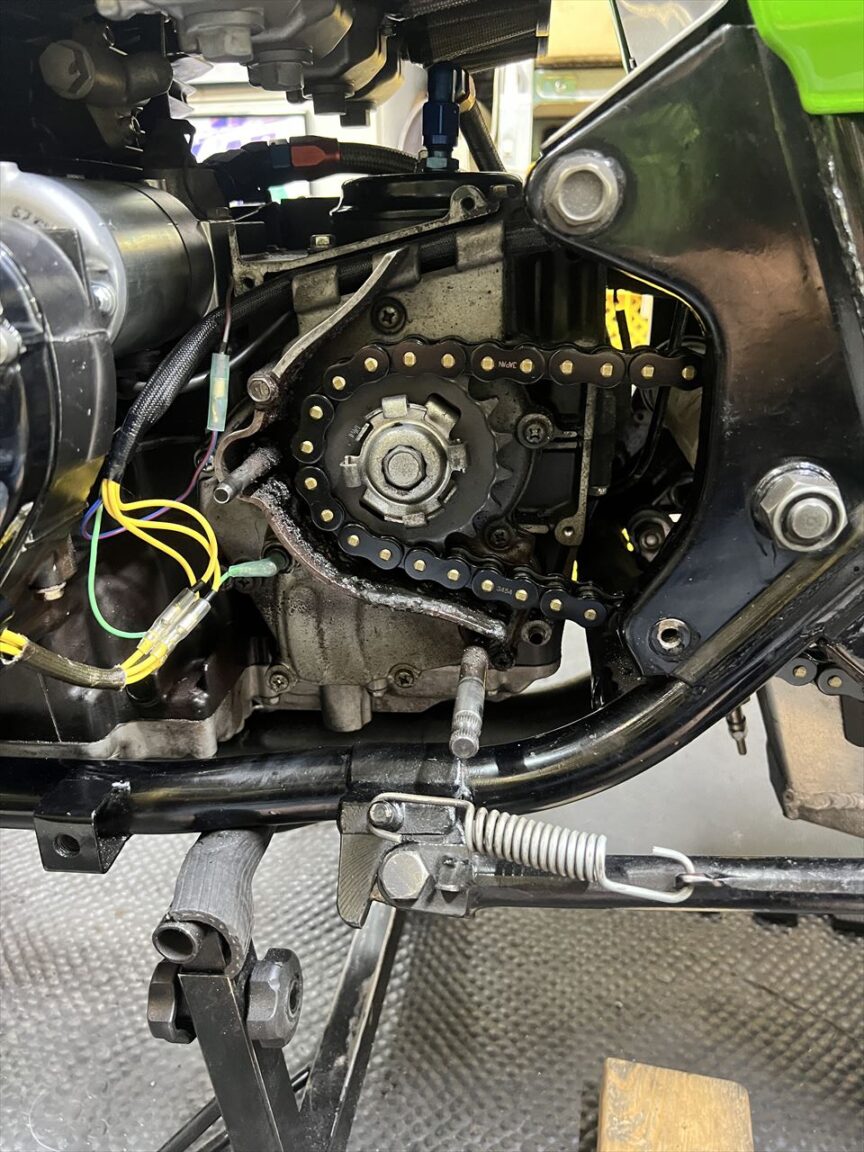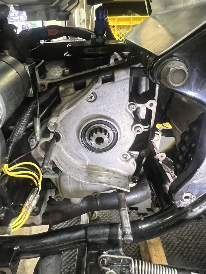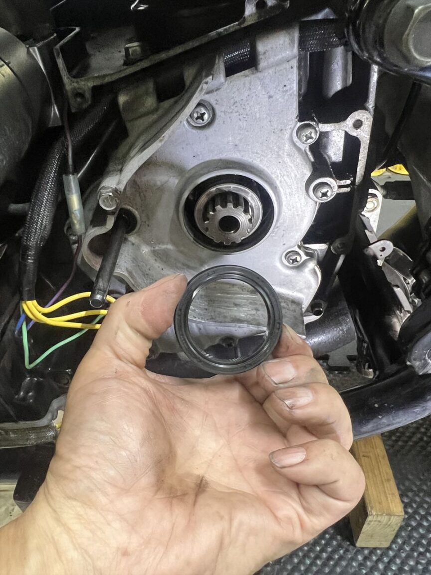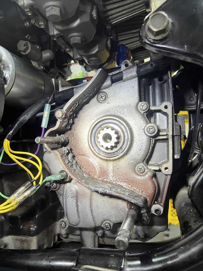 最後にオイル漏れ修理です。スプロケット裏側辺りから漏れているようです。