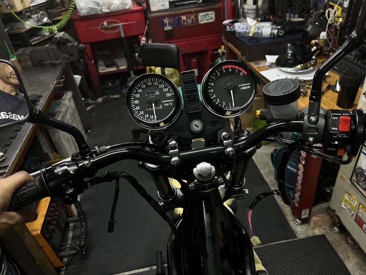 完成したメーターを取り付けます。ステムはザッパー、メーターブラケットはPMCの純正タイプです。