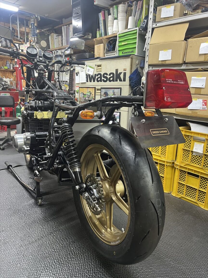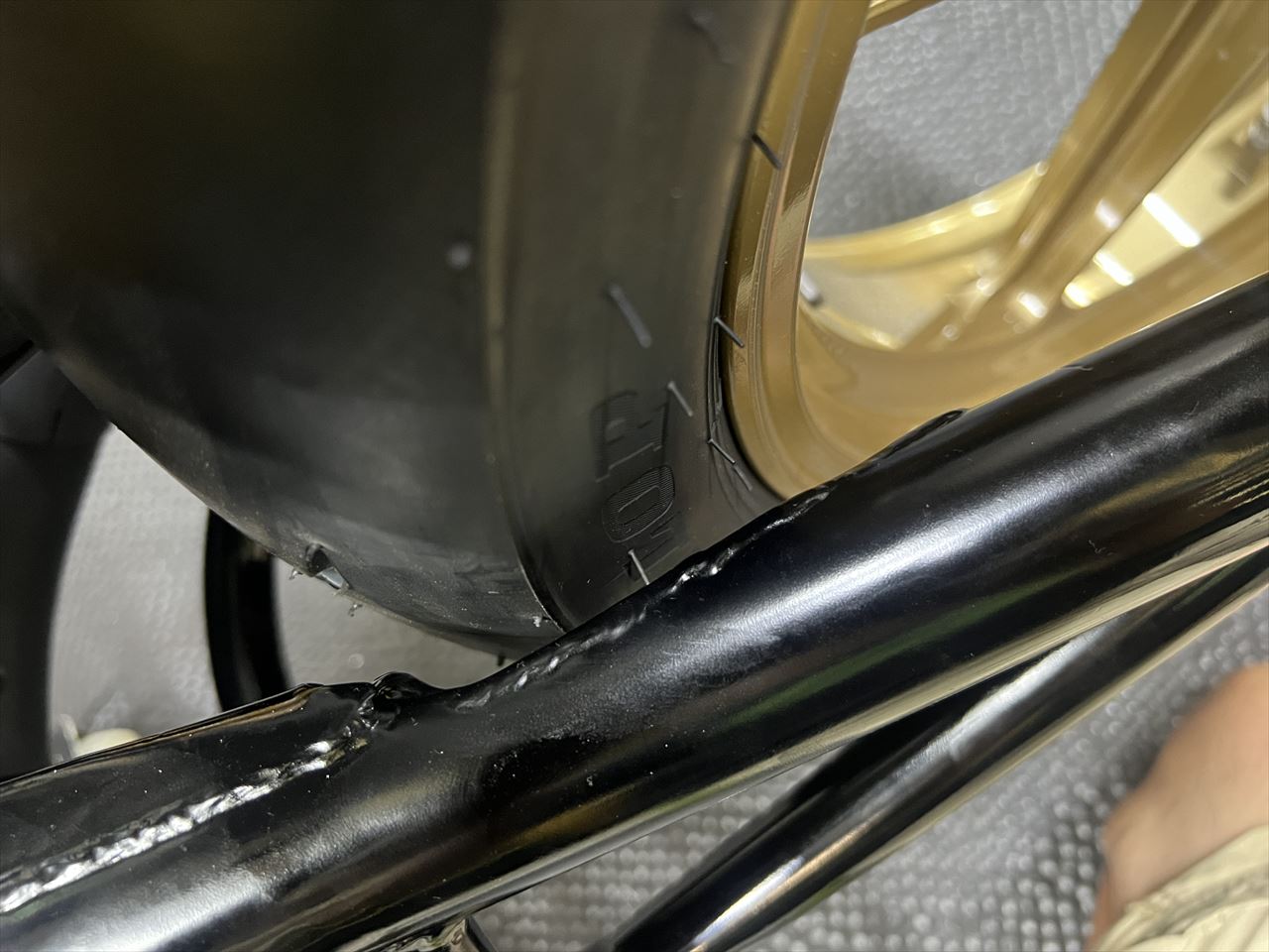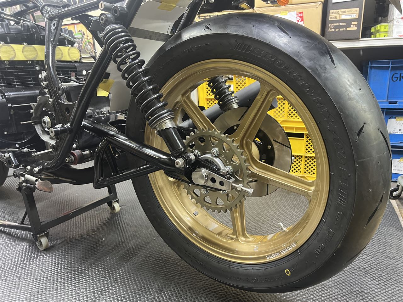 タイヤはダンロップのα14 150/70-18 で、実幅は約160ミリ、ワイド加工したスイングアームとのクリアランスはこのくらいです。