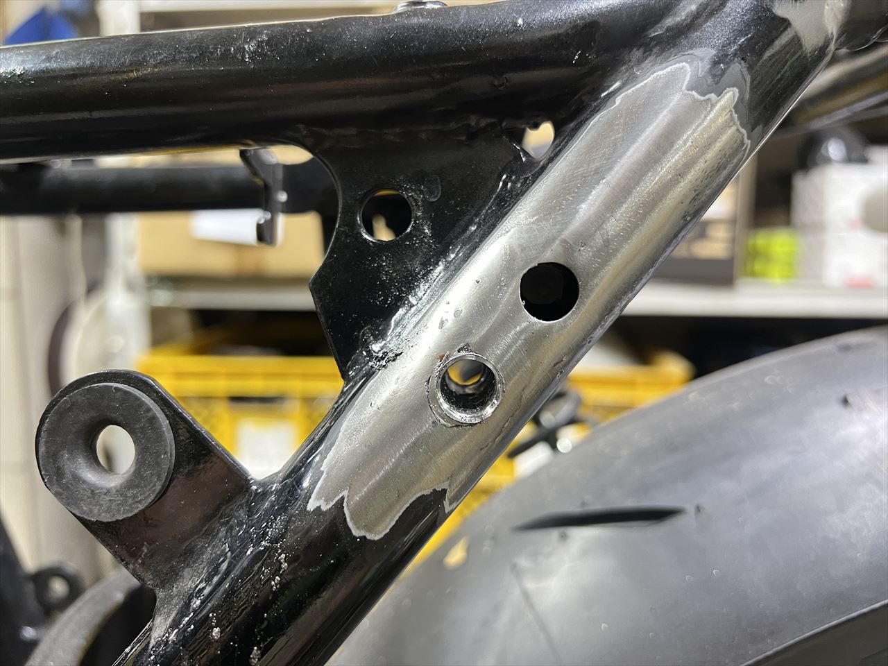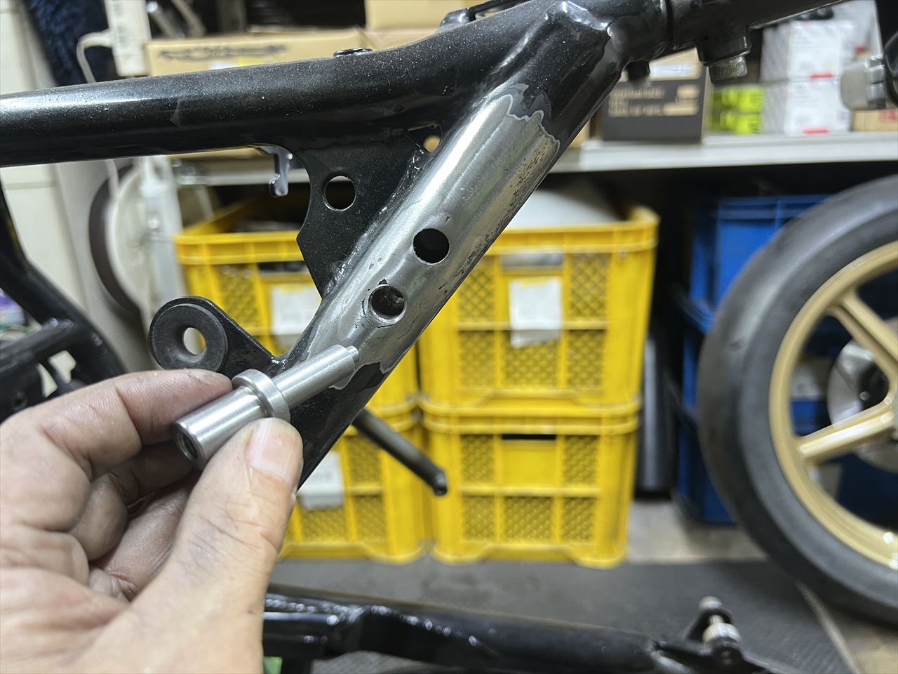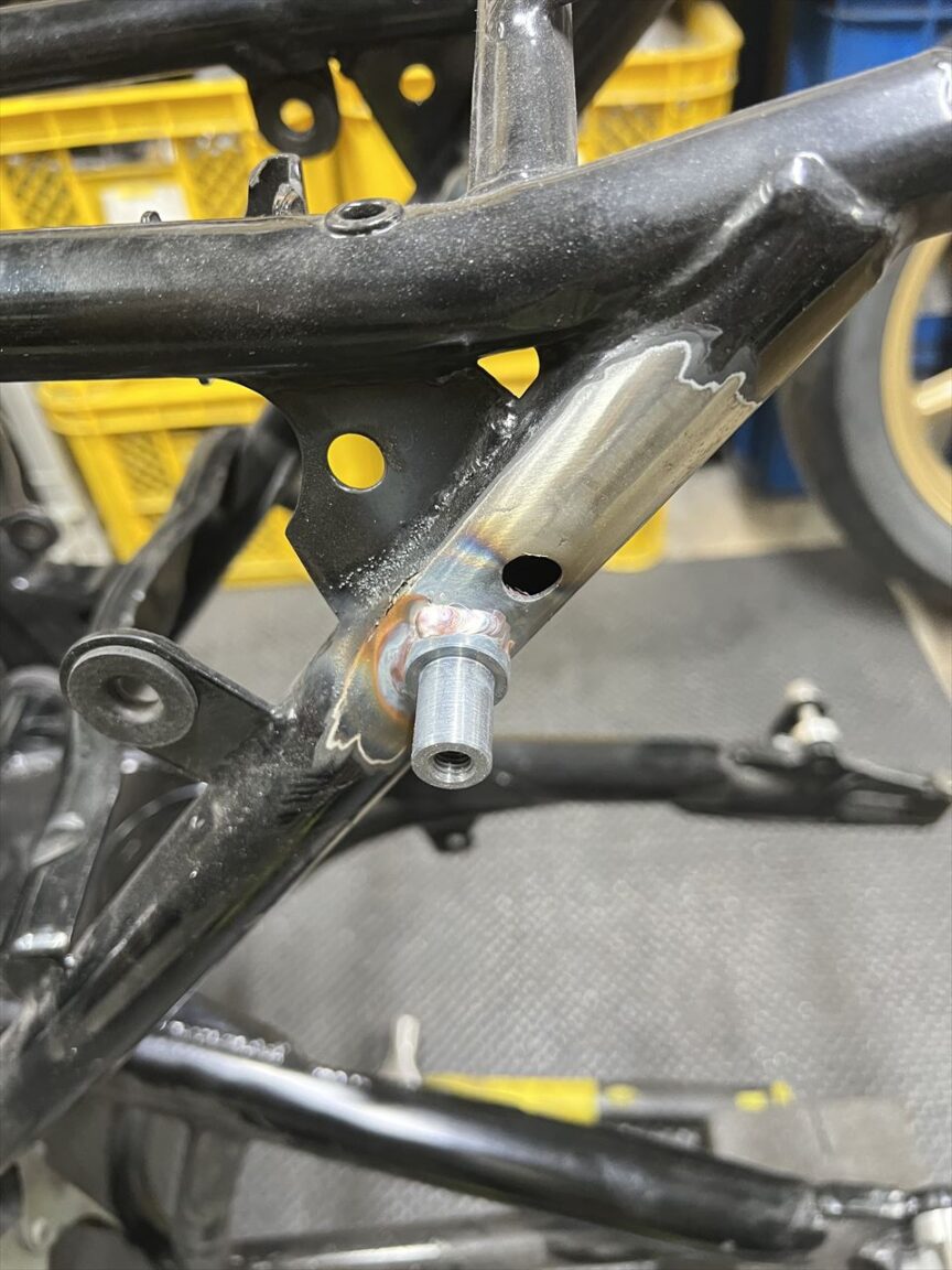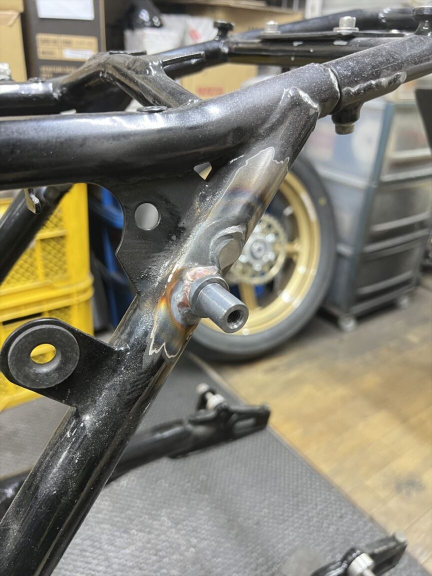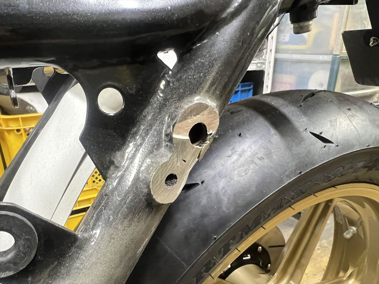 以前のカスタムスイングアームはかなりワイドで、フレーム側のリヤショックアッパーマウントもかなり外側に出してありました。今回のワークススイングアームは純正改造で、ワイドホイール向けにリヤショックマウントは左右ともに10ミリオフセットとしています。そこでこの既存のマウントは修正します。
