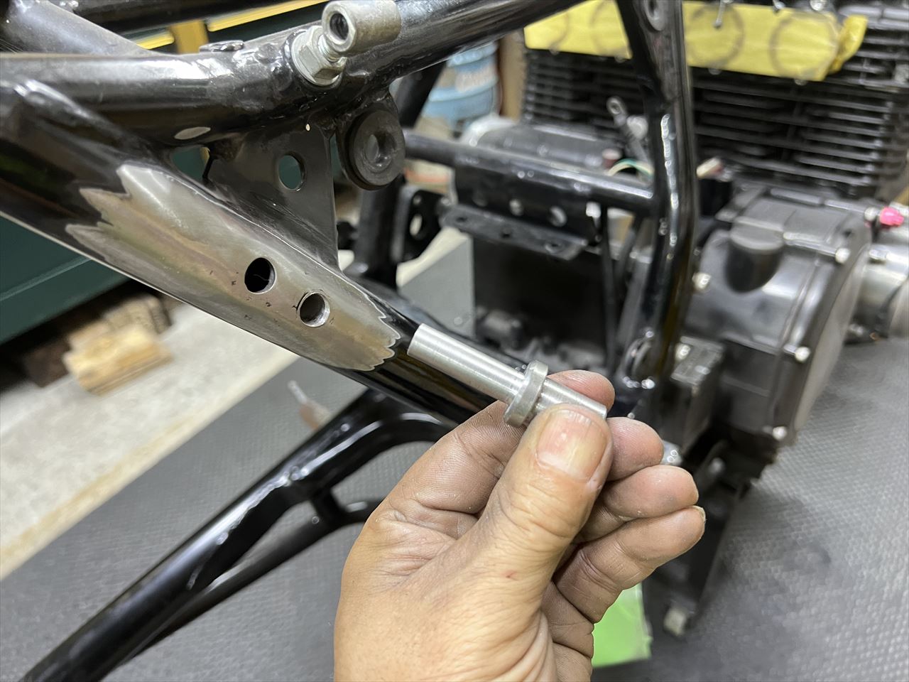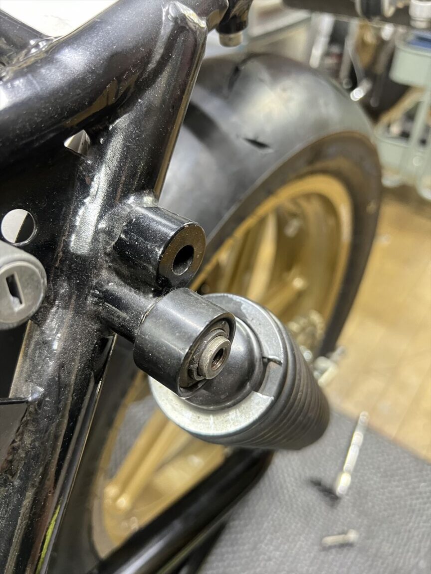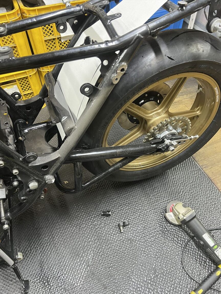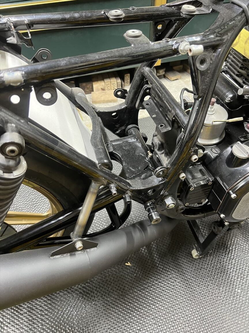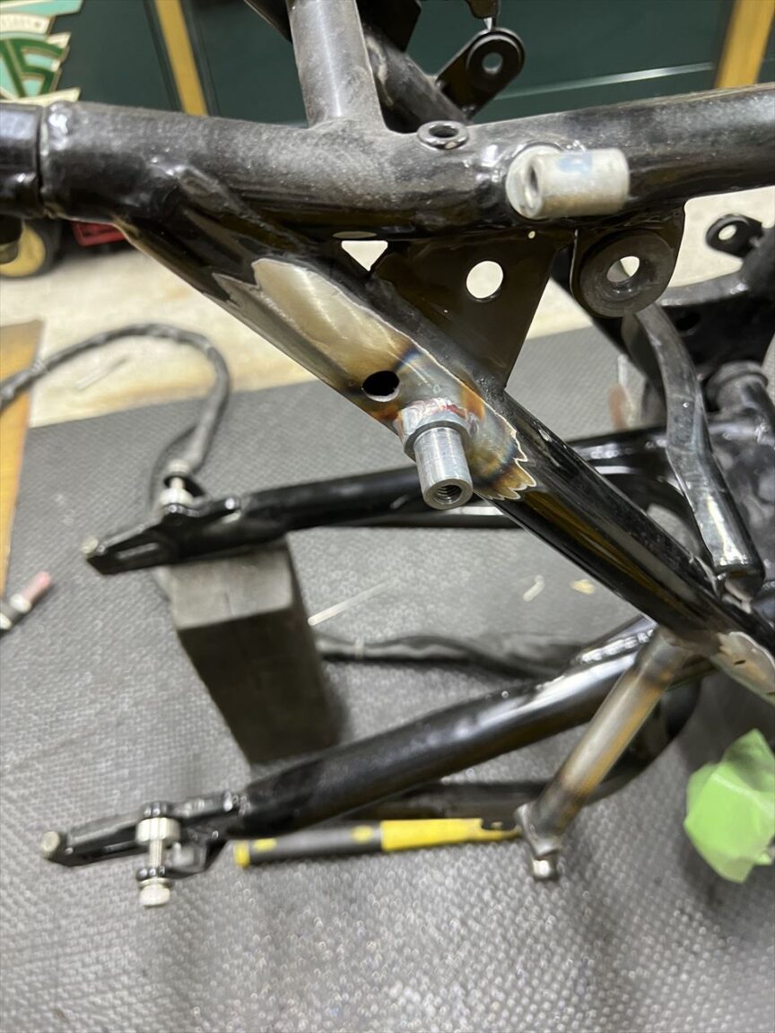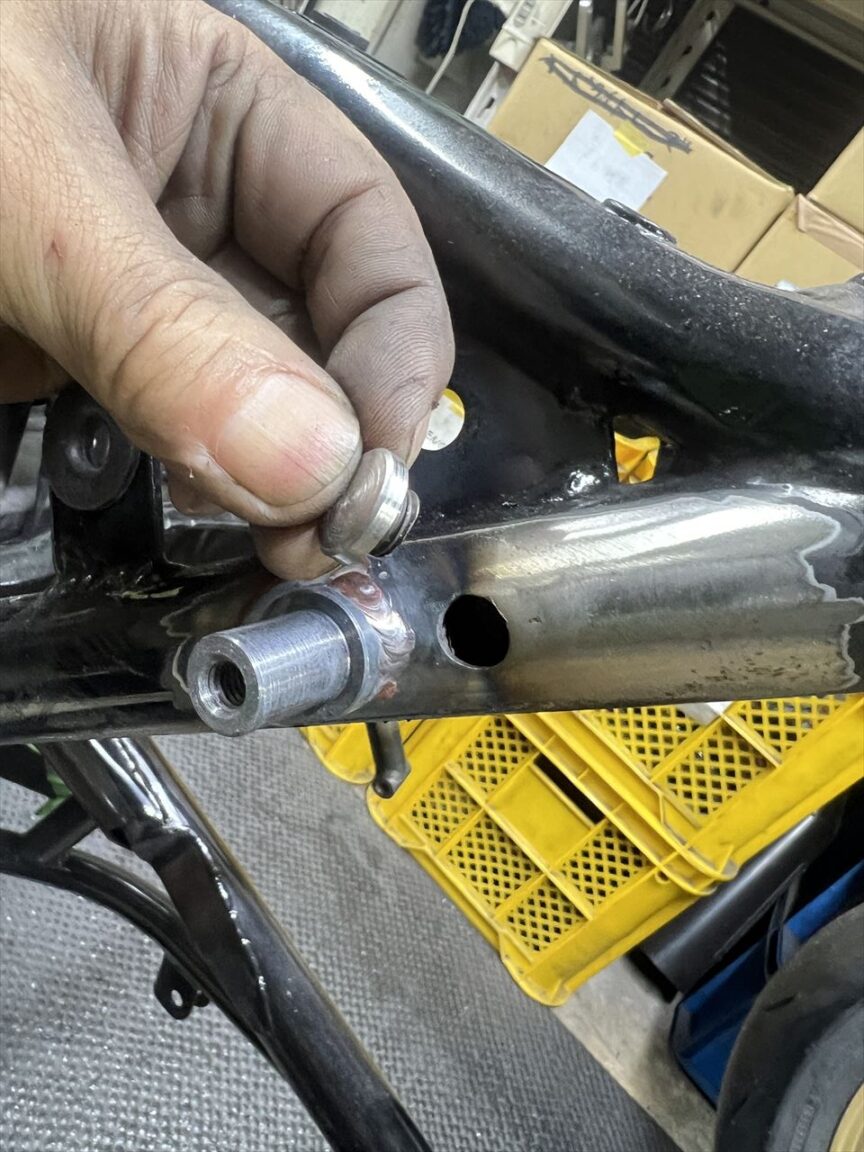 以前のカスタムスイングアームはかなりワイドで、フレーム側のリヤショックアッパーマウントもかなり外側に出してありました。今回のワークススイングアームは純正改造で、ワイドホイール向けにリヤショックマウントは左右ともに10ミリオフセットとしています。そこでこの既存のマウントは修正します。