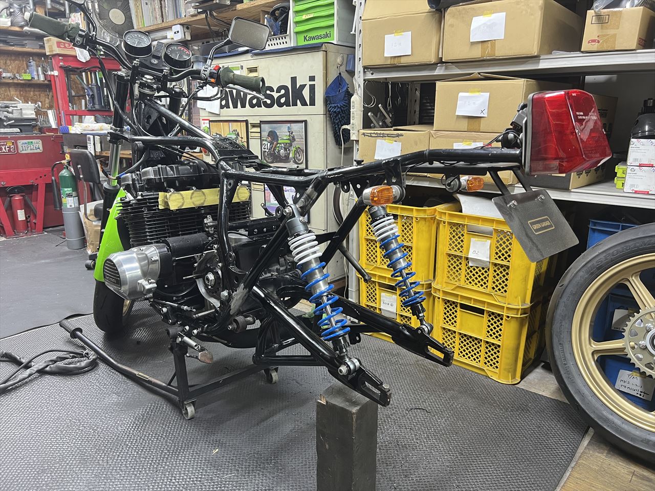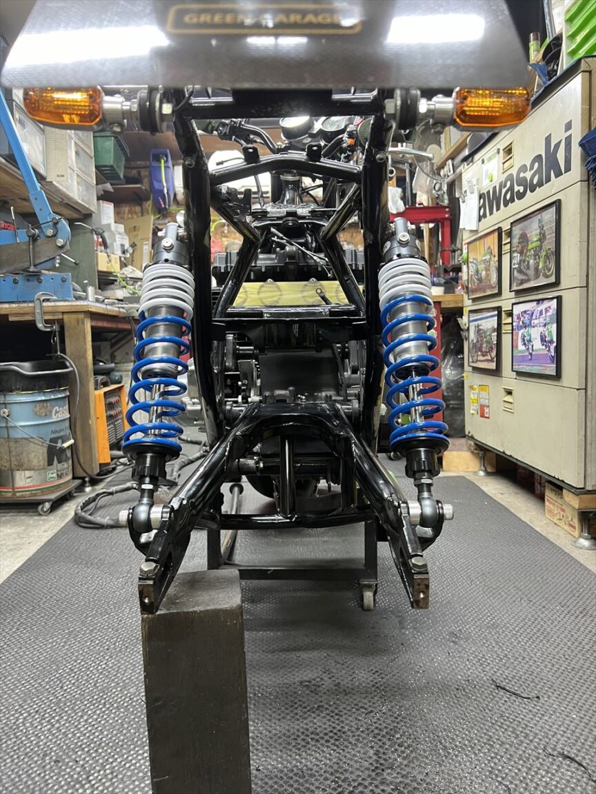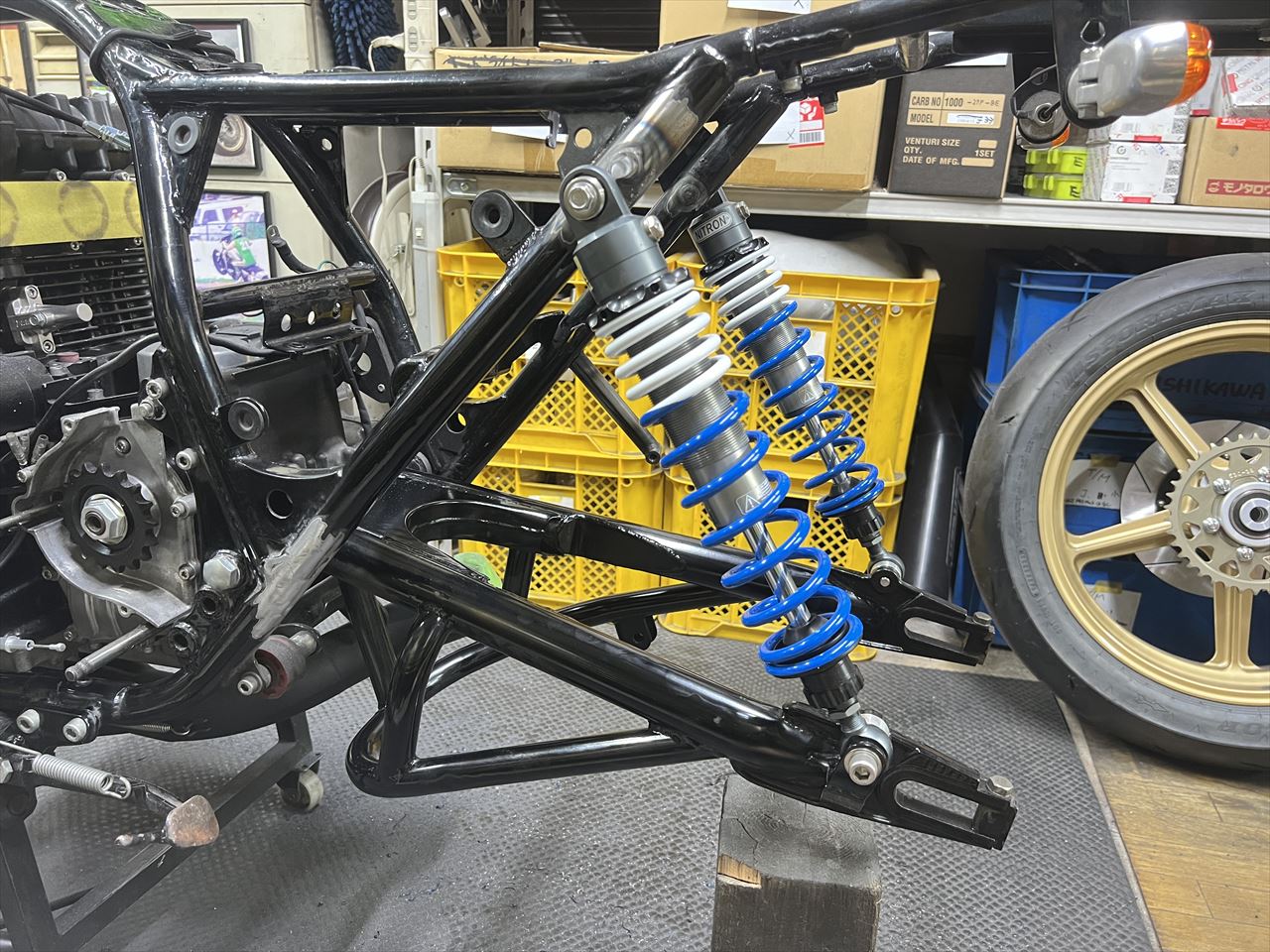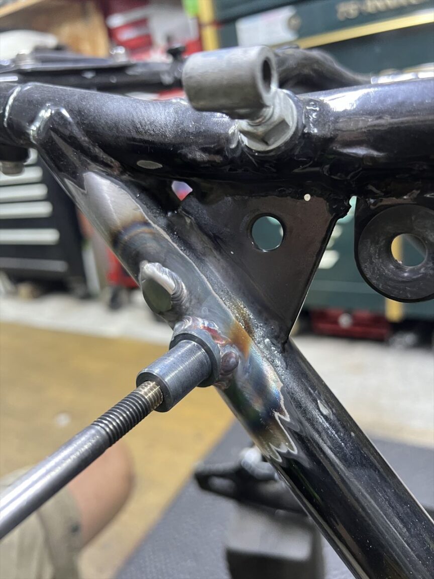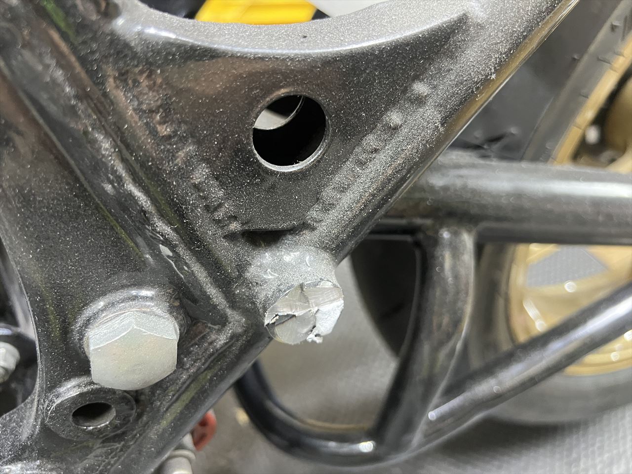 以前のカスタムスイングアームはかなりワイドで、フレーム側のリヤショックアッパーマウントもかなり外側に出してありました。今回のワークススイングアームは純正改造で、ワイドホイール向けにリヤショックマウントは左右ともに10ミリオフセットとしています。そこでこの既存のマウントは修正します。