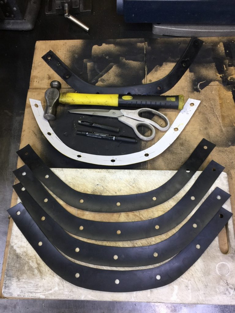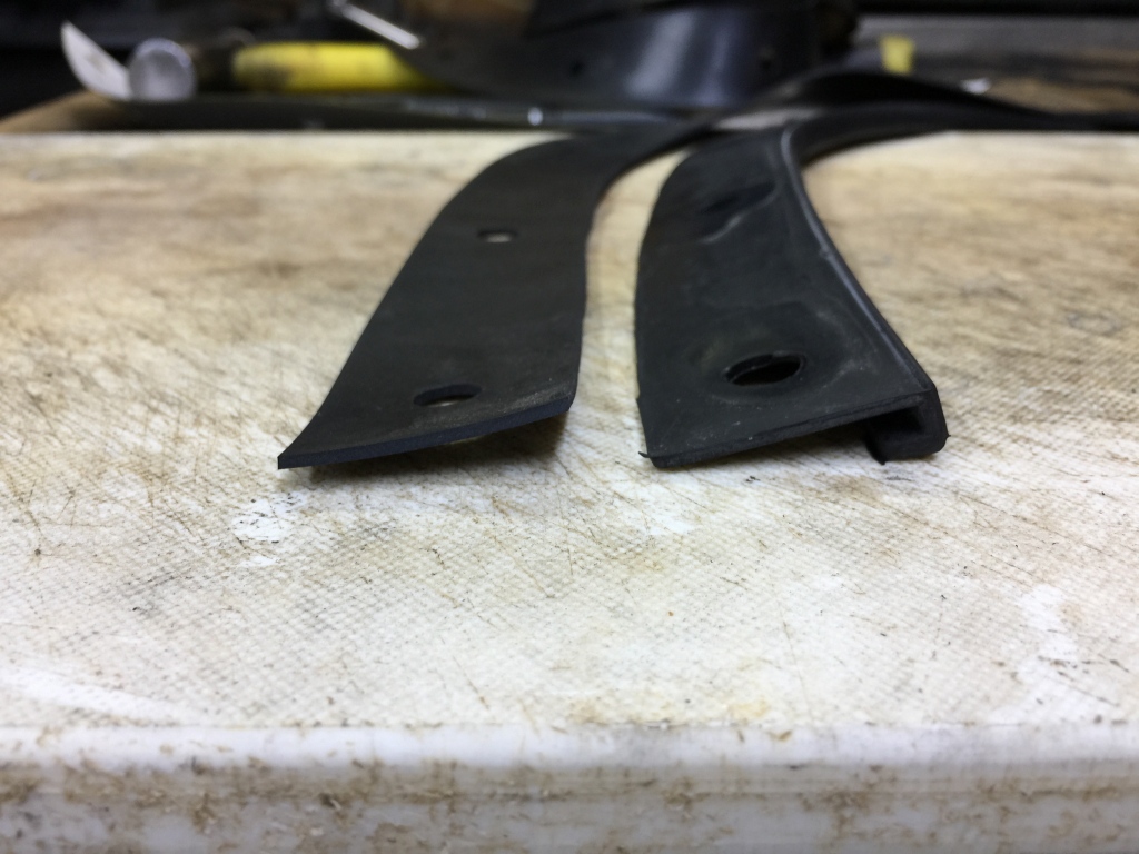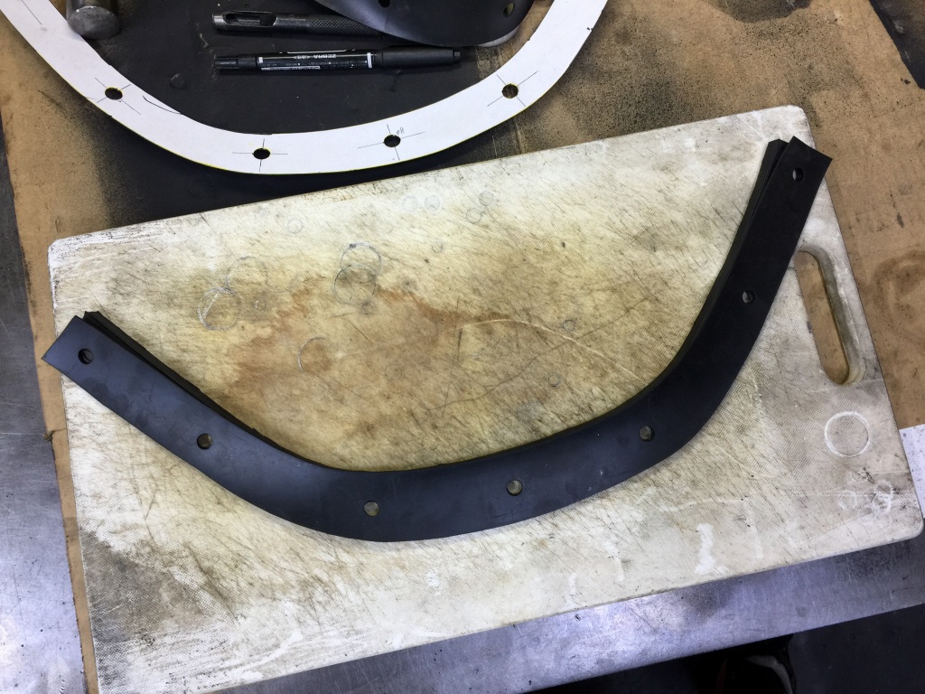 投稿日: 2018年6月25日 投稿者: greengarageスクリーンモール製作 在庫切れのところ、ご注文いただいたので製作します。 素材は、対候性のある厚さ1.5ミリのCNRゴムです。 型紙に合わせて切り抜きます。 ポンチで穴を開けて完成です。 純正のスクリーンモールと比較します。 重ねると同じ形です。 断面は異なります。