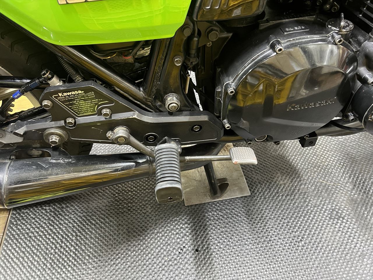 チェンジリンクのガタが気になるとのこと。前後の軸にガタがあり、ロッドエンドにもガタがある状態です。スプロケカバーの修正やロッドエンド交換など、修理にはかなり手間がかかるので、今後のバックステップ化を見据えて今回は修正を見送ることに。