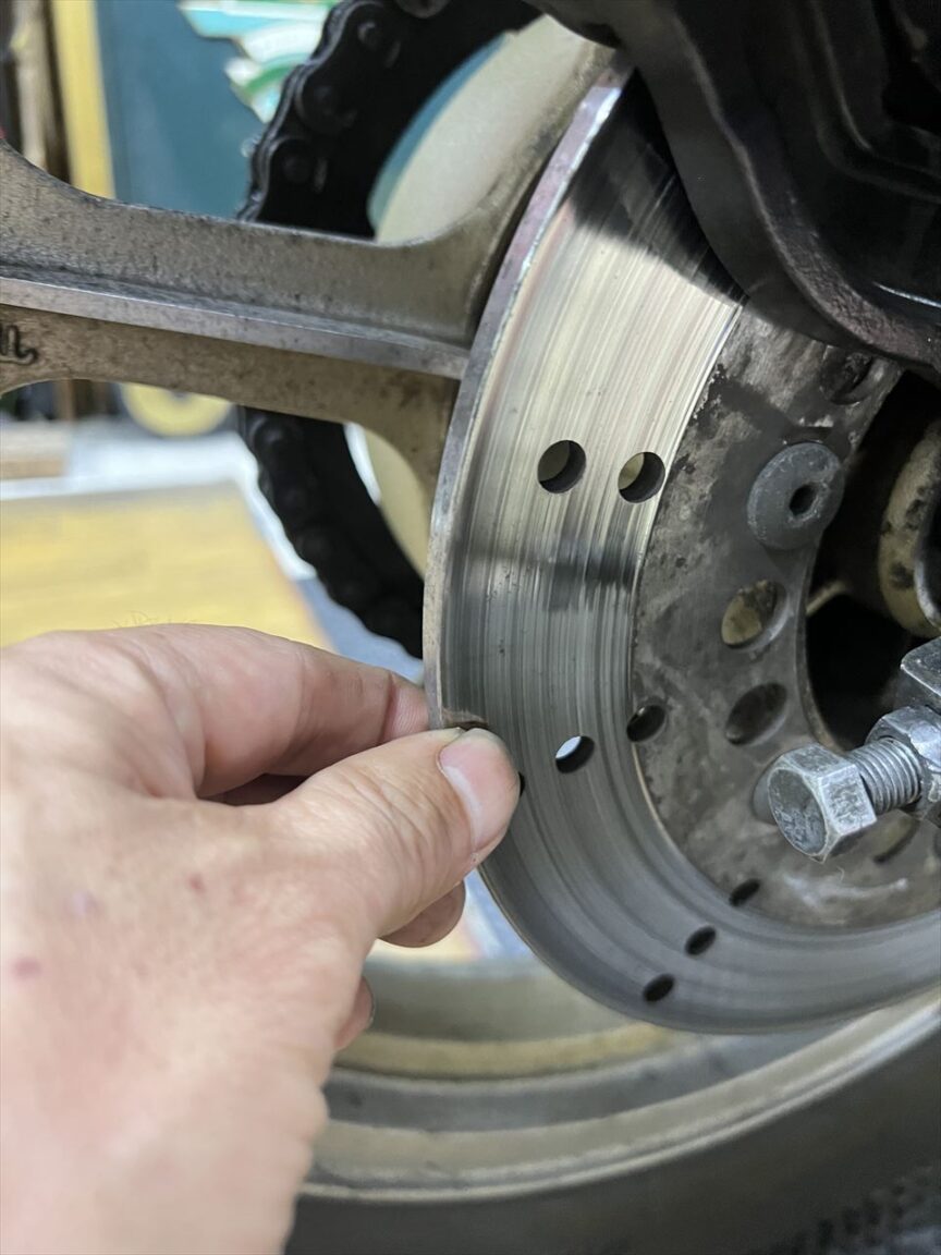 ローターはかなり摩耗が進んで凸凹です。パッドは新品交換済みとのことで、ローターも新品交換が必要です。こちらも将来のホイール交換を見据えてしばらくは現状維持することに。