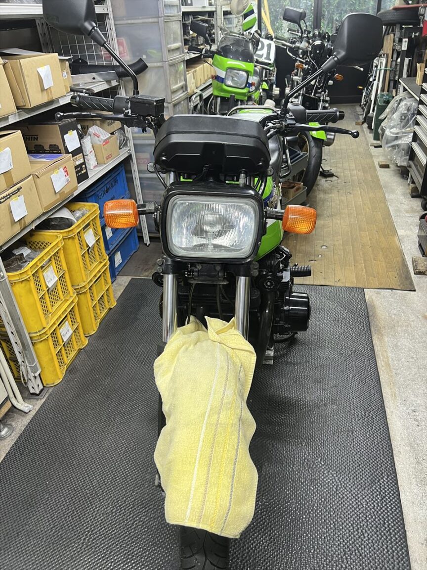 入手したばかりの車両の初点検です。今後のレストアやカスタムに向けて、現状確認です。外装はリペイントされていますが、ラインの凹凸の段差などが大きく、あまりいい感じではありません。フロントフェンダーも前後逆さまですね。試乗の結果は特別悪いところは無さそうで、比較的整った車両のようです。