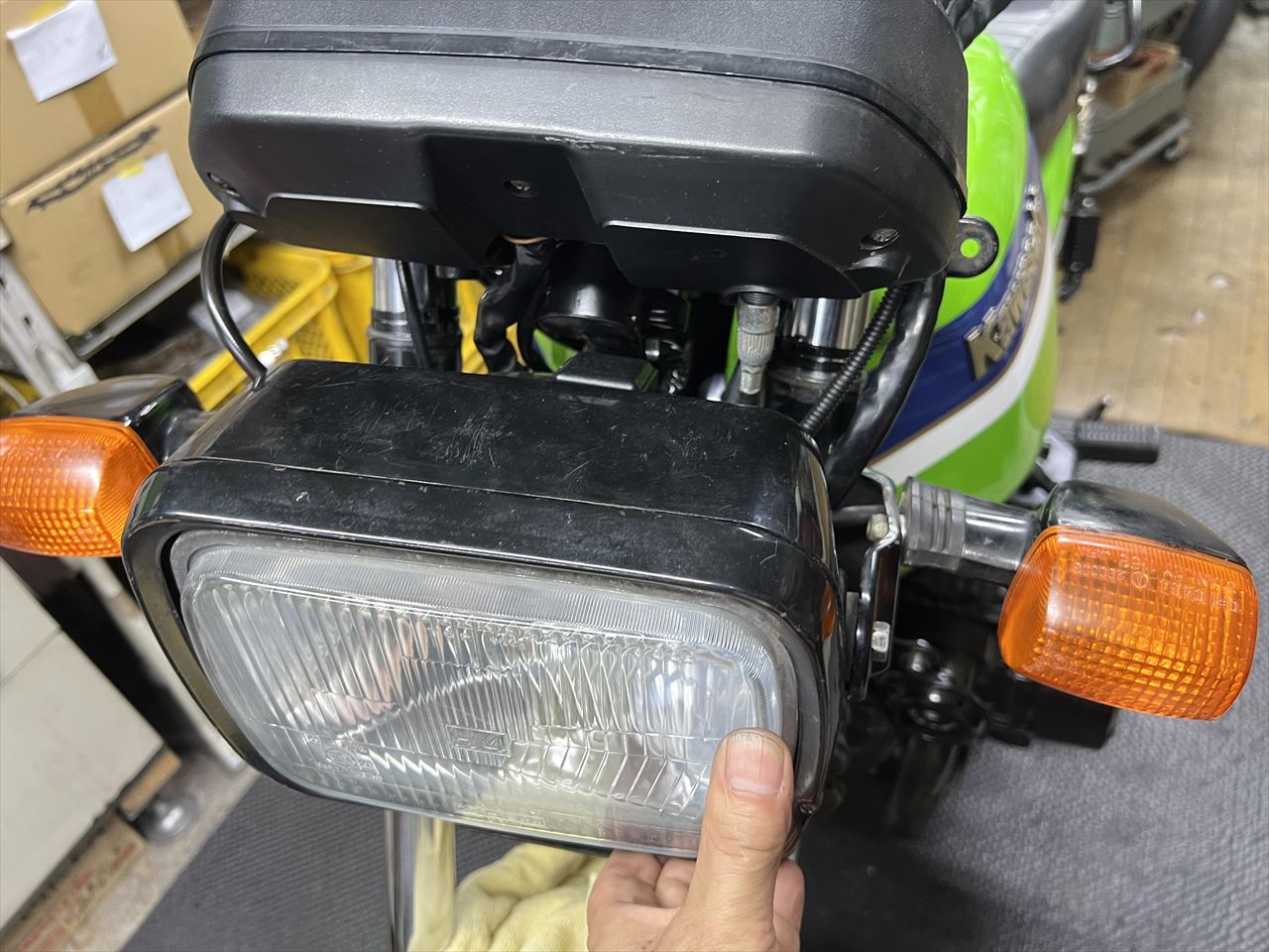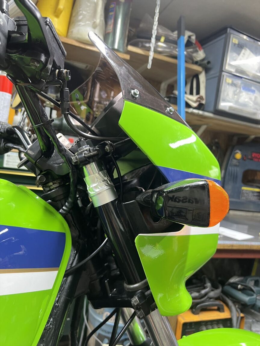 カウルを付けると結構目立ちますね。ここで気が付きましたが、カウルのウインカーの逃げ部分は大きくカットされていますね。やはりカウルは純正形状のものにした方がいいでしょう。
