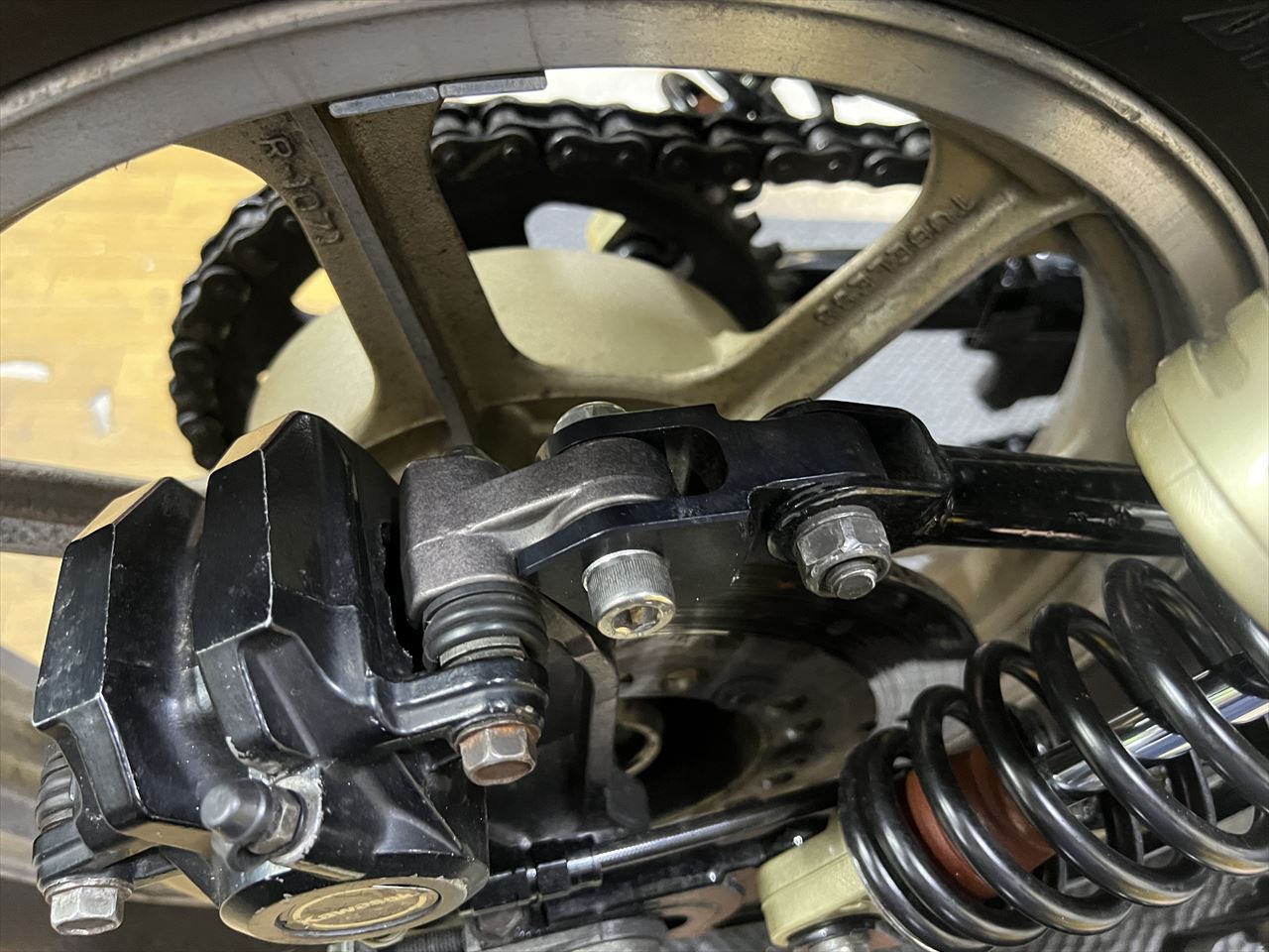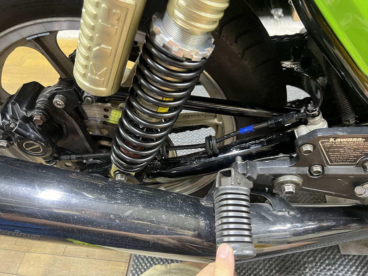センタースタンドで立てていますが、リヤブレーキホースが少し短いようで突っ張っています。ブレーキホースは交換されていますが、このように、ジャッキアップした状態、サスがフルストロークした状態を考慮しない取り付けが散見されます。ホース長さの選定は慎重に。