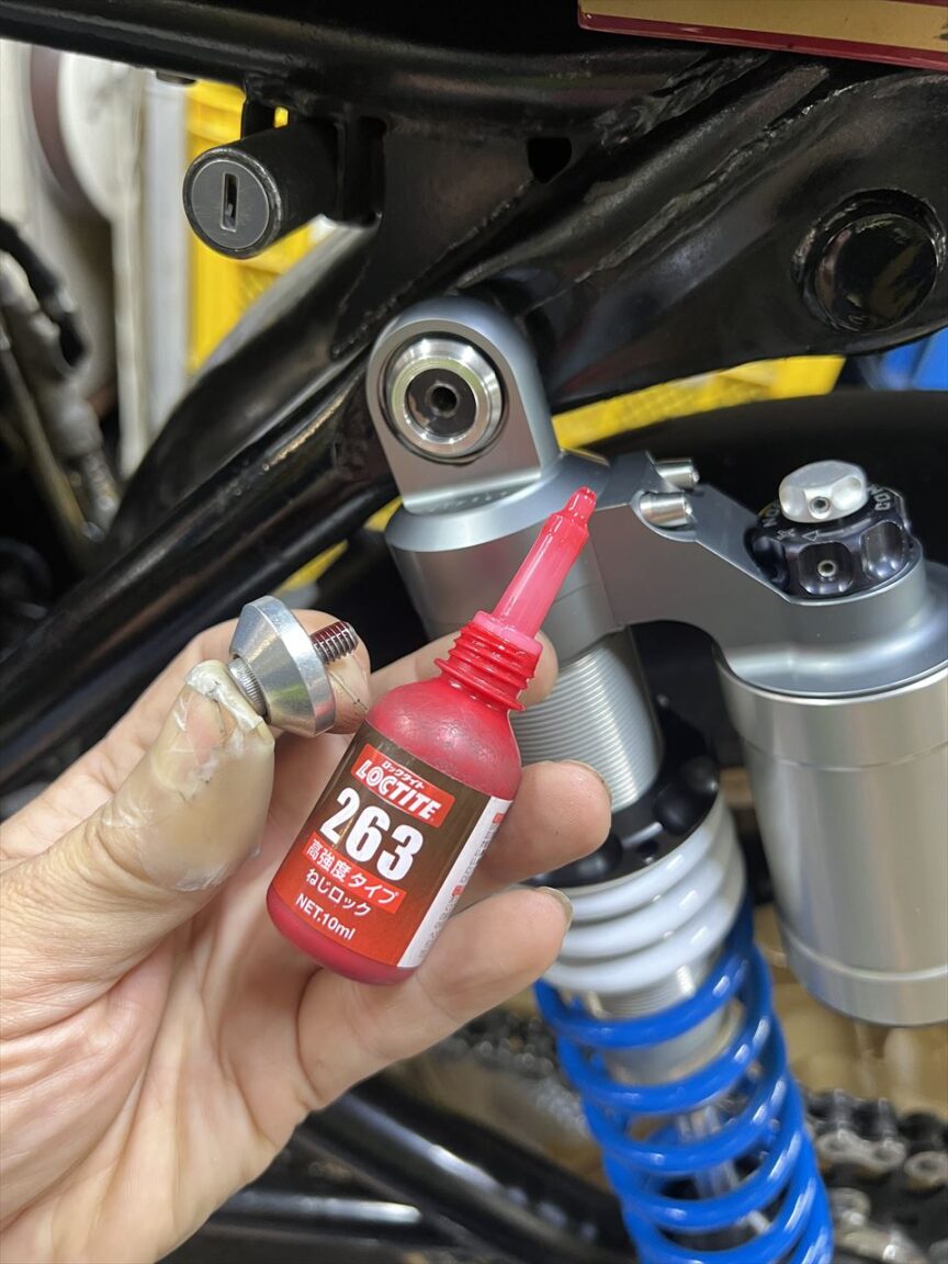 レイダウンされたアッパーマウントのネジは6ミリと細いので、取り付けはロックタイトを併用します。