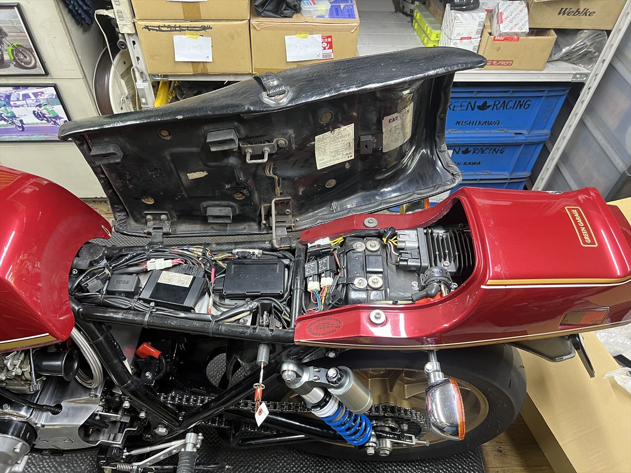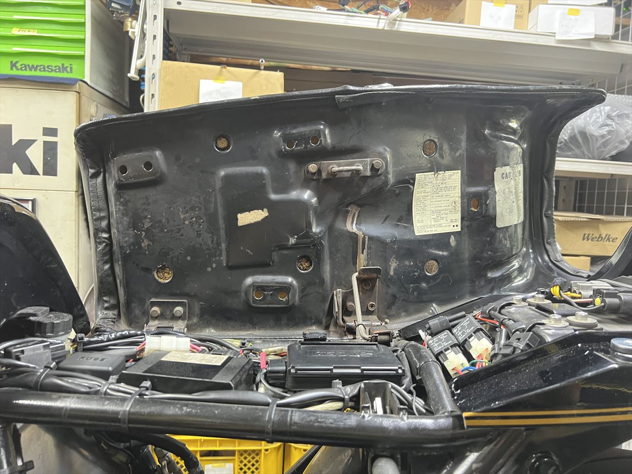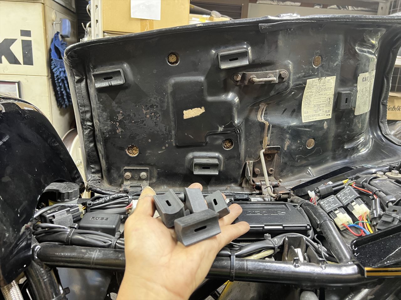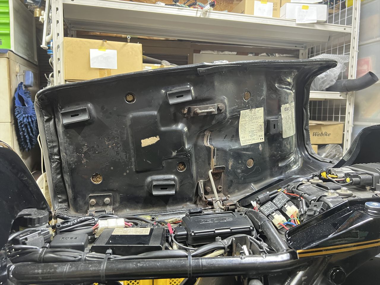 現状はスカチューンなので、電装系はシート下とテールカウル内に全て収まっていますが、今回サイドカバー付きのノーマル外装仕様となるので、電装系はサイドカバー内に移設し、テールカウル内とバッテリー上部はラゲッジスペースとして確保します。