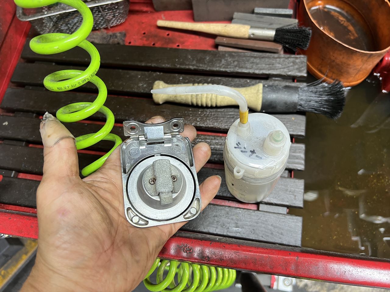 裏側にはガソリンの赤っぽい色が付いているので洗浄します。