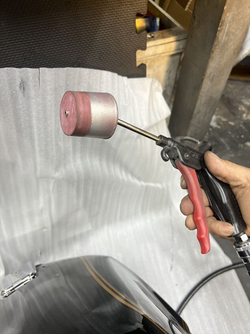 穴を開けたゴム栓からエアーを送り、これをキャップの穴にはめて切粉が内部に入らないようにします。