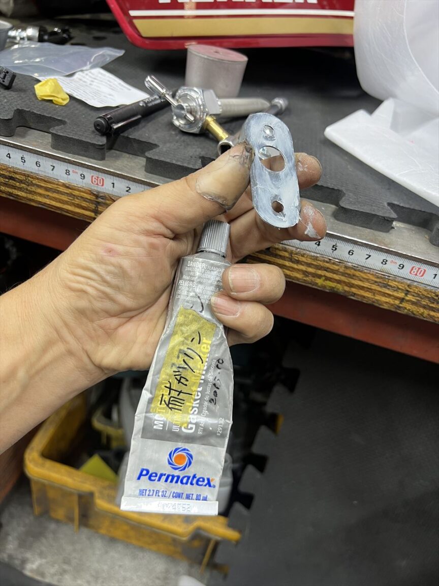 ガスケットに耐ガソリン性の液体ガスケットを塗布します。
