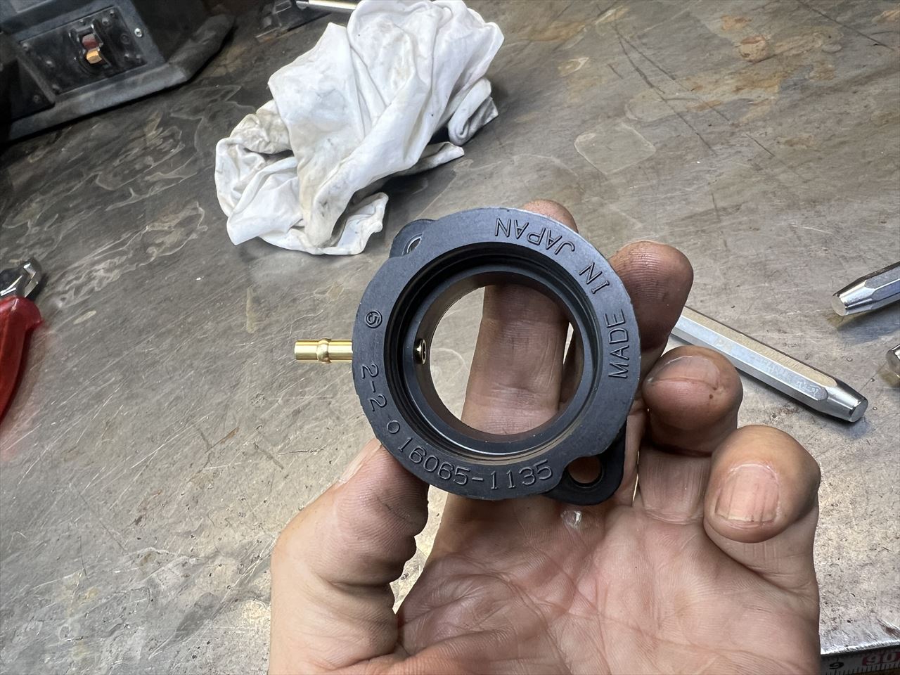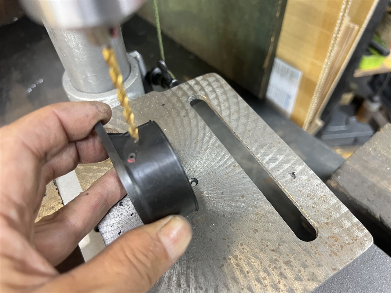 コックが純正の負圧式なので、キャブホルダーを加工して負圧取出しニップルを取り付けます。先ずは穴を開けます。