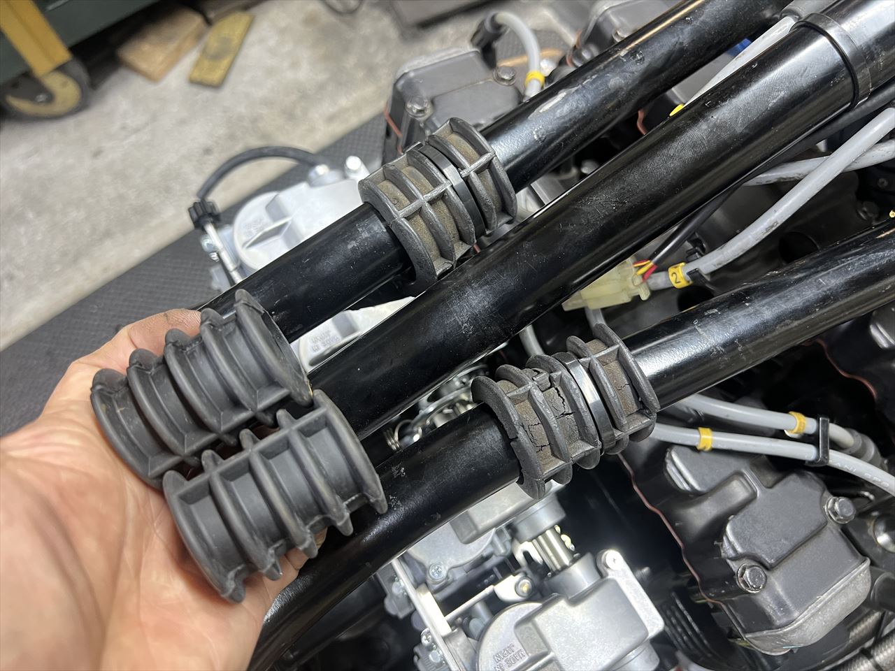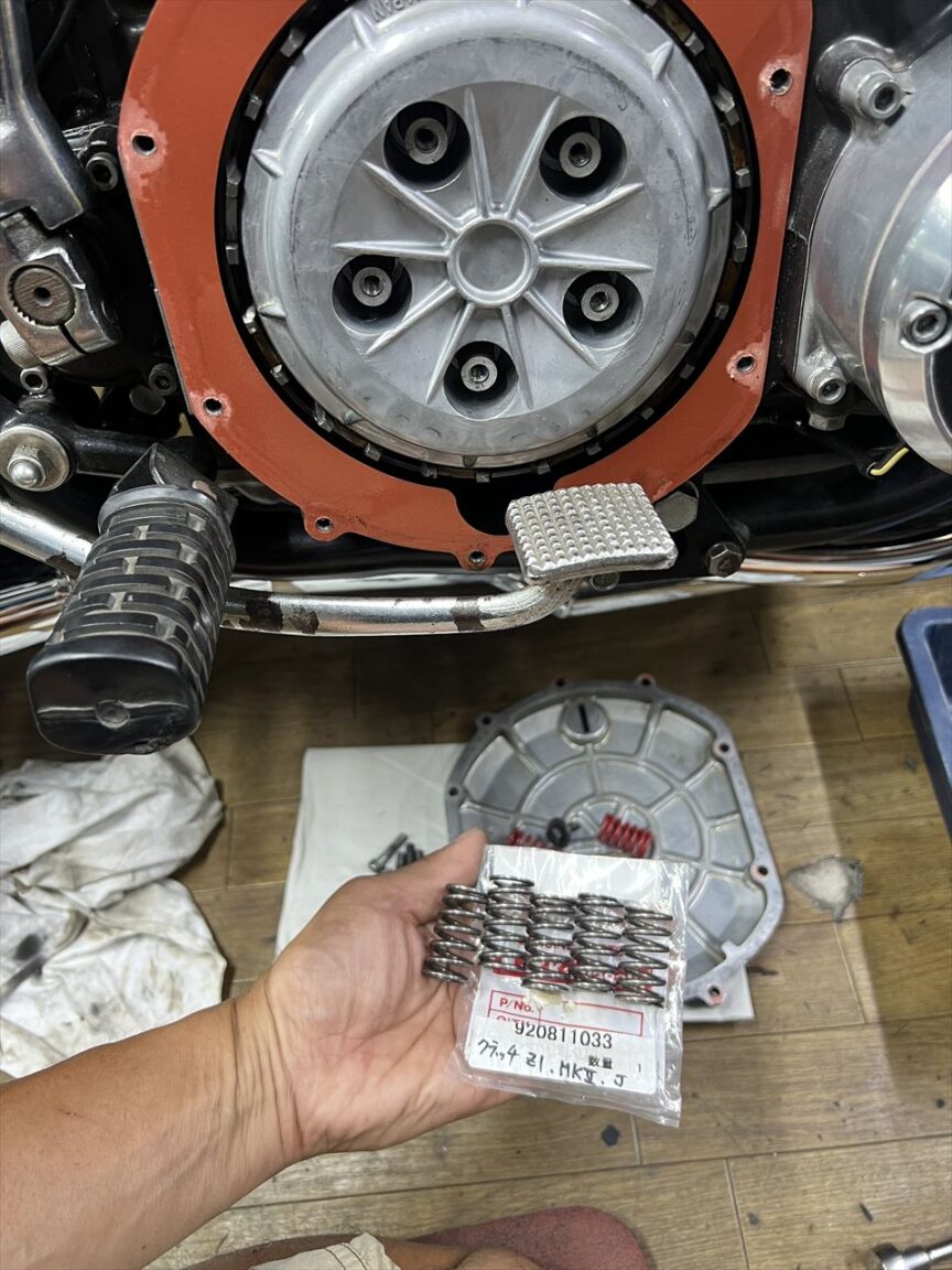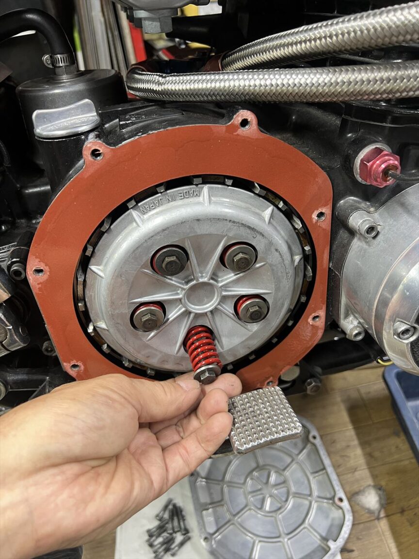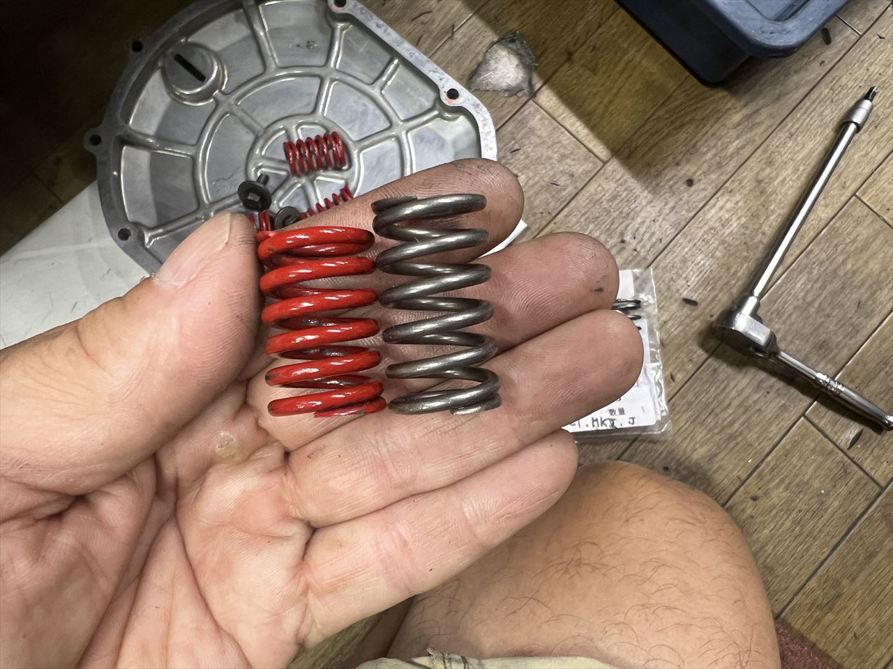スプリングは赤いノーマルでした。エンジンは860ccになっており、CRキャブで更にパワーが出たのでクラッチが滑ったもよう。