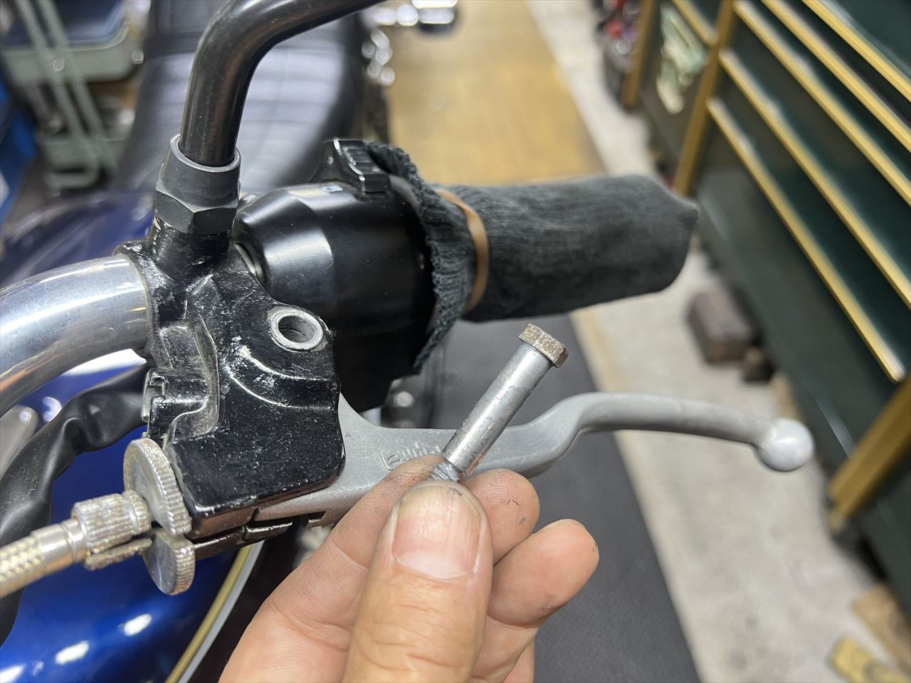 先のチェック走行でクラッチレバーの操作が渋かったので分解点検します。レバーの軸は乾燥していますね。