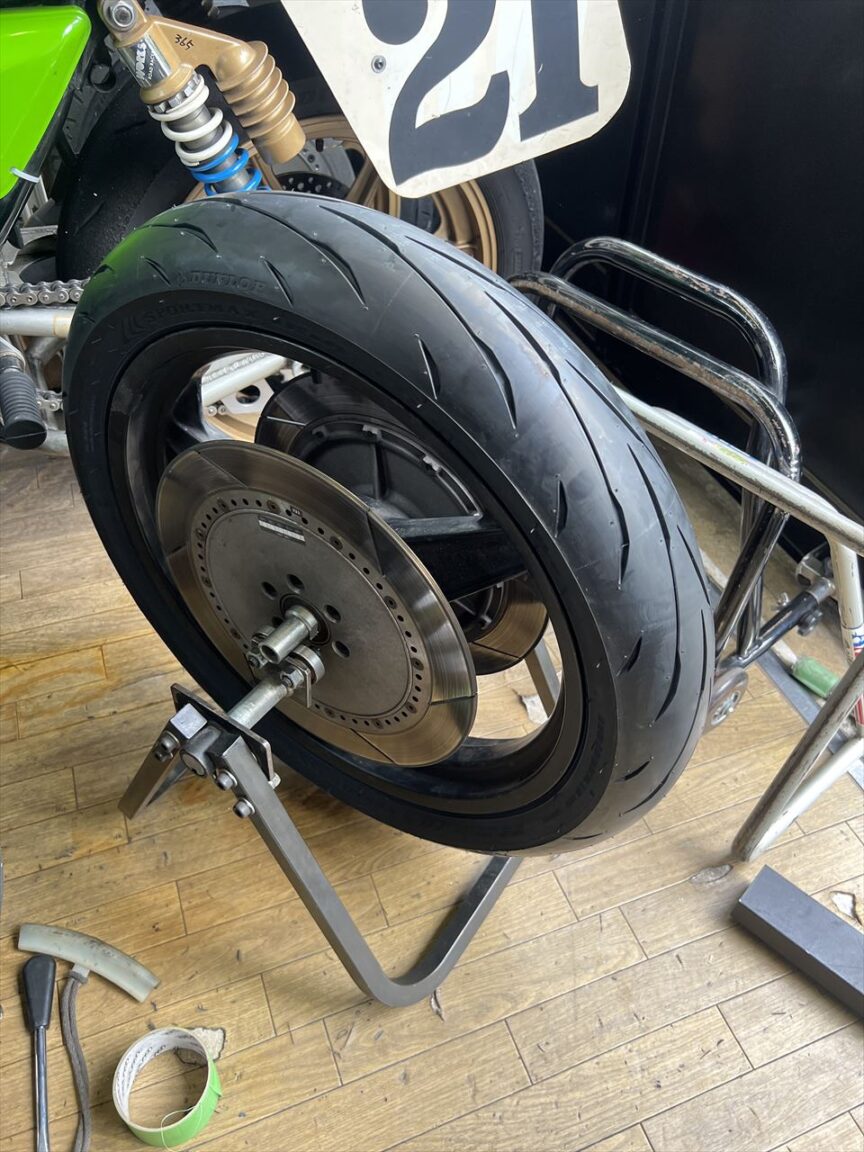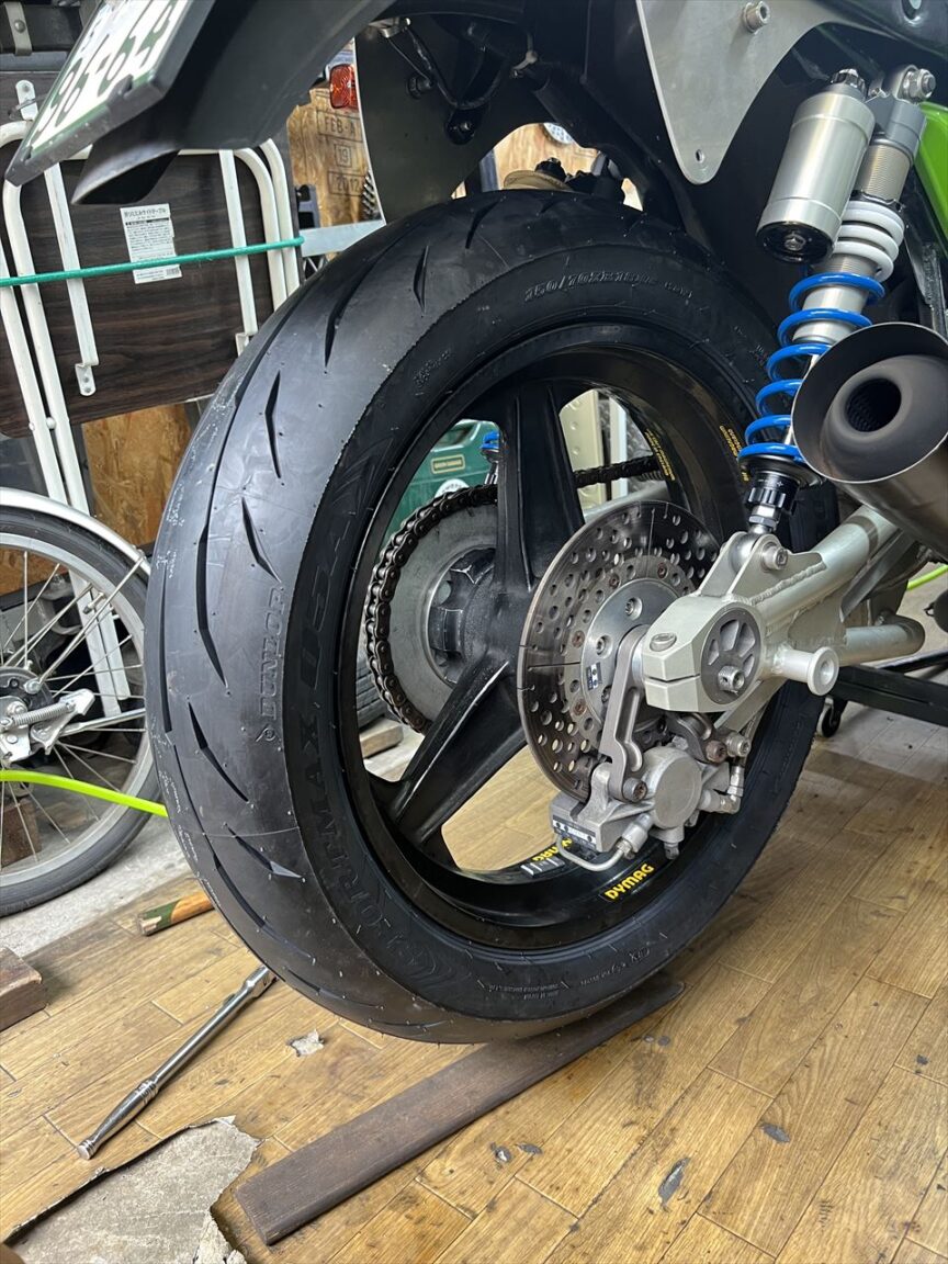 タイヤは今回初めてダンロップのQ5A(キュー・ファイブ・エー)を使います。アルファー14が廃盤となったので、リヤの70扁平ハイグリップ系タイヤとしてこちらが後継となるようです。メーカーでの位置づけは、スポーツツーリング向けのロードスマート4よりスポーツ走行向けですが、サーキット用ほどハイグリップではないもよう。サイズは110/80-18 150/70-18です。