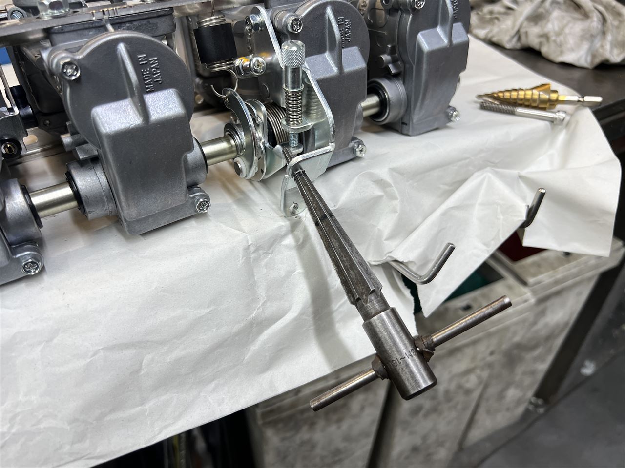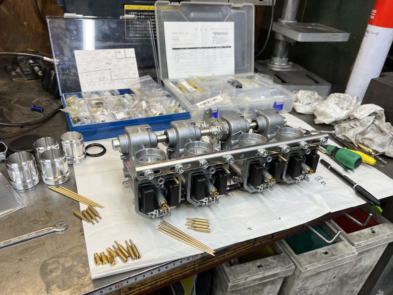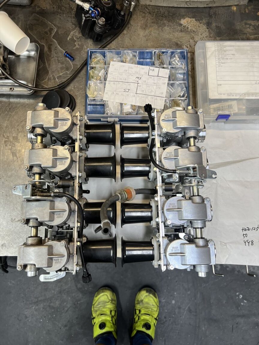 キャブセッティングに向かいます。バイパスポートがあるので通常のCR33とはスロージェットの番手が大きく異なりますが、あとは基本的ほぼ同じです。