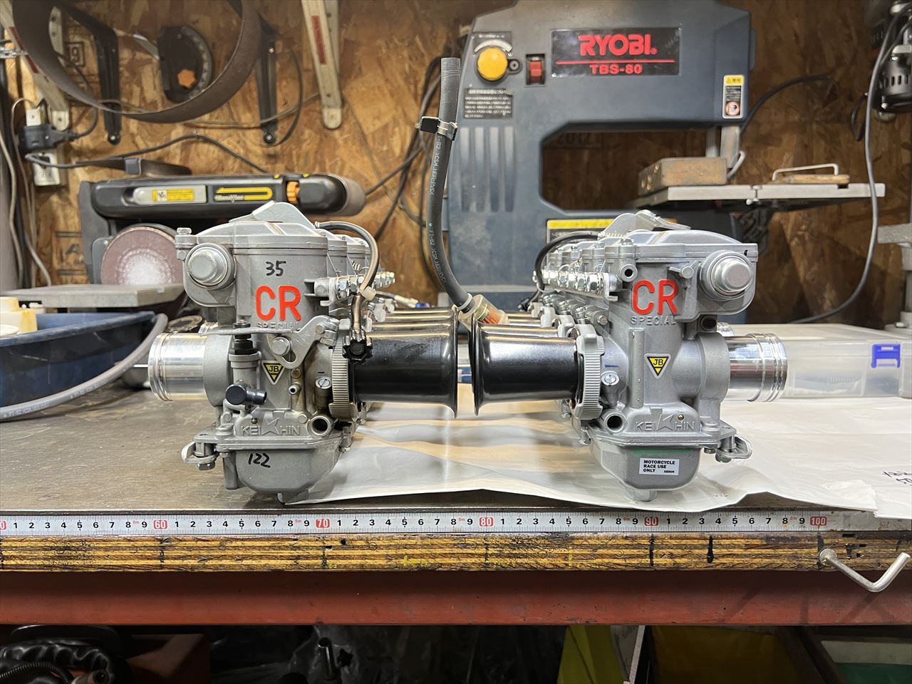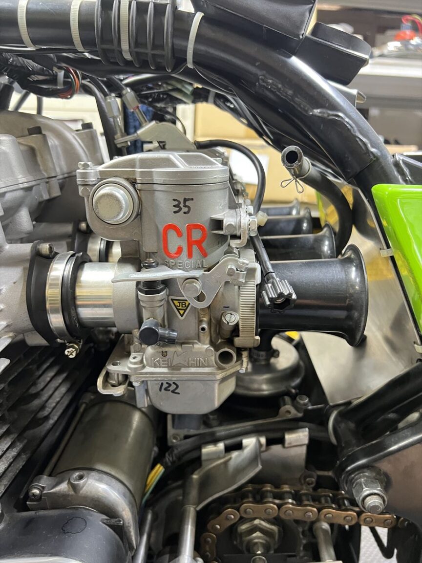 現状のキャブはCR35です。CR33より全域でわずかにパワーは上がりますが、ボディーが大きいので搭載性が悪くなり、スロットルも更に重くなるなど、デメリットもあります。当時風の外観でパワー重視の方は試す価値ありますが、オールマイティーなのはやはりCR33ではないでしょうか。そこで今回の仕様変更となりました。