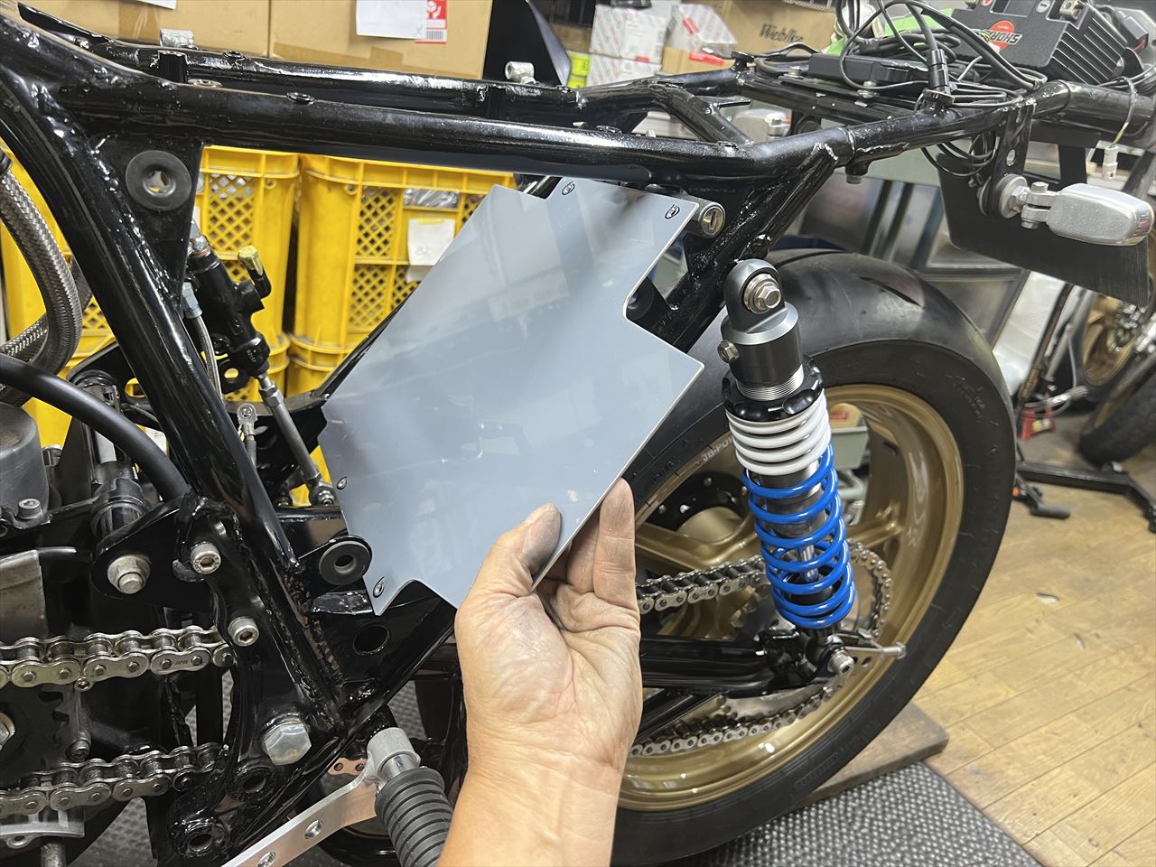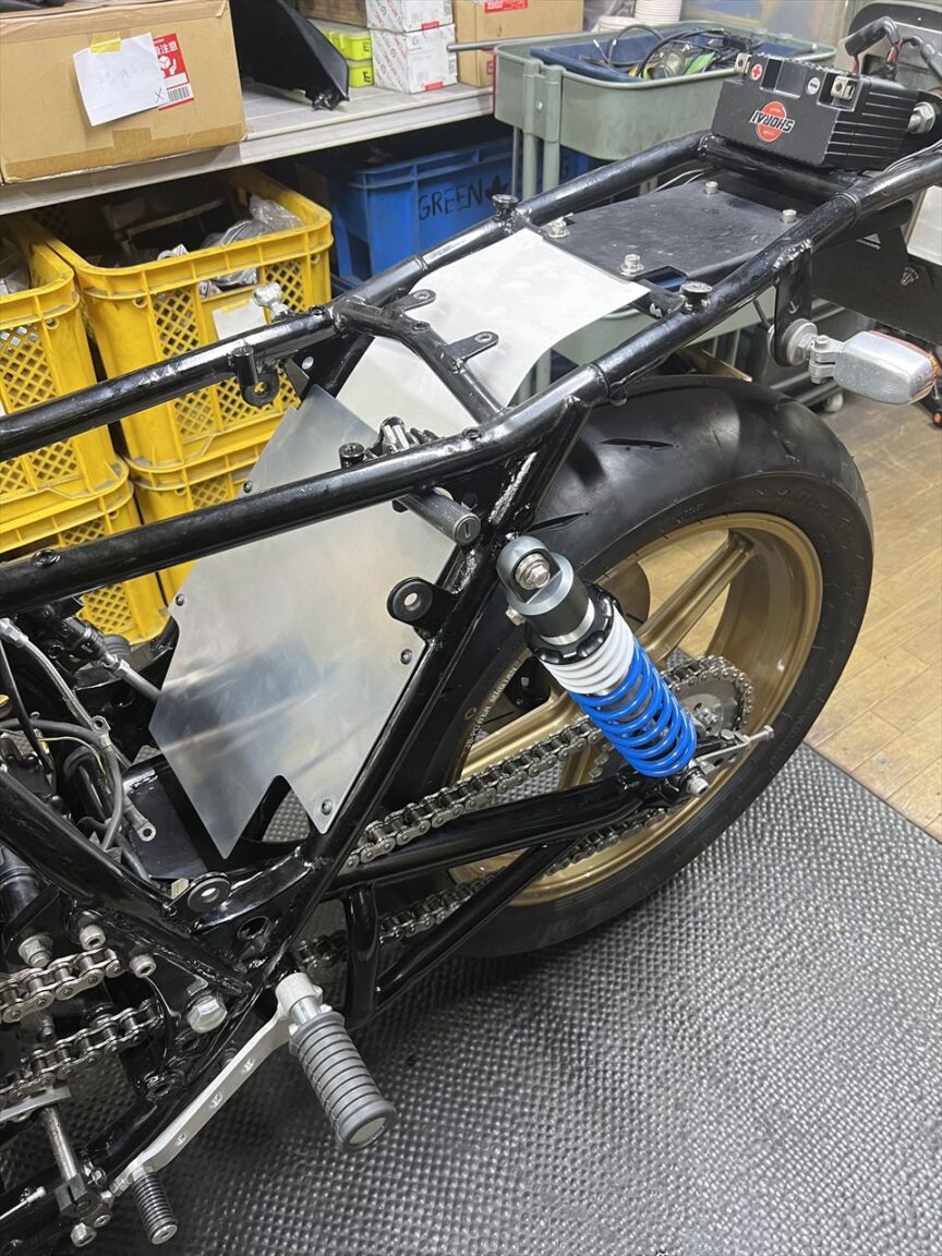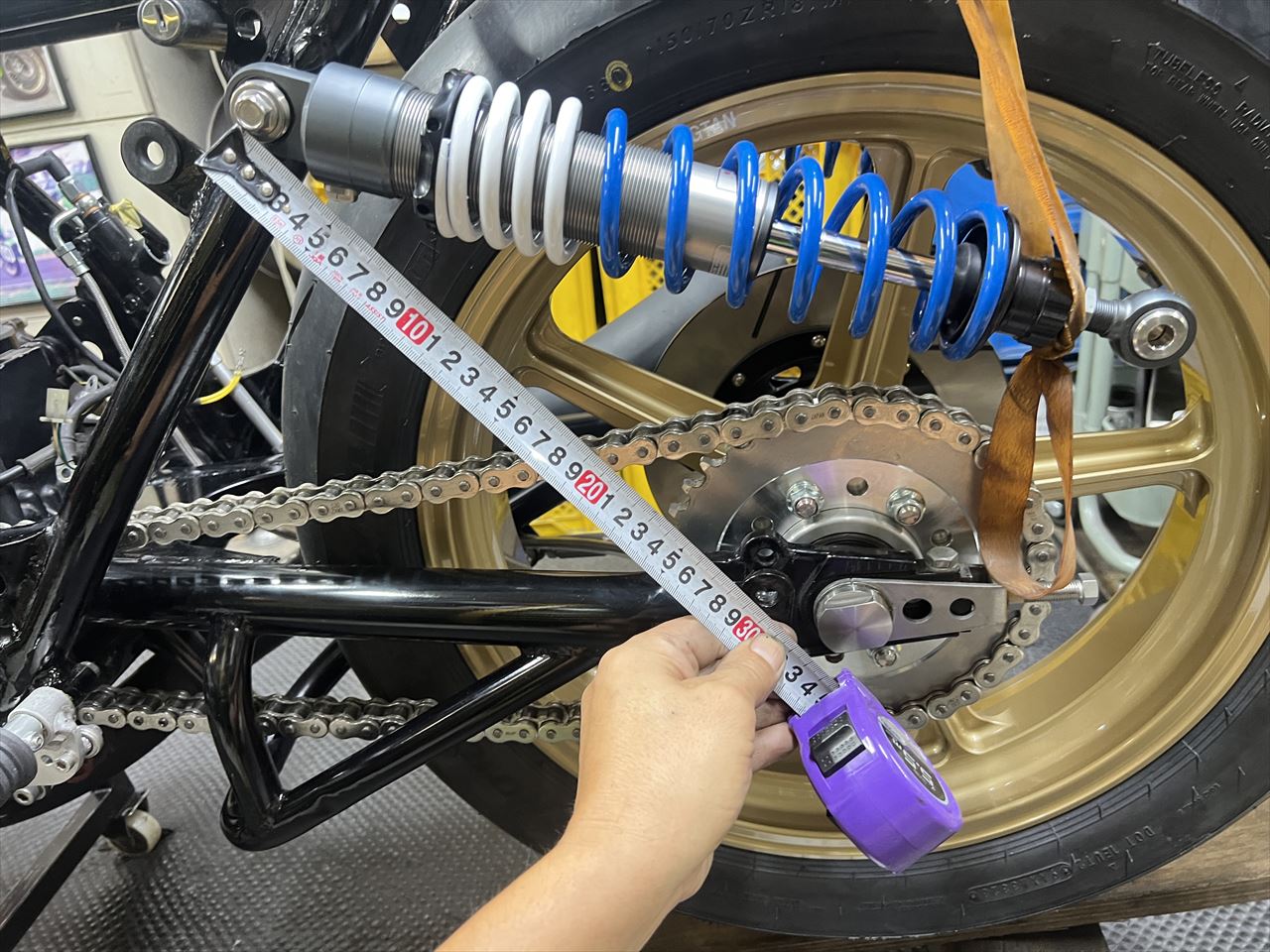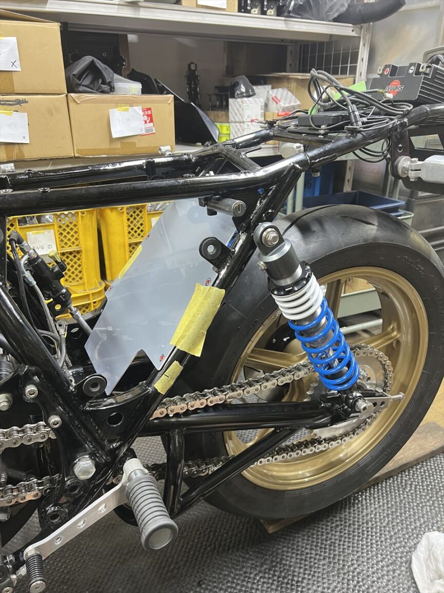 続いてリヤのインナーフェンダーを製作します。先ず条件の確認、リヤショックのフルボトム状態までスイングアームを持ち上げます。取り付け長からストローク分引いた距離にすればOKです。