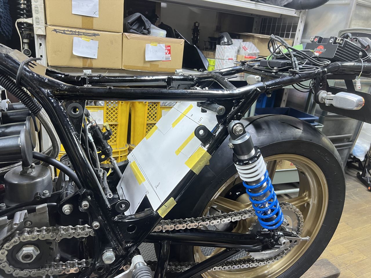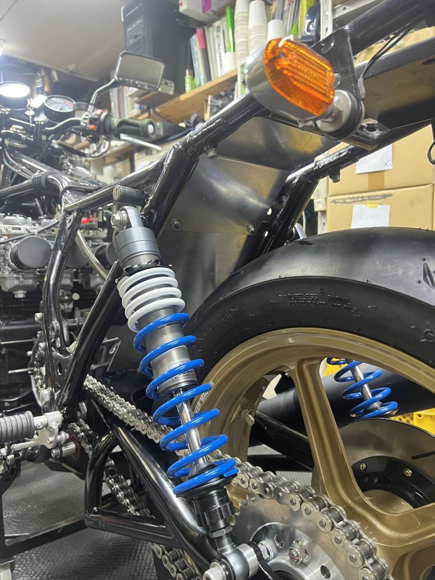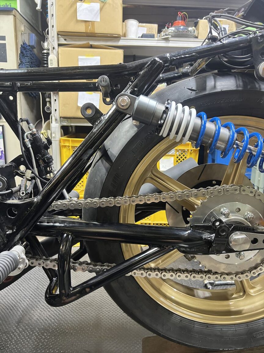 フルボトムだとここまでタイヤが上がってきます。150/70タイヤだとリヤショックの付いているダウンチューブより内側にタイヤが入ることがわかります。