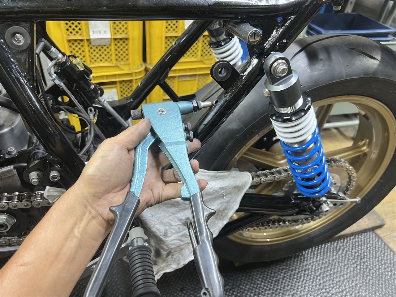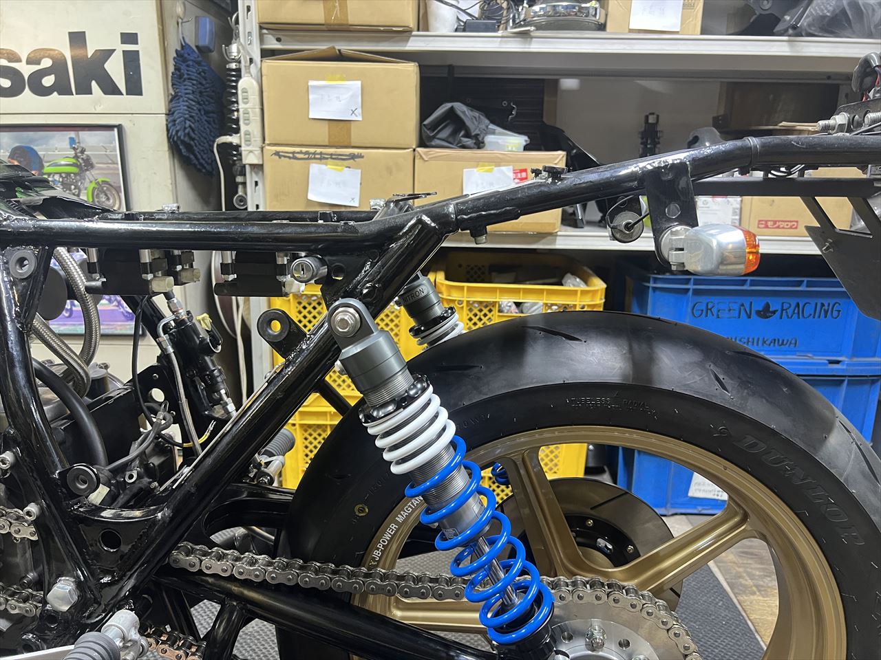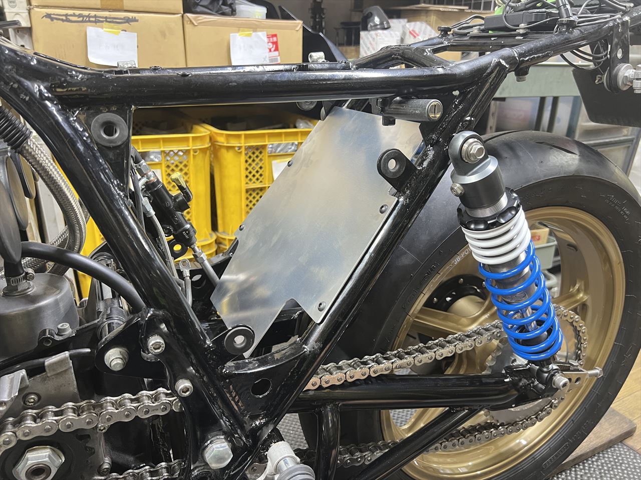 フルボトムだとここまでタイヤが上がってきます。150/70タイヤだとリヤショックの付いているダウンチューブより内側にタイヤが入ることがわかります。