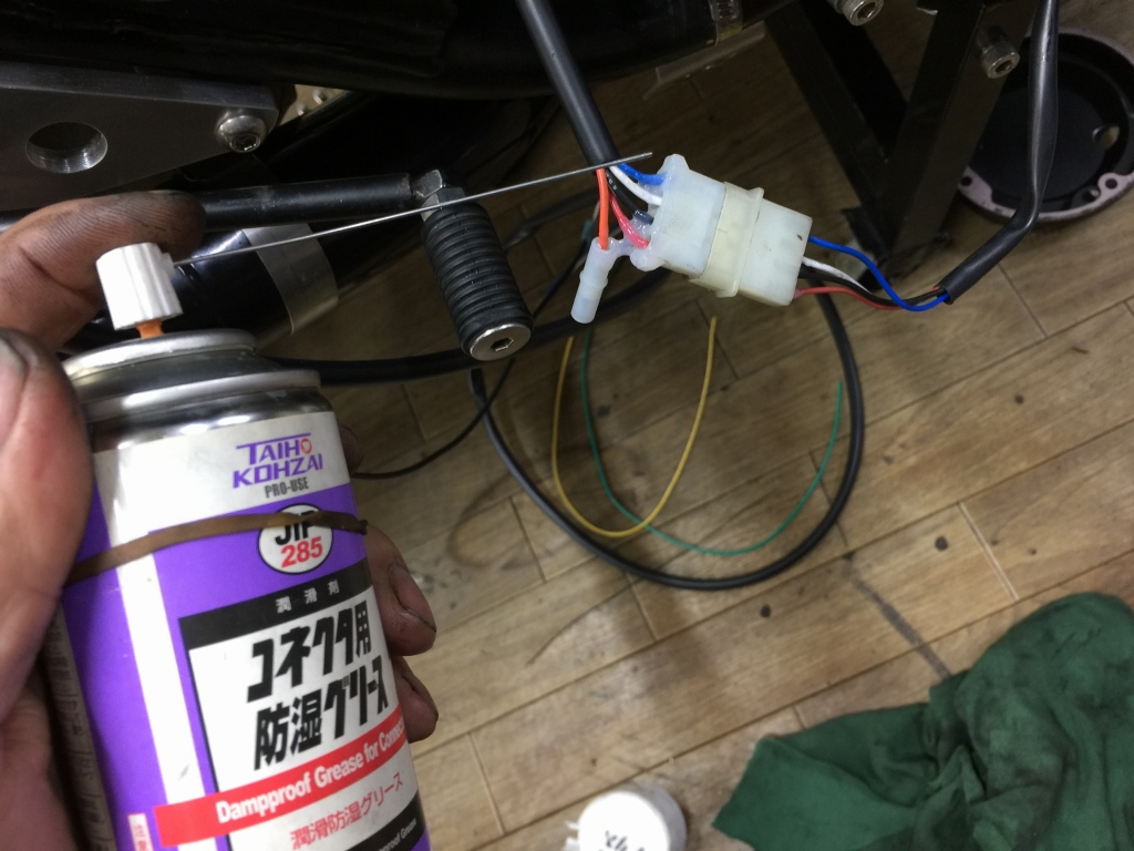 ピックアップコイルハーネスのカプラーは割とオープンなので、湿気で接触不良が起き難いよう防湿グリースを塗布しておきます。