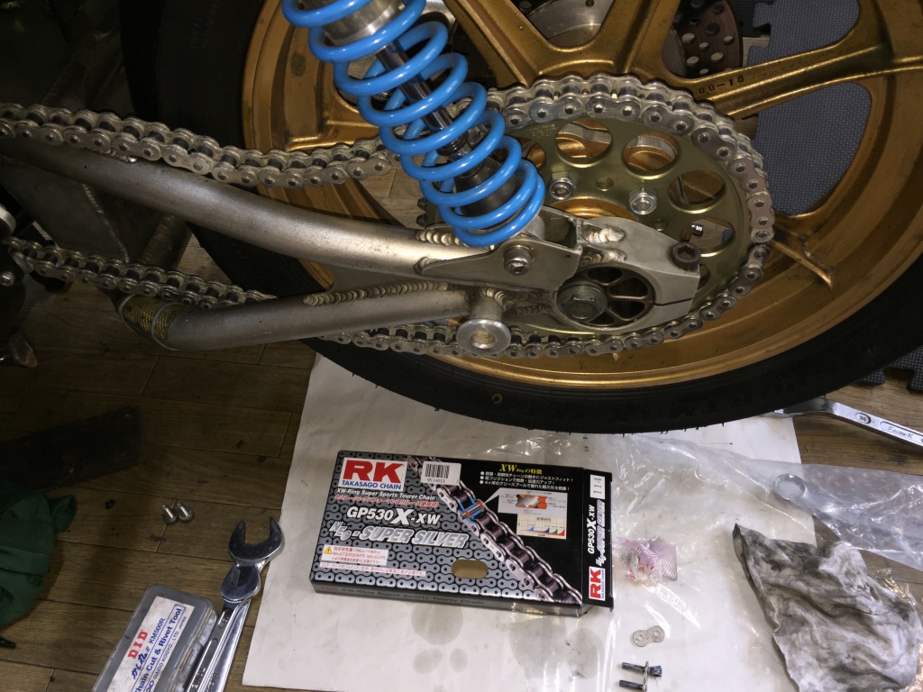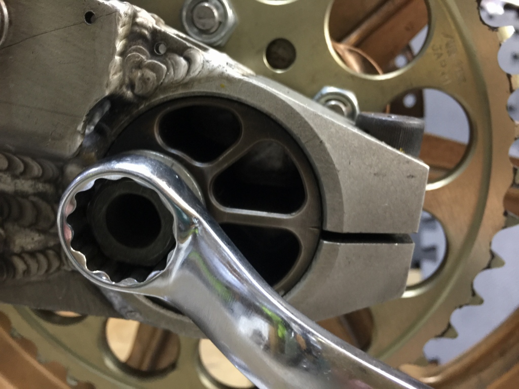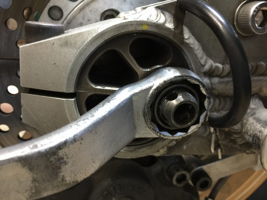 チェーン調整前には、エキセントリックを回して左右の位置合わせをしておきます。