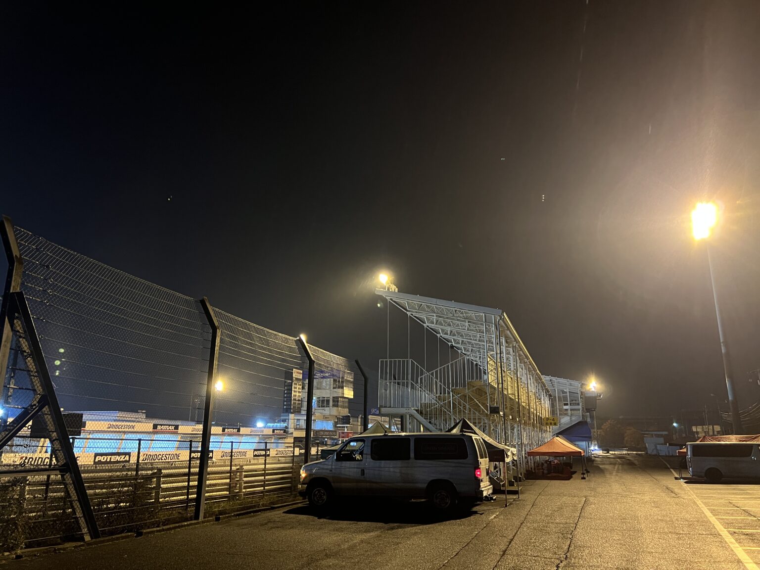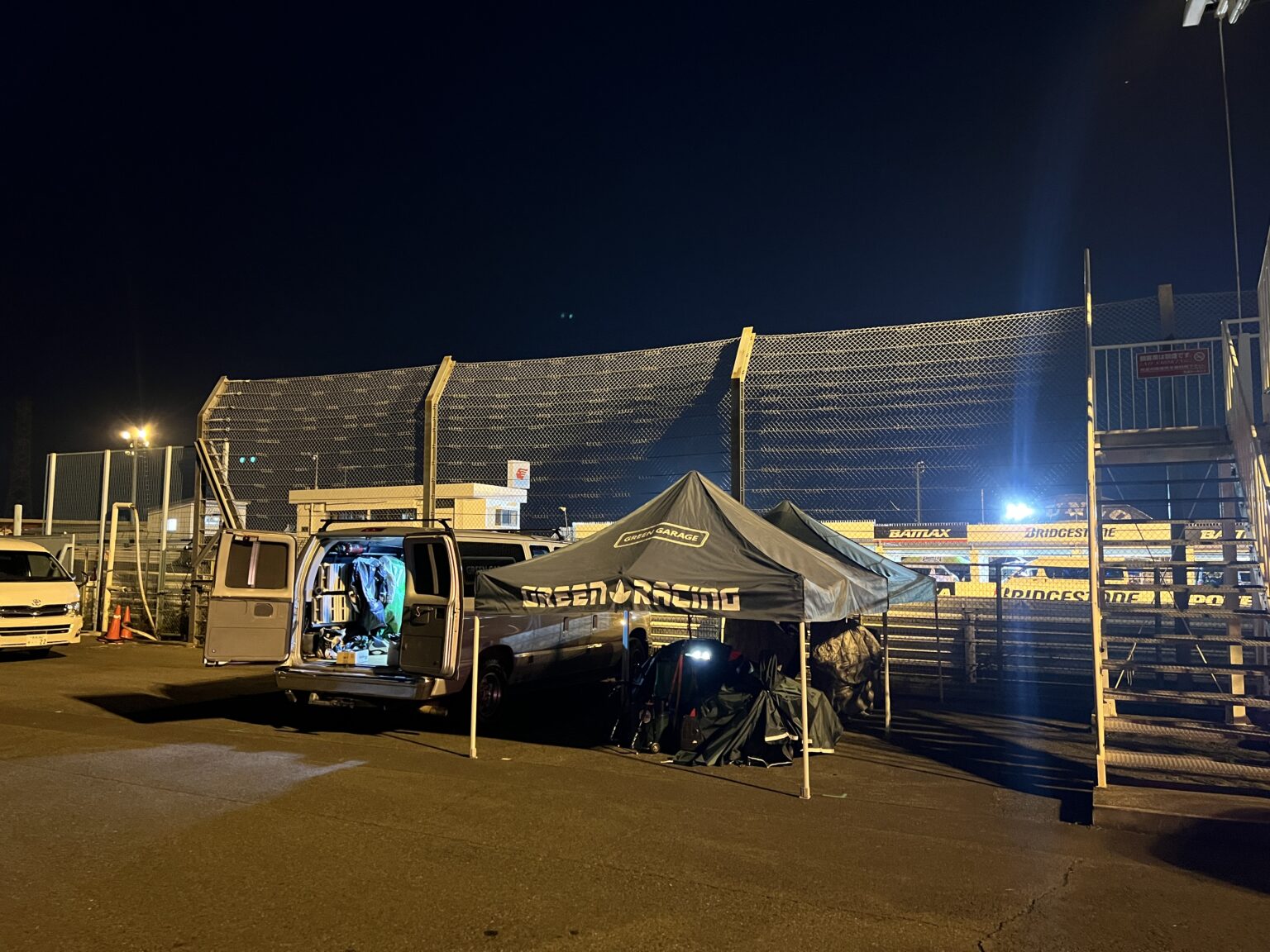 夕方にはチームテントを設営。日が落ちるのも早くなり、終わるころにはすっかり暗くなりました。このあとサーキットは一晩中準備のために照明が付けられています。