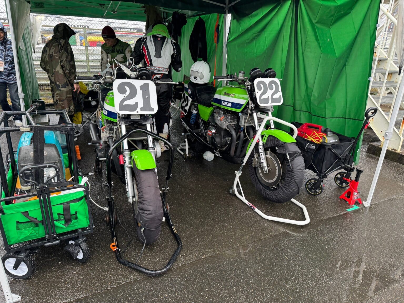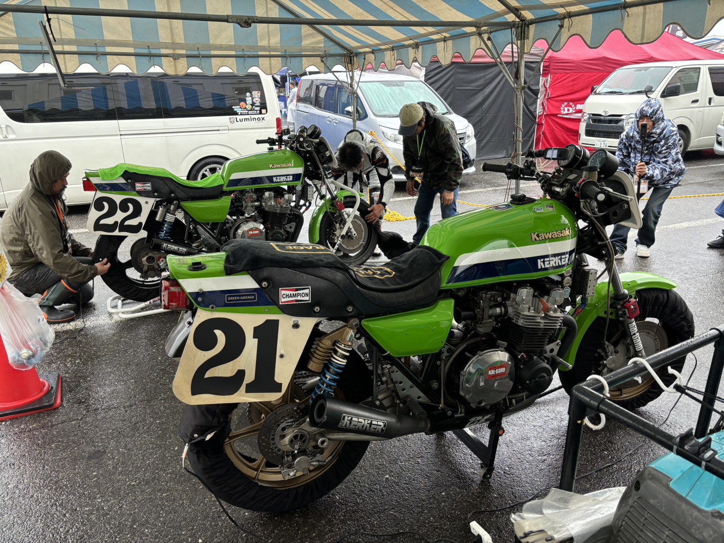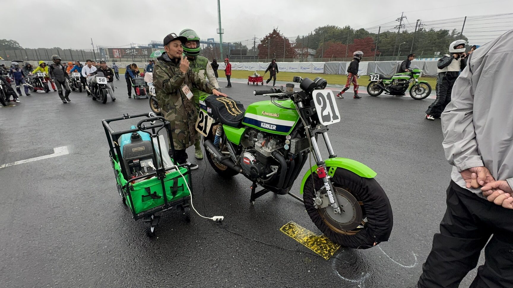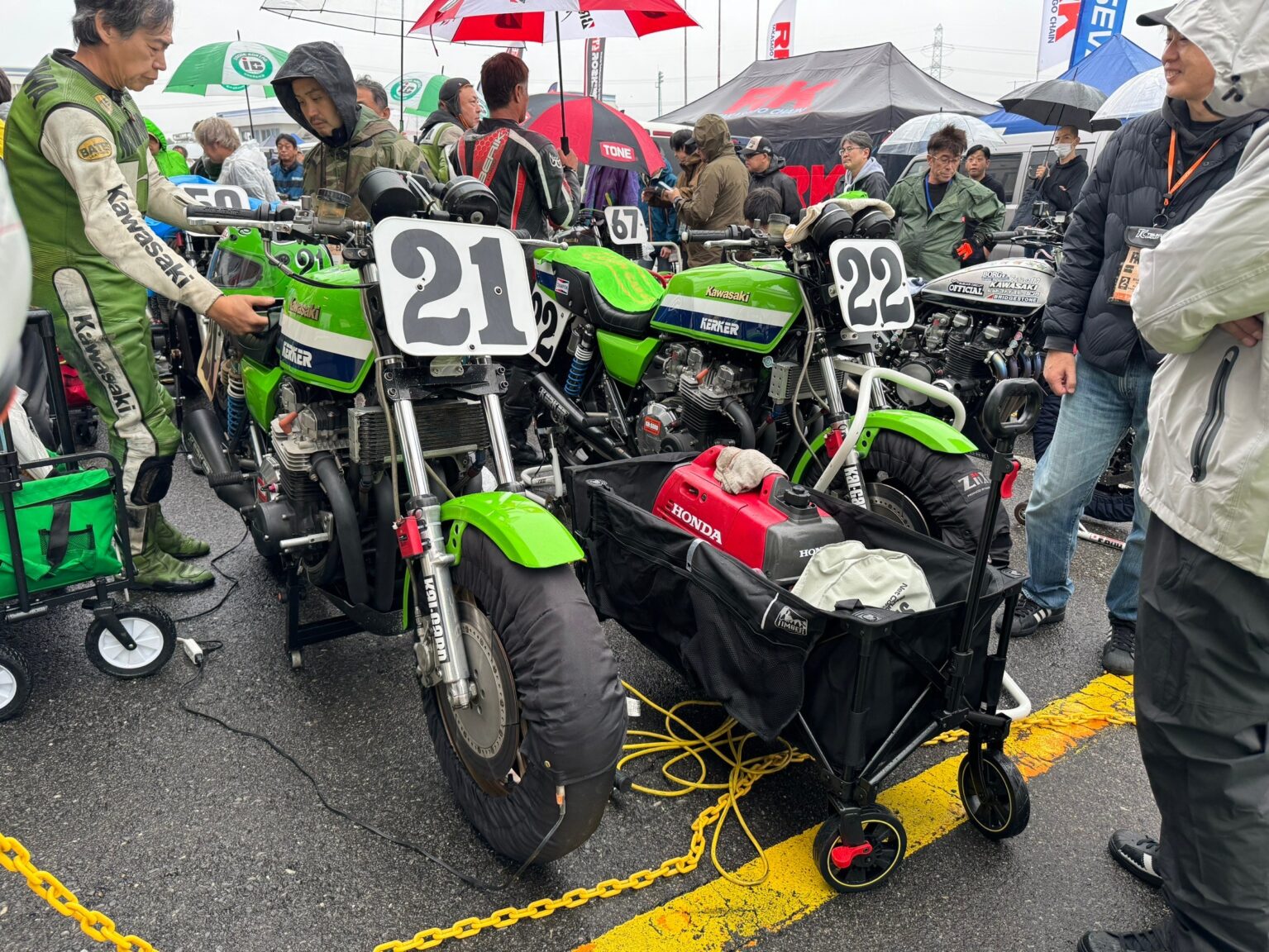 午後の決勝前、ウォームアップ場でエンジンを暖気します。雨は弱くなったり強くなったりの繰り返し。